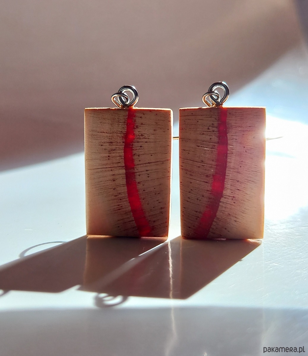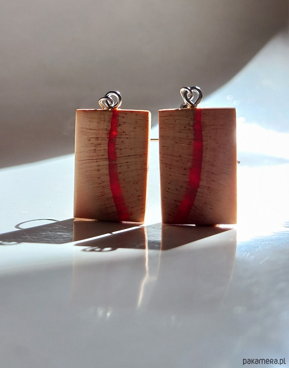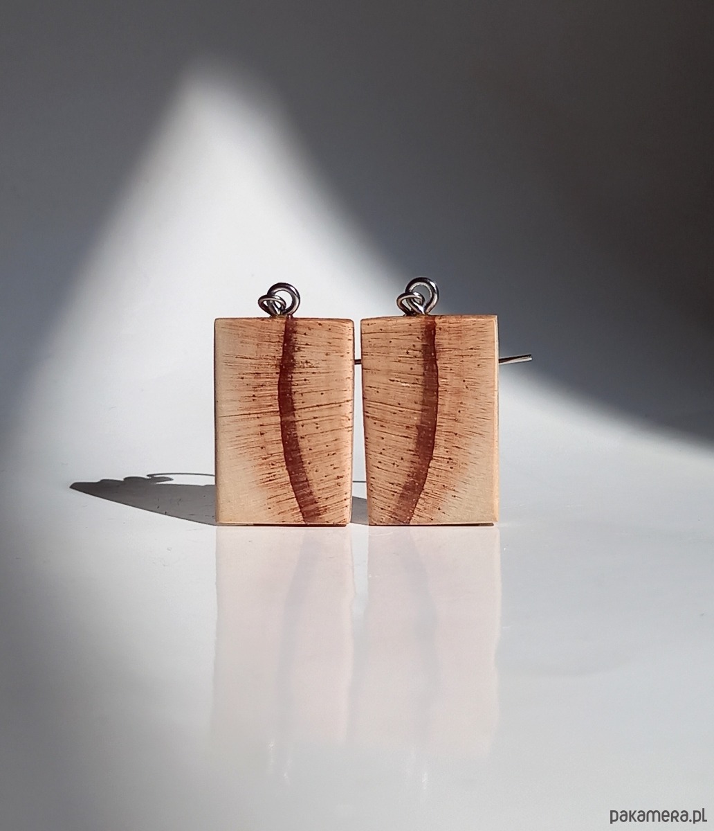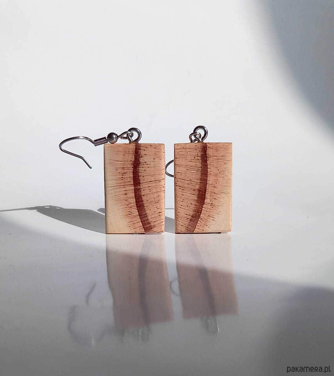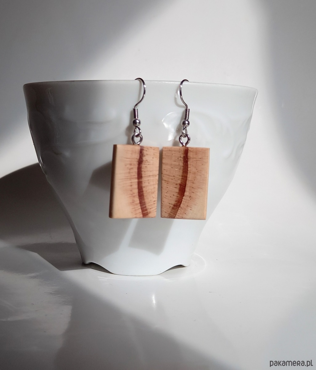 Długość całkowita kolczyków z biglem 4,5 cm. Wymiary części drewnianej: wys. 2,4 cm, szer. 1,6 cm, grubość 4 mm.