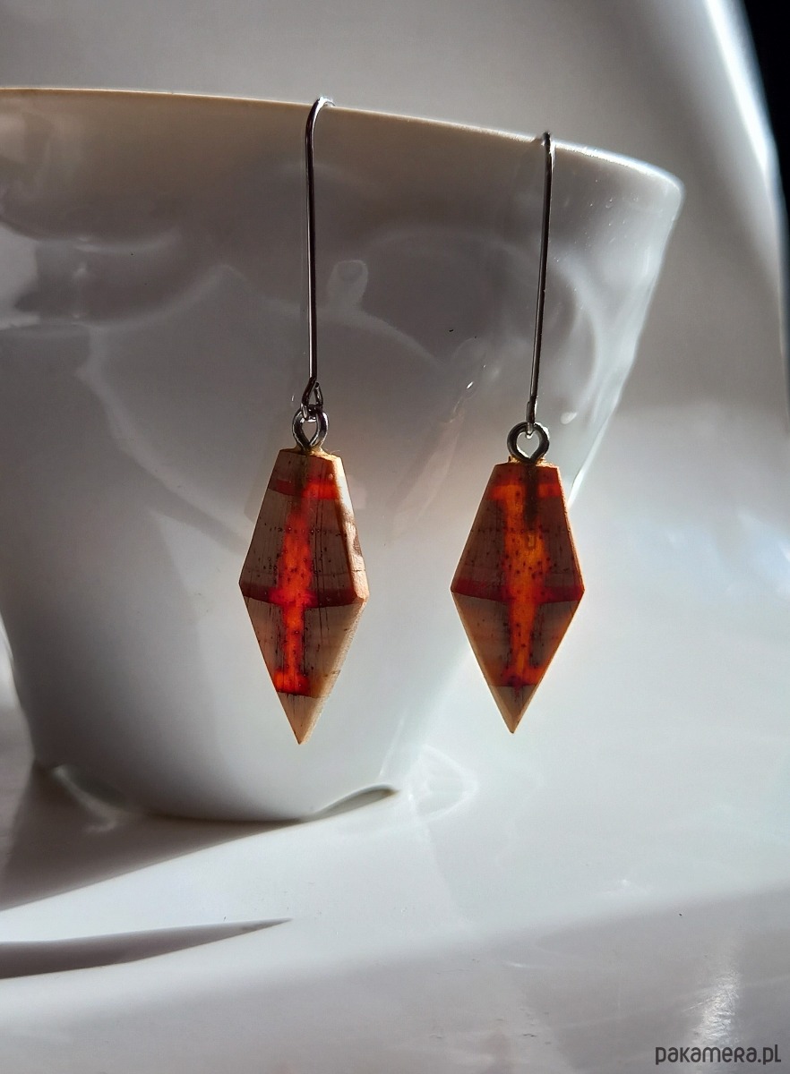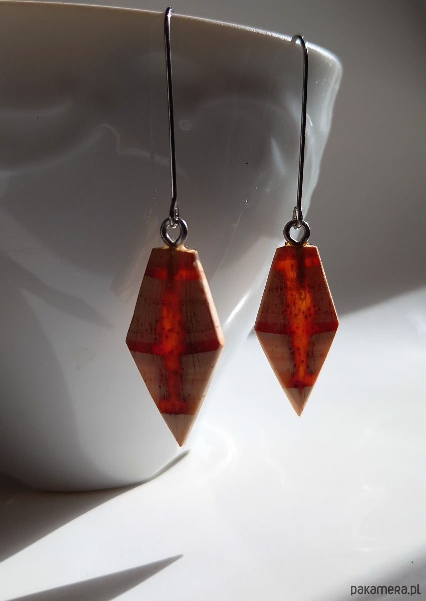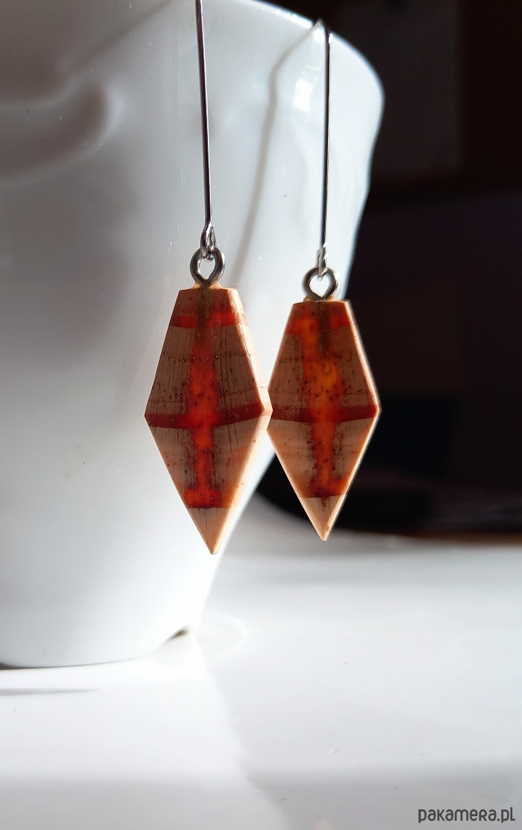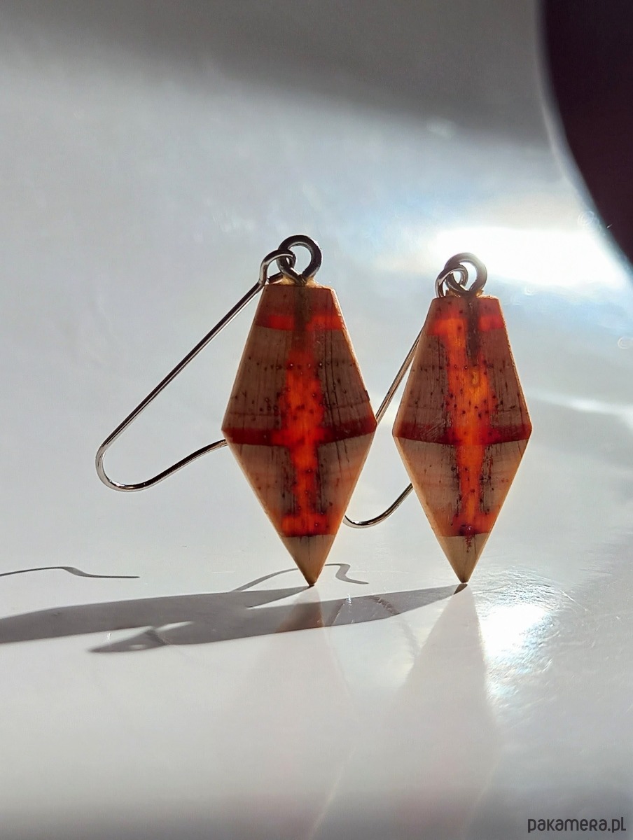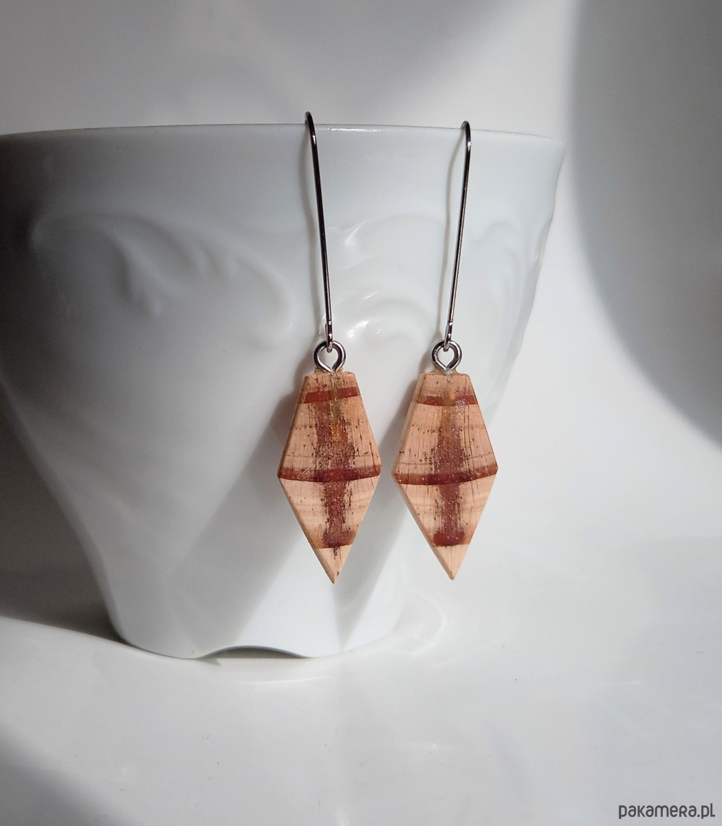 Kolczyki zrobione zostały z wyjątkowego, egzotycznego drewna. Piękny, naturalny rysunek słoi oraz prześwitująca część, która wyglądają pod światło jak bursztyn sprawiły, że są wyjątkowe i niepowtarzalne. Zabezpieczone zostały naturalnymi woskami i wypolerowane - bez lakieru. Leciutkie, delikatne i aksamitnie gładkie.