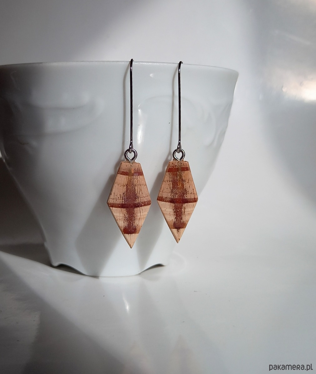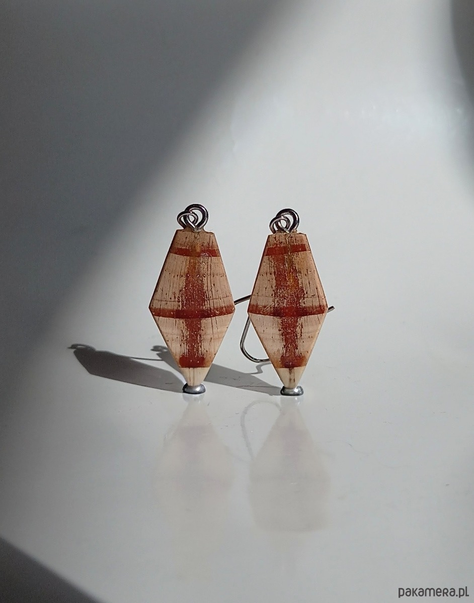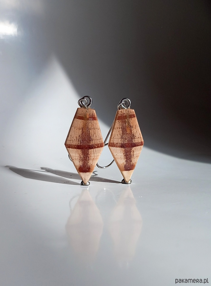 Długość całkowita kolczyków z biglem 5,6 cm. Wymiary części drewnianej: wys. 2,6 cm, szer. 1,3 cm, grubość 2 mm.
