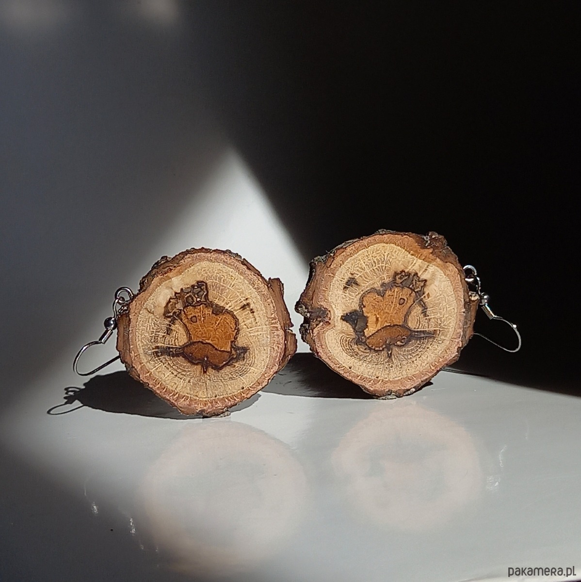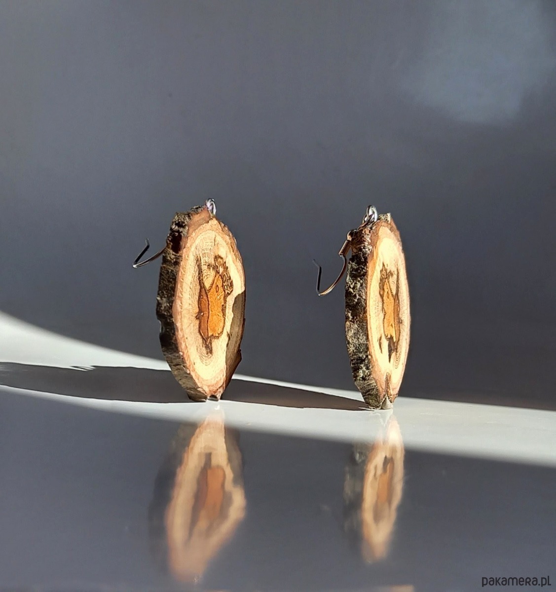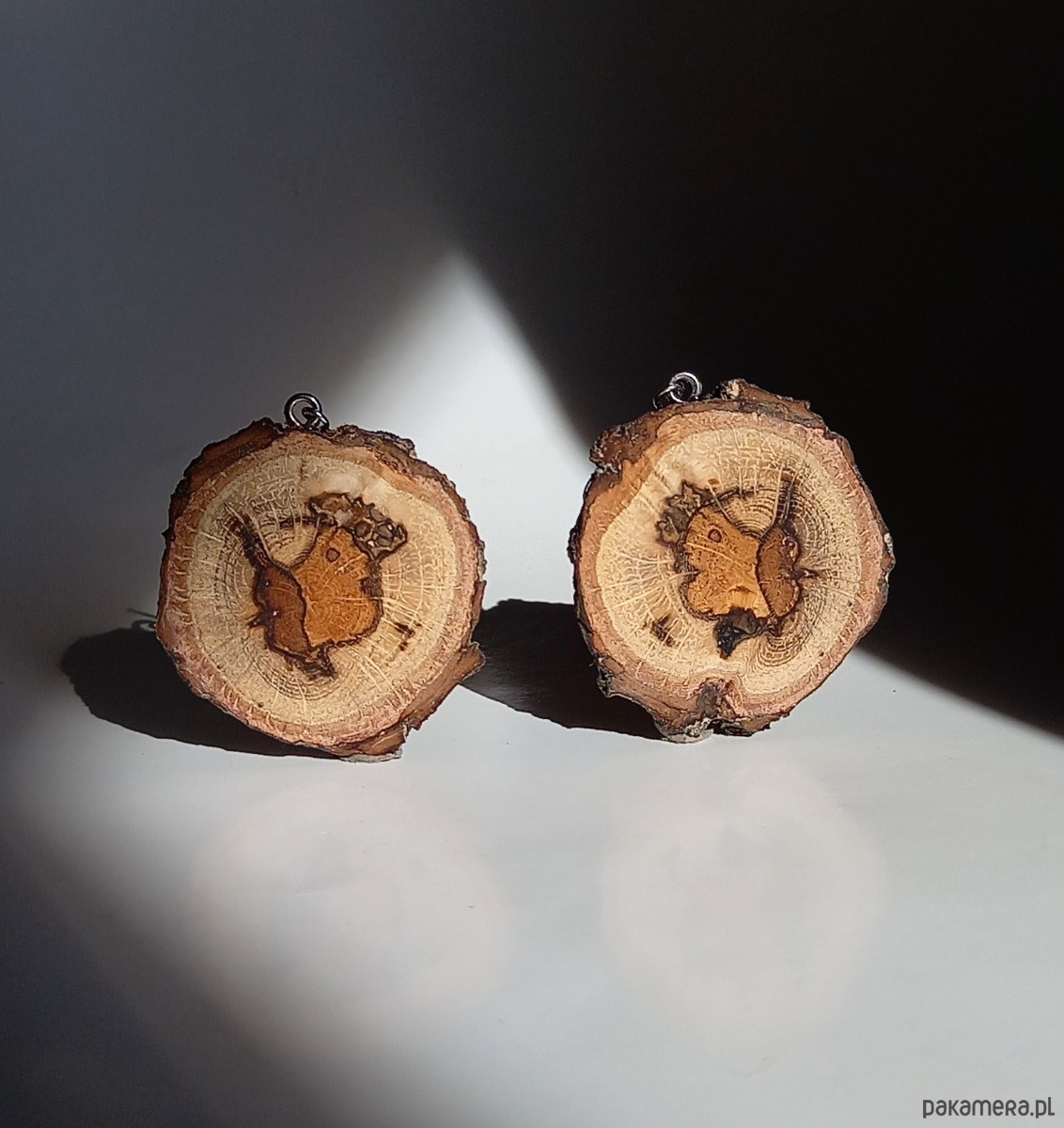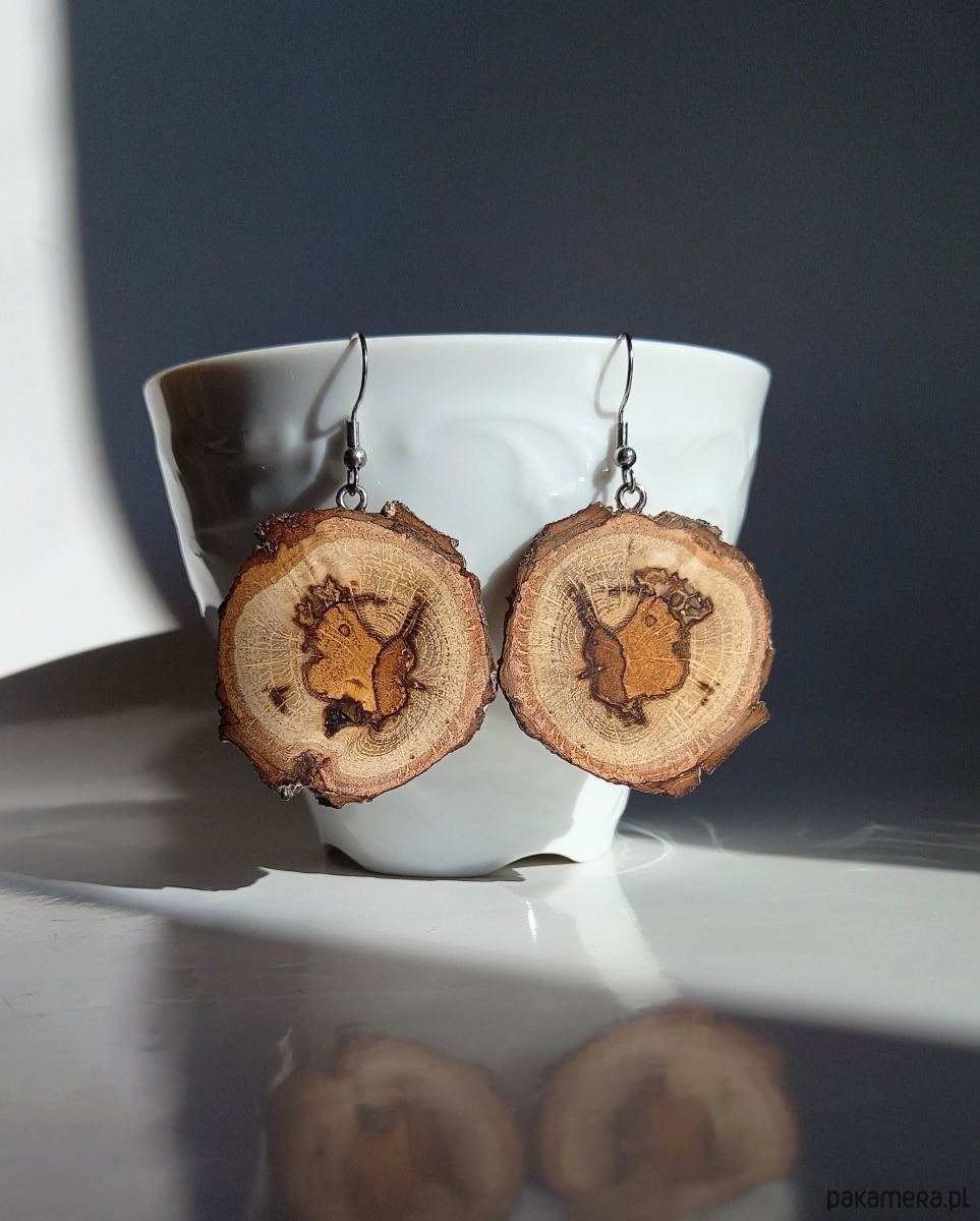 Kolczyki zrobione zostały z drewna dębu. Pozostawienie kory i wyjątkowy rysunek namalowany przez przyrodę sprawił, że kolczyki są unikatowe. Na drewnie są naturalne przebarwienia, kolczyki nie są malowane. Wielokrotnie nacierane naturalnymi woskami i wypolerowane. Bigle ze stali chirurgicznej. Kolczyki są bardzo lekkie. Znakomicie będą pasowały do letniej stylizacji jak i do grubego swetra, a swoją naturalnością i oryginalnością z pewnością będą przyciągały wzrok.