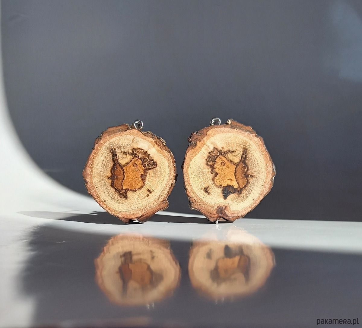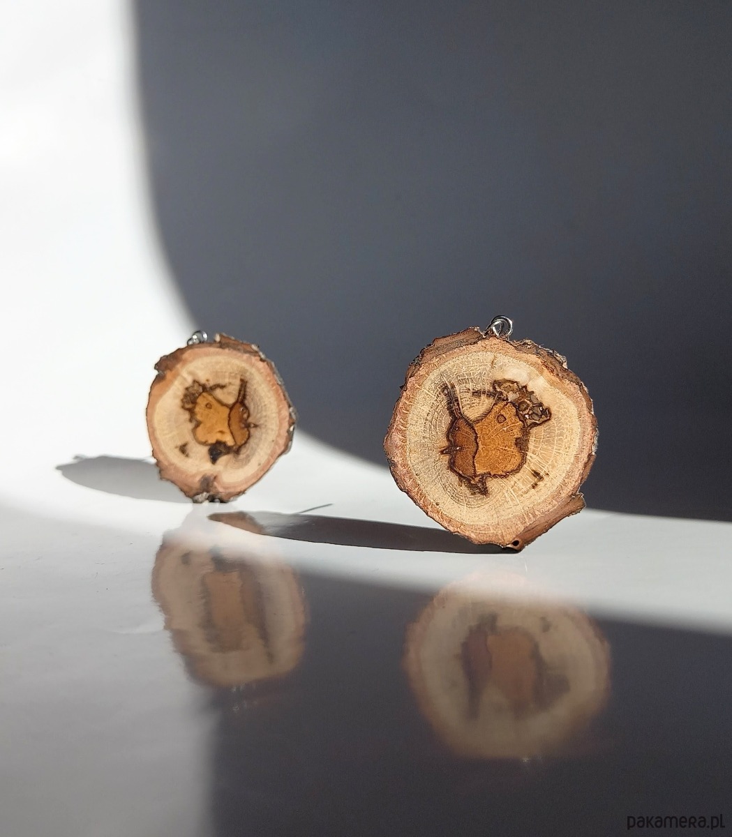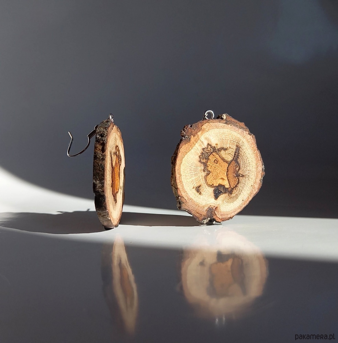 Kolczyki zrobione zostały z drewna dębu. Pozostawienie kory i wyjątkowy rysunek namalowany przez przyrodę sprawił, że kolczyki są unikatowe. Na drewnie są naturalne przebarwienia, kolczyki nie są malowane. Wielokrotnie nacierane naturalnymi woskami i wypolerowane. Bigle ze stali chirurgicznej. Kolczyki są bardzo lekkie. Znakomicie będą pasowały do letniej stylizacji jak i do grubego swetra, a swoją naturalnością i oryginalnością z pewnością będą przyciągały wzrok.