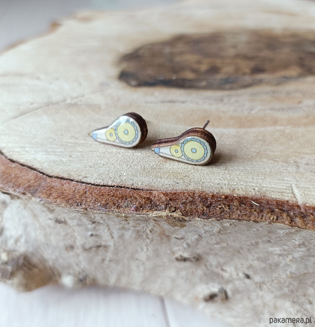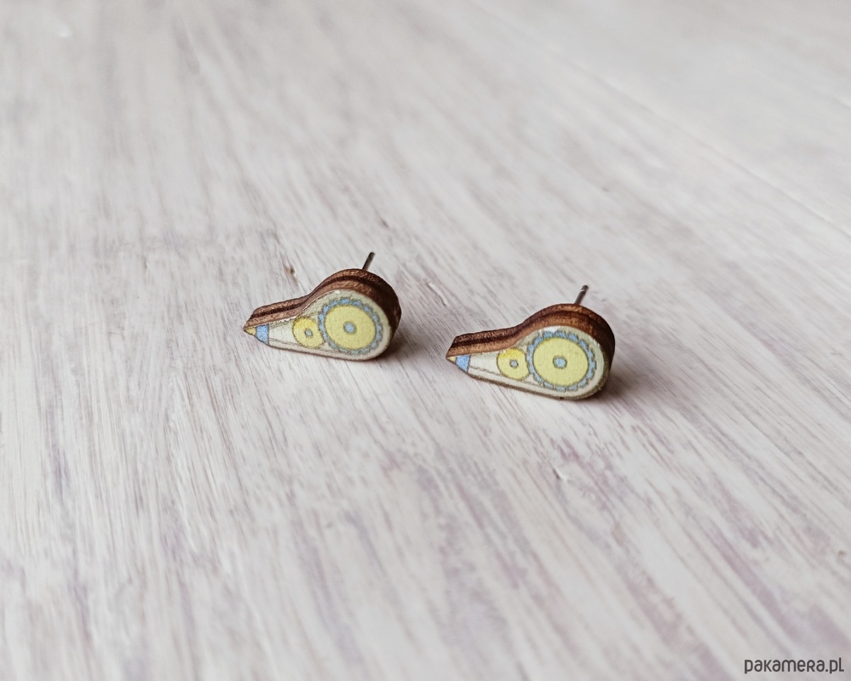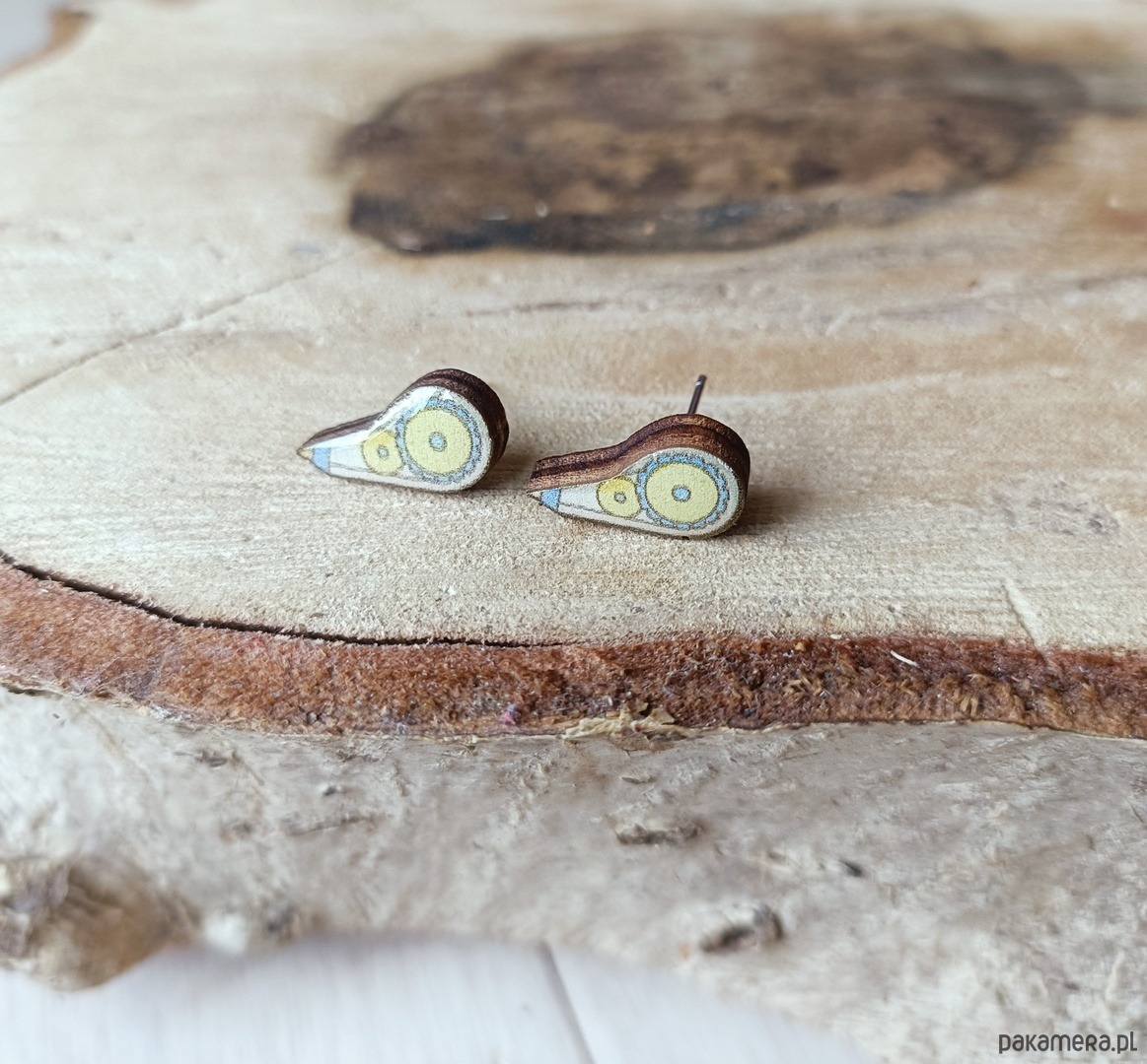 Kolczyki sztyfty ze sklejki z jednostronnym nadrukiem UV, pokrytym warstwą błyszczącej żywicy.