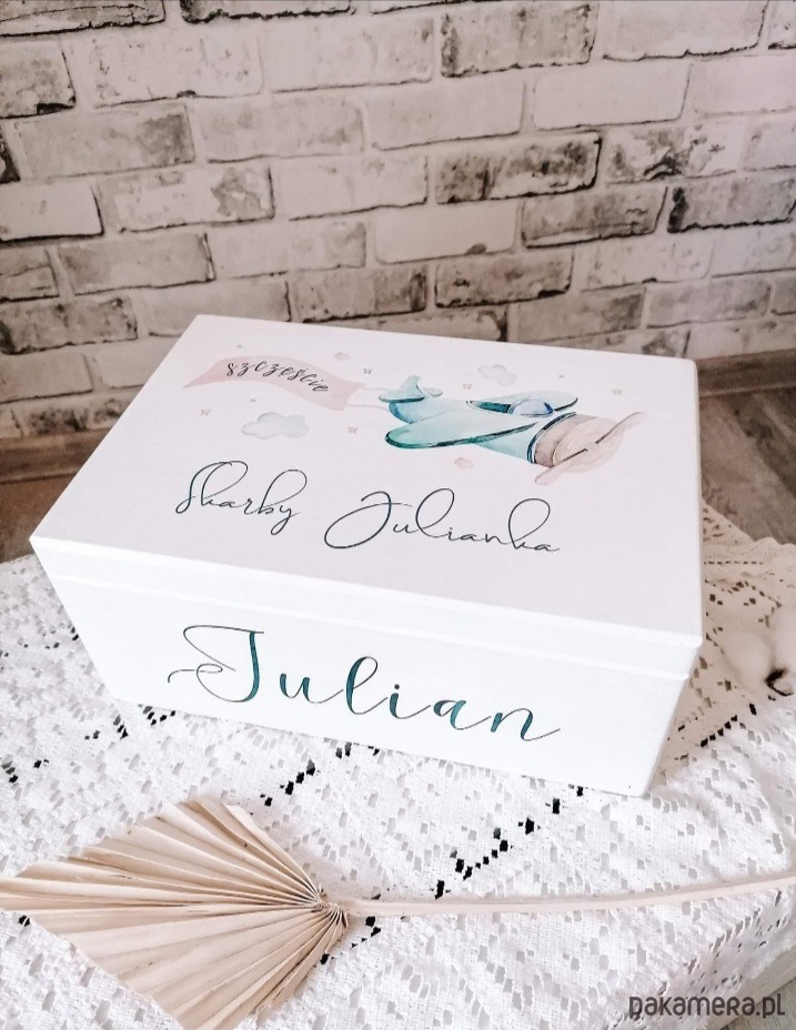 Pudełeczko o wymiarach 30x20x12 pomieści wiele skarbów: pierwsze zdjęcie USG, test ciążowy, ulubiona pieluszka, smoczek, książeczka.