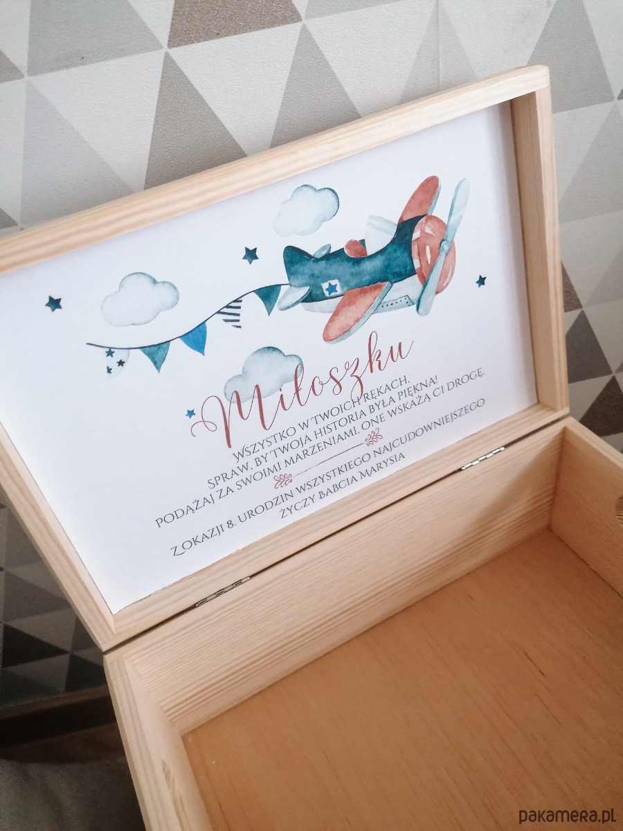 Drewniane, personalizowane pudełko SAMOLOT Z DEDYKACJĄ, chrzest, roczek
