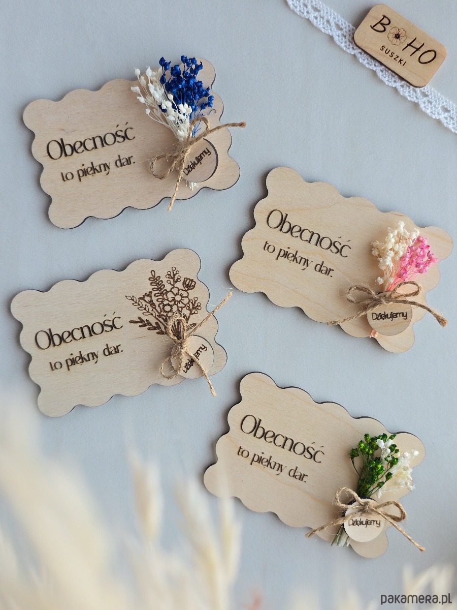💐 Drewniane podziękowania dla gości z grawerem - Obecność to piękny dar