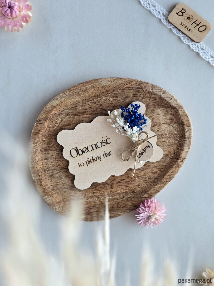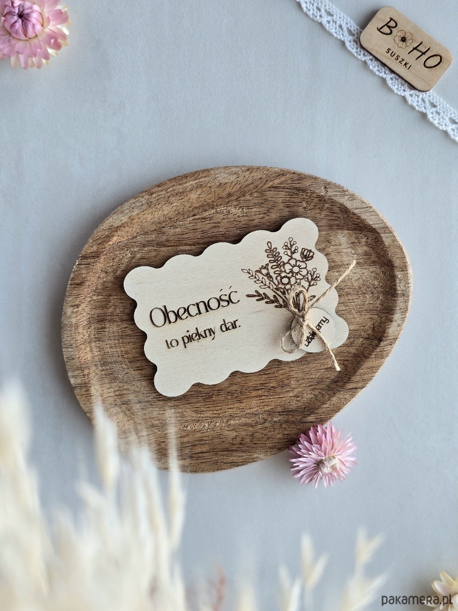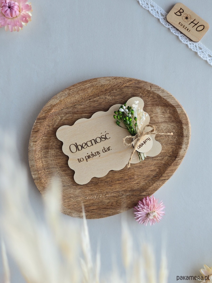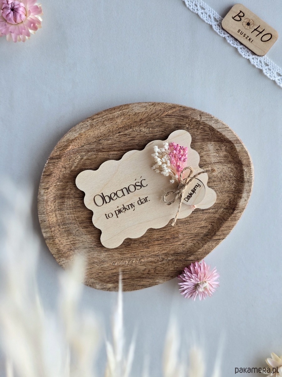 To drewniane podziękowanie z grawerem powstało z myślą o takich uroczystościach jak ślub, komunia, chrzest czy inne uroczystości. Falowana kartka ze sklejki z napisem "Obecność to piękny dar", grawerowanym bukietem lub mini bukiecikiem z suszonych kwiatów oraz zawieszką z napisem "Dziękujemy". To pamiątka, która nie trafia w zapomnienie. Idealna dla osób, które chcą podziękować bliskim w sposób osobisty, symboliczny i bez banału. Minimalistyczny styl sprawia, że kartka może stać się subtelną dekoracją domu, półki lub biurka.