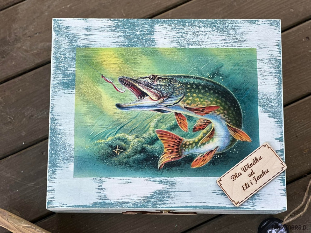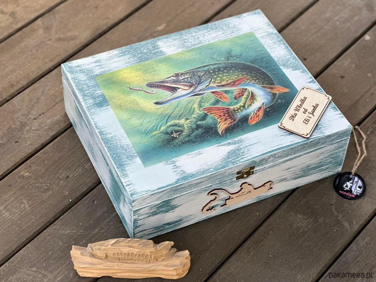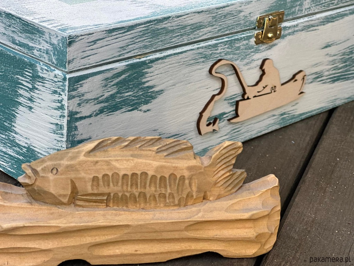 Drewniane pudełko, prezent dla wędkarza, pamiątka, skrzynia na alkohol