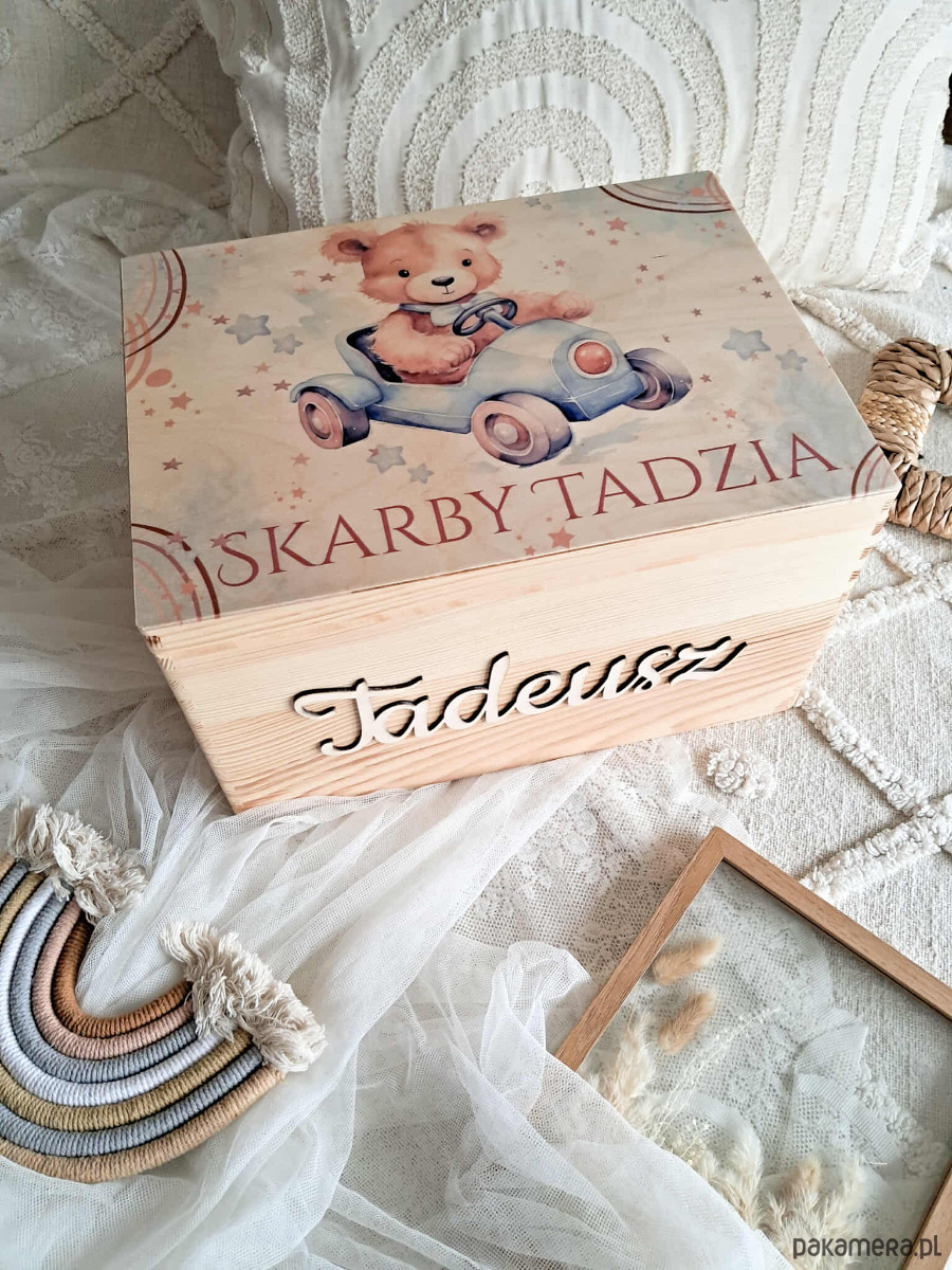 Zamknij najpiękniejsze chwile dzieciństwa w wyjątkowym kuferku wspomnień! Ten uroczy, drewniany kuferek z motywem misia w aucie to idealny prezent dla chłopca. Personalizowany imieniem, będzie cenną pamiątką na całe życie. Dodatkowo na froncie kuferka drewniane imię dziecka.