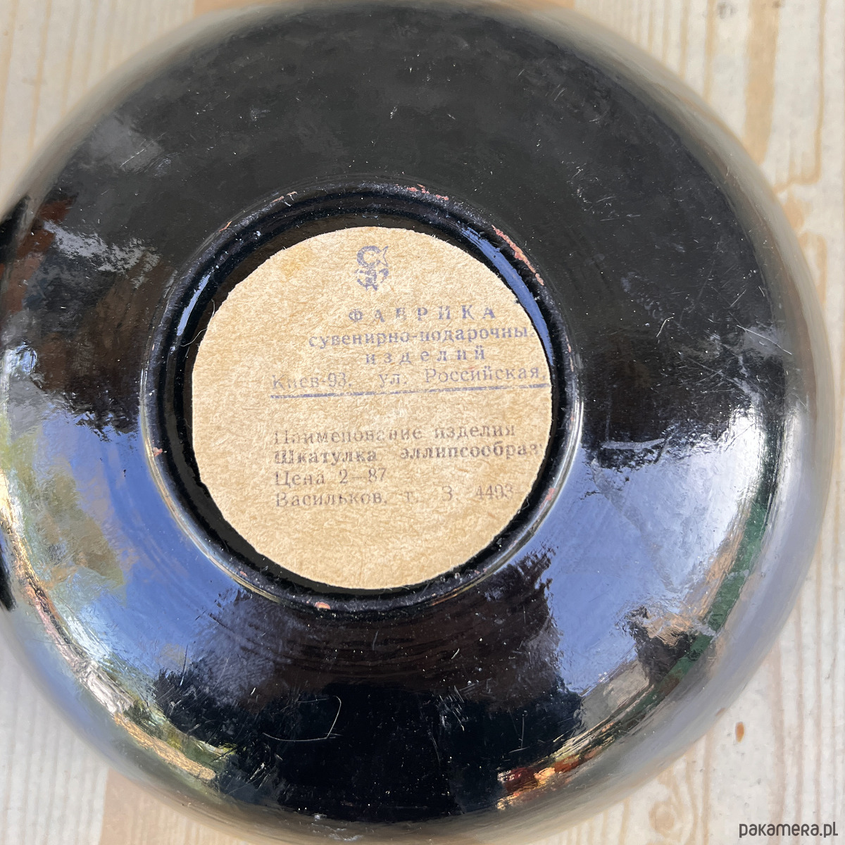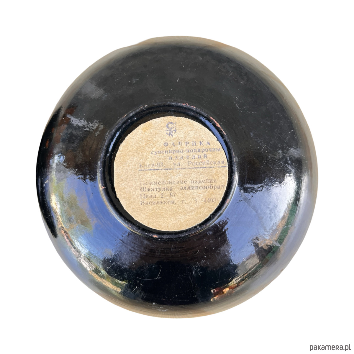 Zestaw pamiątkowy Pudełko i talerz wyprodukowane w Ukrainie przez Kijowską Fabrykę Wyrobów Pamiątkowych i Upominków po 1968 roku.