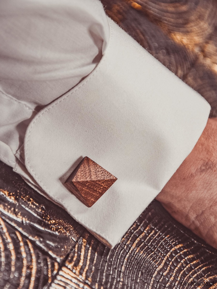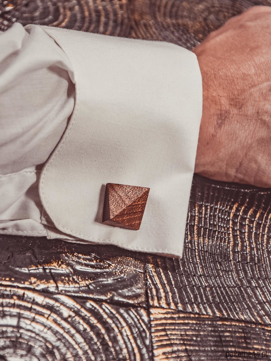 Ręcznie wykonane drewniane spinki do mankietów z drewna egzotycznego Sapeli, które charakteryzuje się ciepłą barwą i jednolitą strukturą. Spinki kwadratowe z dwoma płaszczyznami.