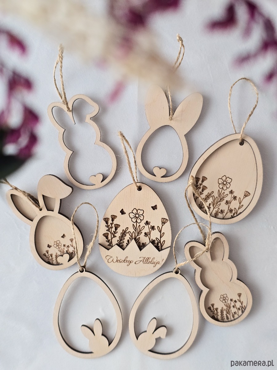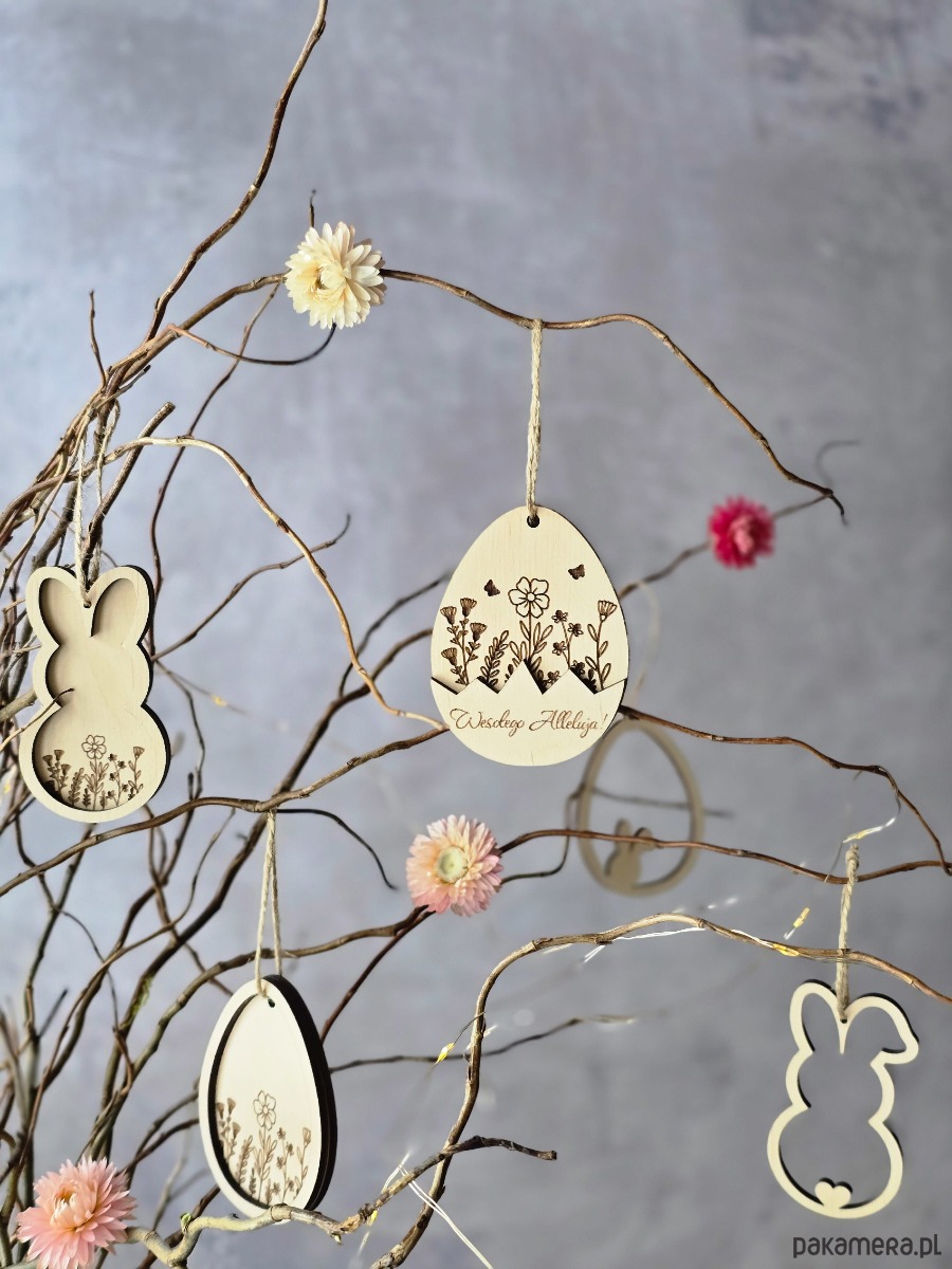 Idealnie sprawdzą się jako ozdoby na gałązki, stroik wielkanocny, koszyk ze święconką, wianek na drzwi lub dekoracja stołu. W zestawie znajdziesz zawieszki z motywem królika i jajka - 4 zawieszki z grawerem oraz 4 w wersji prostej. Dzięki lekkiej formie i sznureczkowi możesz je zawiesić tam, gdzie chcesz.