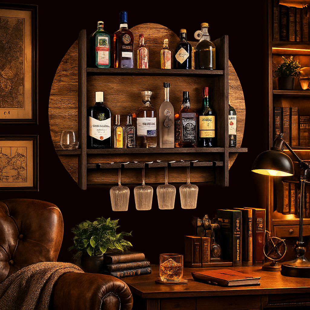 Drewniana półka barowa ścienna John Paddle to dekoracyjne i funkcjonalne rozwiązanie dla osób, które cenią stylowe dodatki do wnętrz oraz efektowną ekspozycję trunków. Okrągłe tło, wyrazista drewniana konstrukcja i rustykalne wykończenie sprawiają, że produkt świetnie odnajduje się w salonie, jadalni, domowym barku, gabinecie czy surowych wnętrzach loftowych.