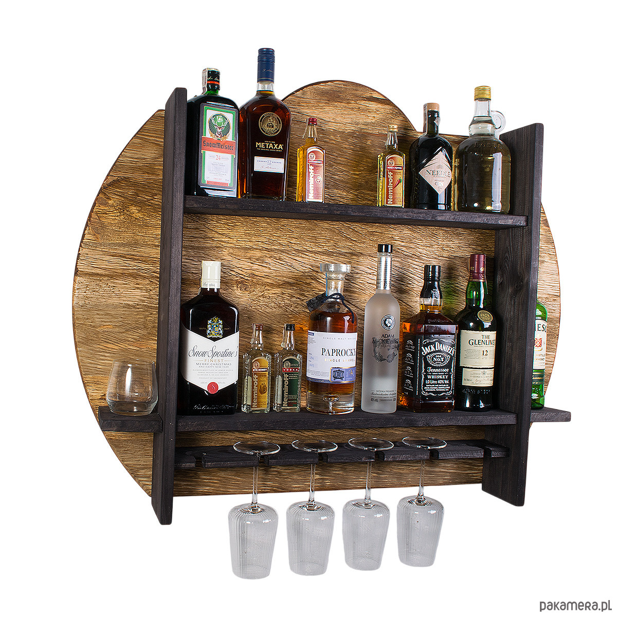 -Oryginalny design: Okrągły panel tylny sprawia, że półka prezentuje się znacznie ciekawiej niż klasyczne, proste regały na alkohol.