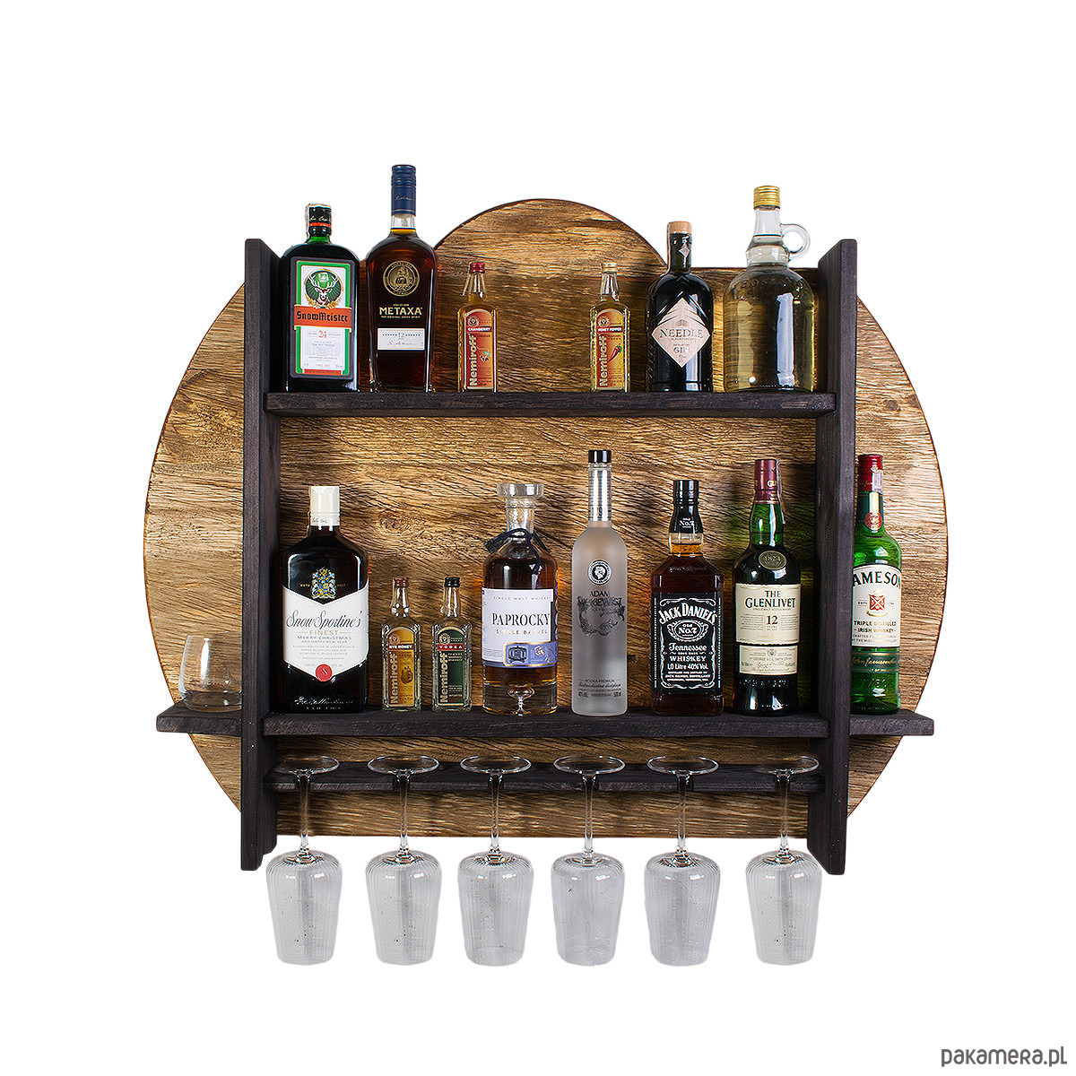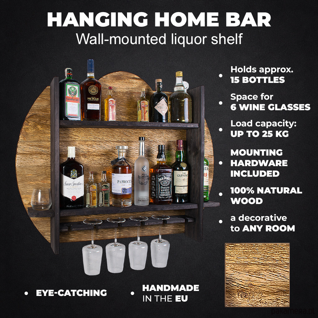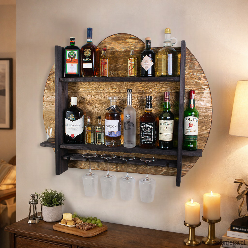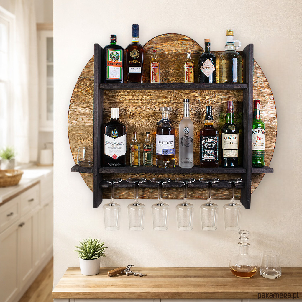 Półka została zaprojektowana z myślą o wygodnym przechowywaniu butelek oraz zawieszaniu kieliszków w jednym, spójnym systemie. Dzięki kilku poziomom możesz uporządkować domowy barek, tworząc jednocześnie atrakcyjną dekorację ścienną. Model ten mieści 6 kieliszków, co pozwala stworzyć praktyczną strefę do serwowania ulubionych trunków w zasięgu ręki.