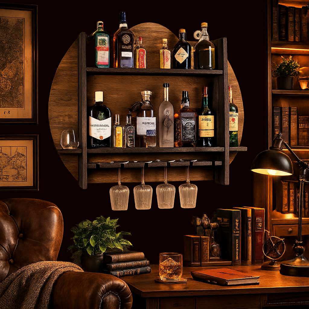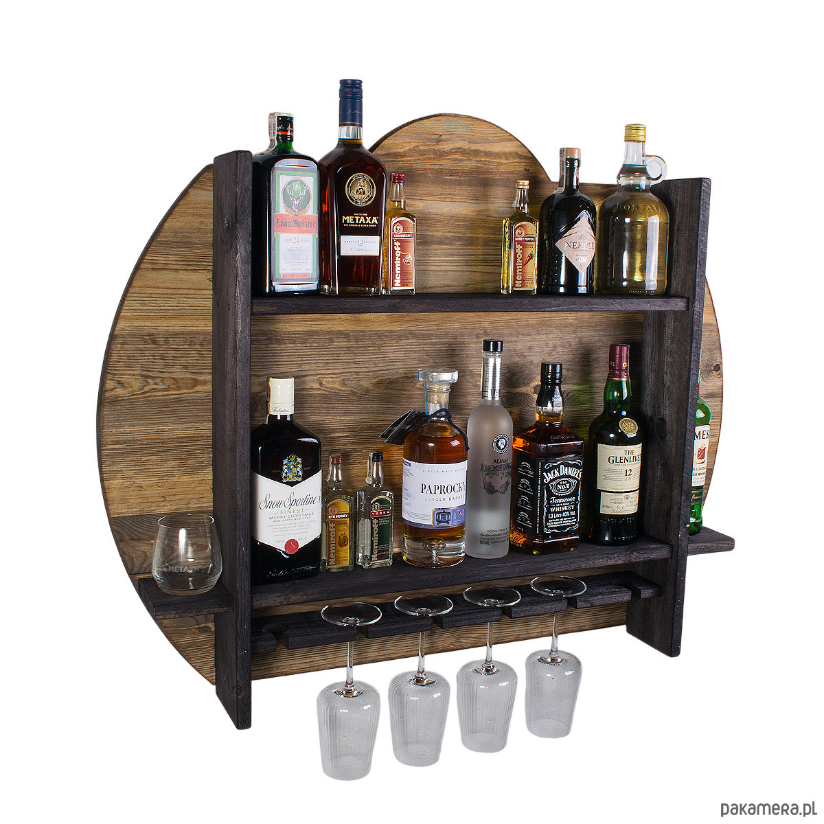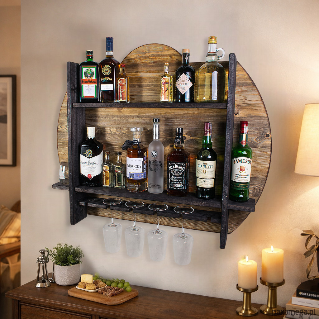 Drewniana półka barowa ścienna John Paddle to dekoracyjne i funkcjonalne rozwiązanie dla osób, które cenią stylowe dodatki do wnętrz oraz efektowną ekspozycję trunków. Okrągłe tło, wyrazista drewniana konstrukcja i rustykalne wykończenie sprawiają, że produkt świetnie odnajduje się w salonie, jadalni, domowym barku, gabinecie czy surowych wnętrzach loftowych.