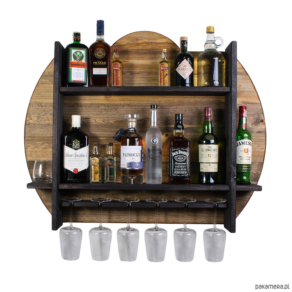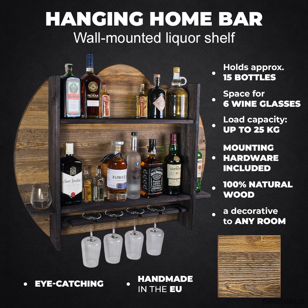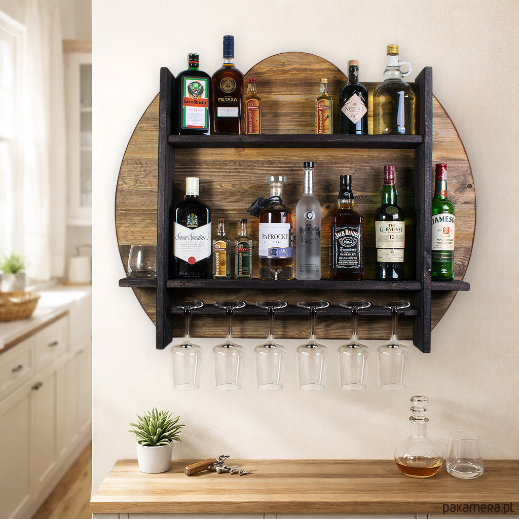 Półka została zaprojektowana z myślą o wygodnym przechowywaniu butelek oraz zawieszaniu kieliszków w jednym, spójnym systemie. Dzięki kilku poziomom możesz uporządkować domowy barek, tworząc jednocześnie atrakcyjną dekorację ścienną. Model ten mieści 6 kieliszków, co pozwala stworzyć praktyczną strefę do serwowania ulubionych trunków w zasięgu ręki.