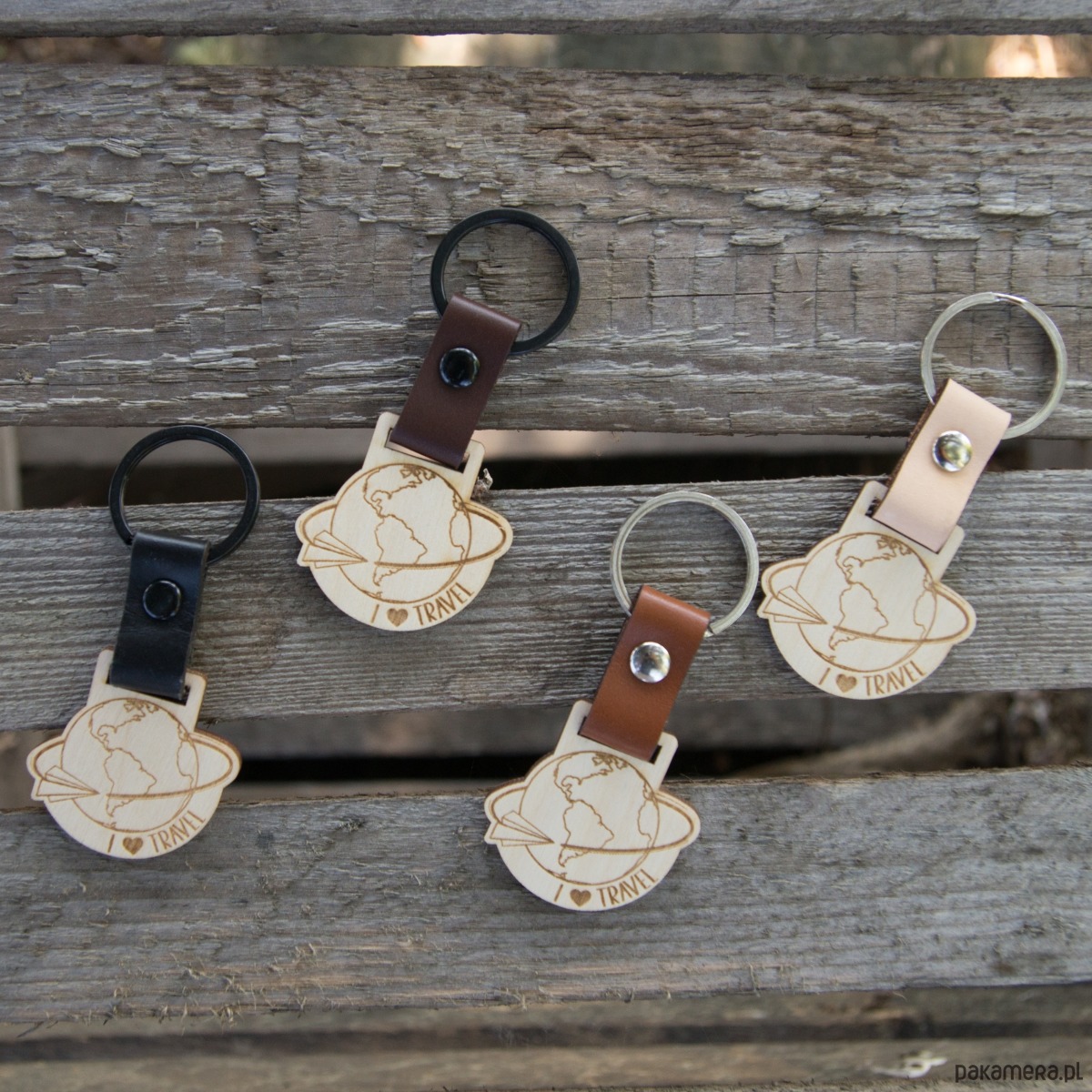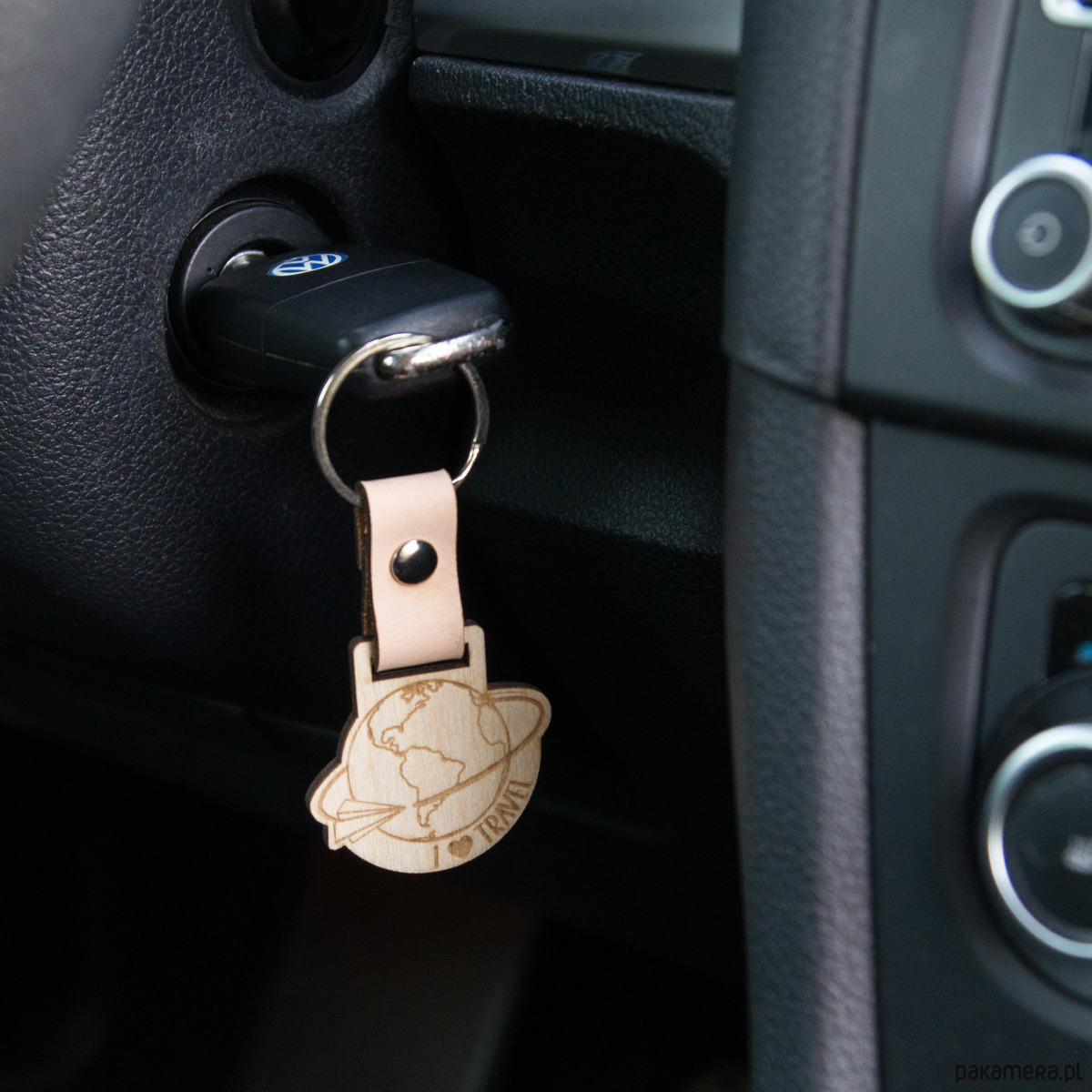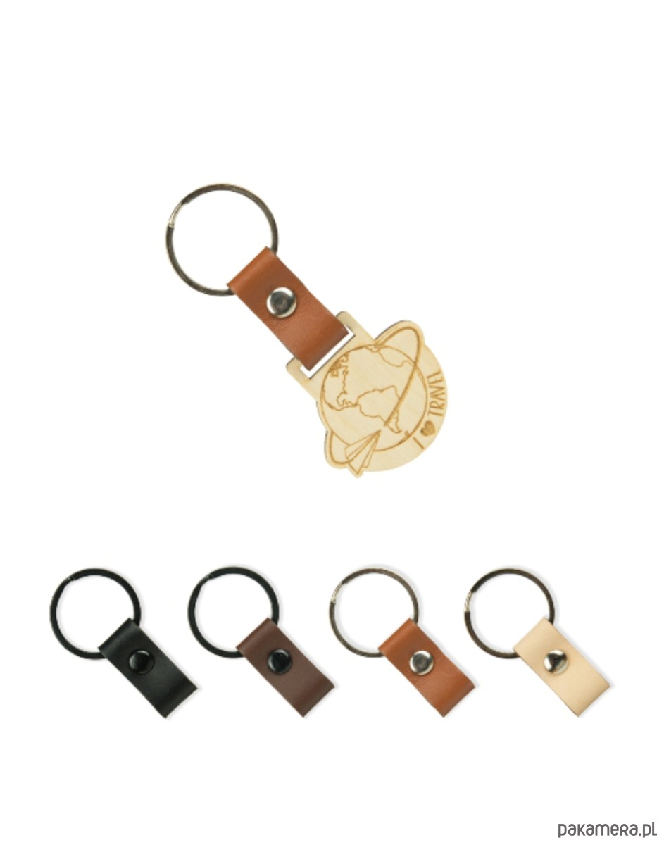 Drewniany brelok z paskiem skórzanym "I love travel"