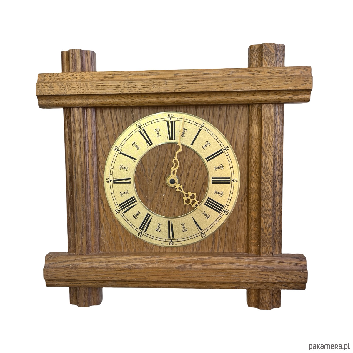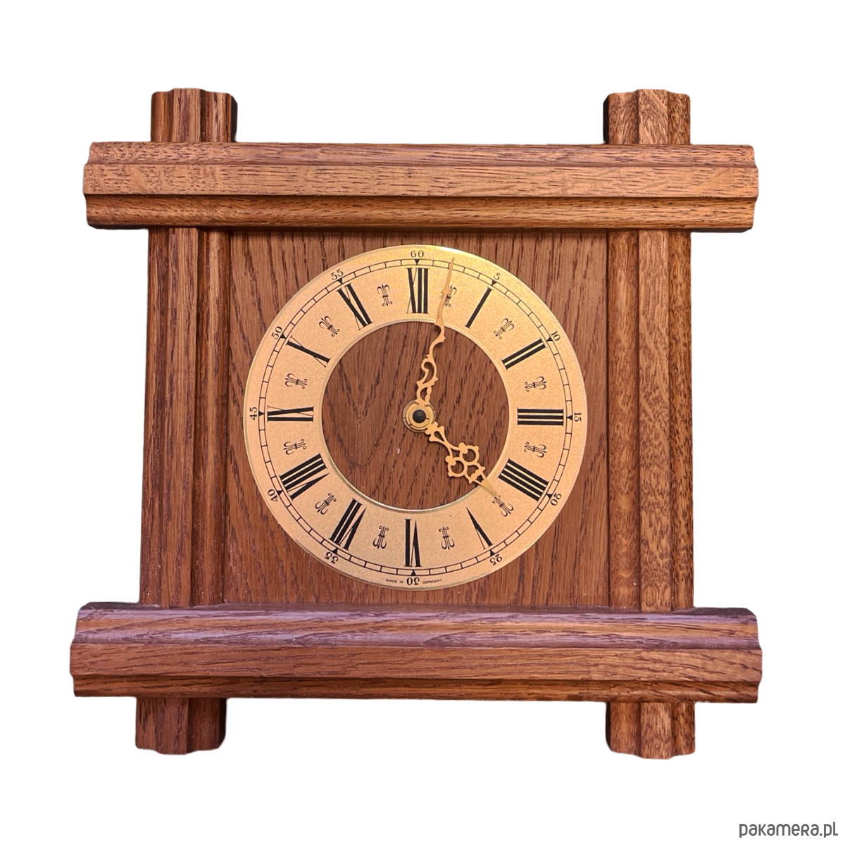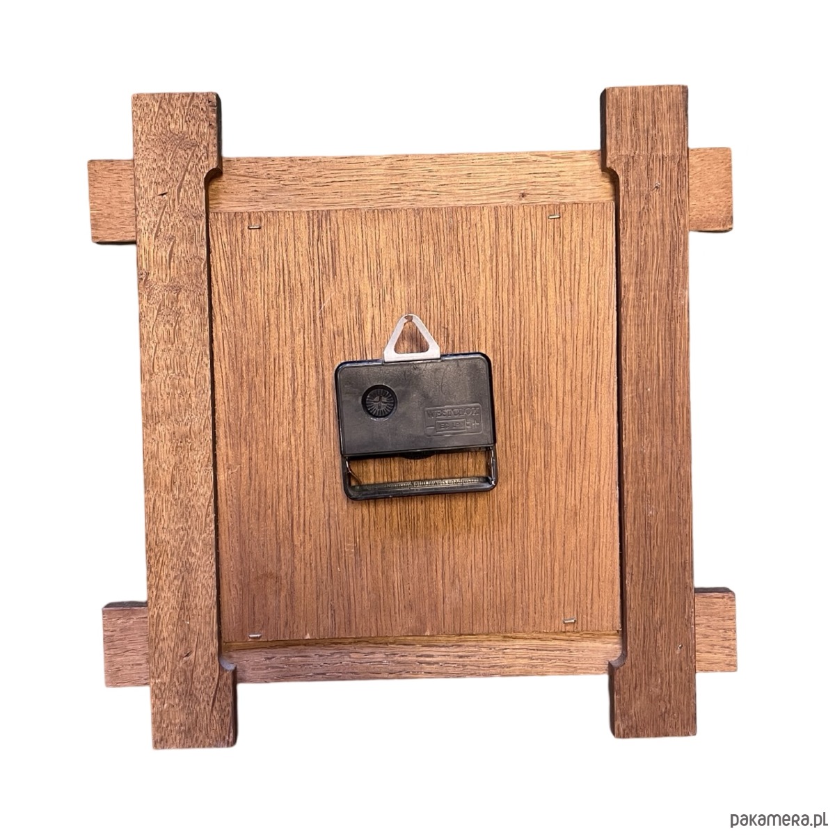 Drewniany zegar ścienny w stylu rustykalnym wyprodukowany przez niemiecką firmę Westclox w drugiej połowie ubiegłego wieku. Korpus wykonany z drewna -masyw dębowy, cyferblat mosiężny. Zegar ma mechanizm kwarcowy- na pojedynczą baterię AA, sprawny w stanie bardzo dobrym, nosi niewielkie ślady użytkowania.
