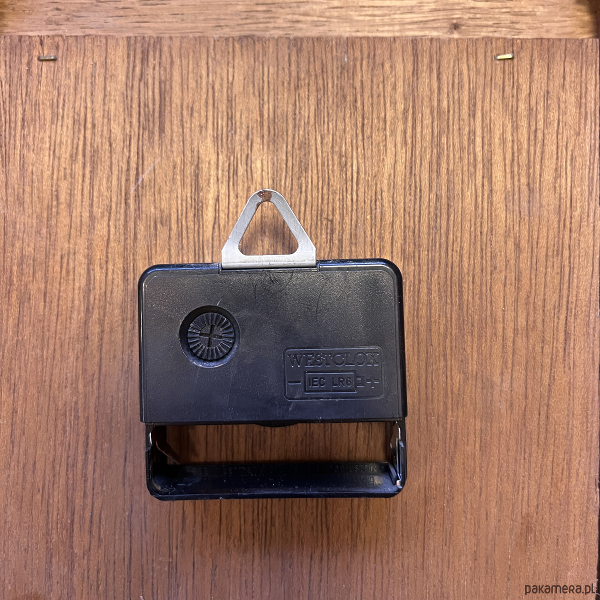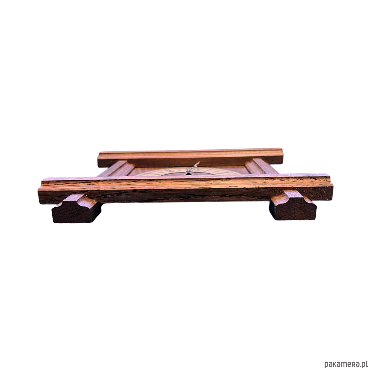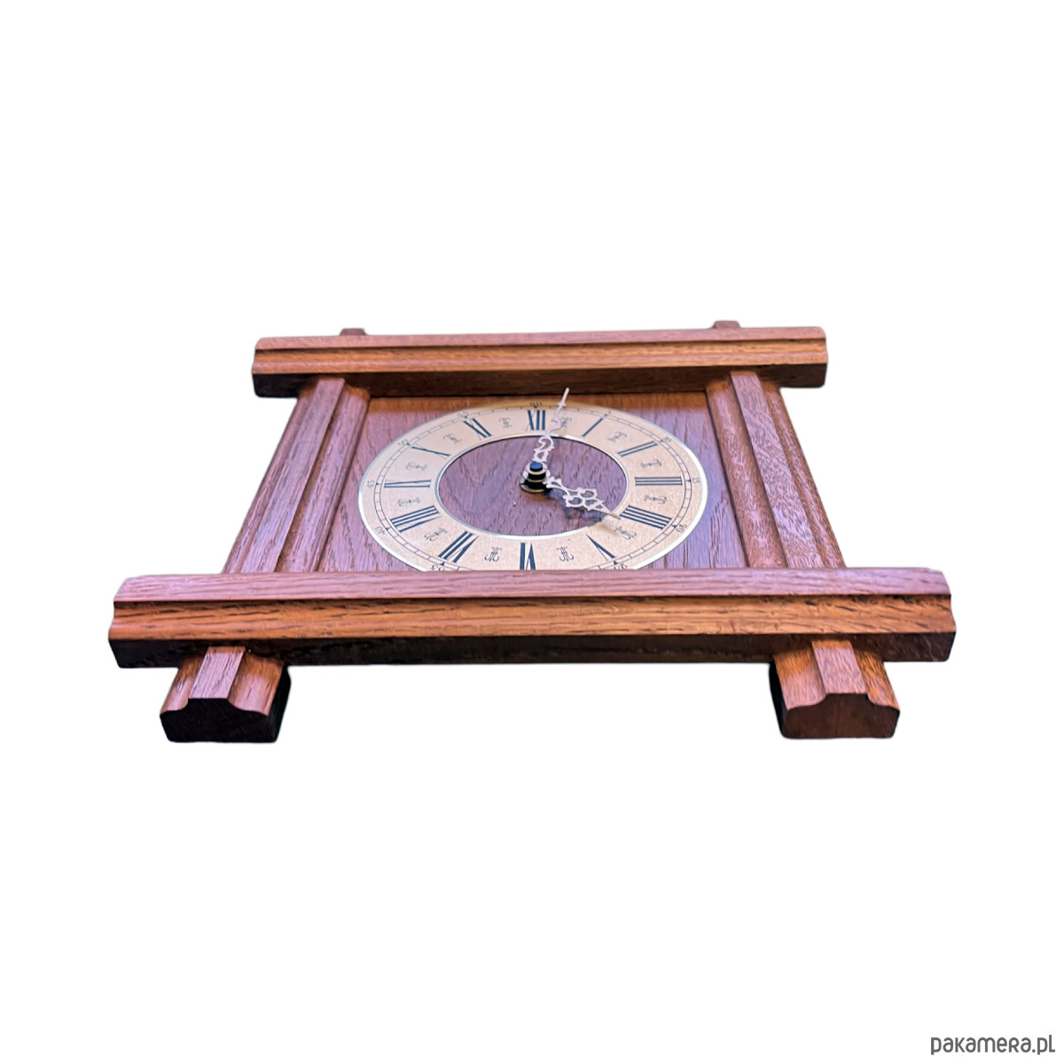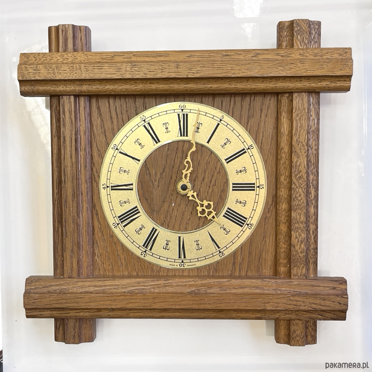 Drewniany zegar ścienny w stylu rustykalnym wyprodukowany przez niemiecką firmę Westclox w drugiej połowie ubiegłego wieku. Korpus wykonany z drewna -masyw dębowy, cyferblat mosiężny. Zegar ma mechanizm kwarcowy- na pojedynczą baterię AA, sprawny w stanie bardzo dobrym, nosi niewielkie ślady użytkowania.