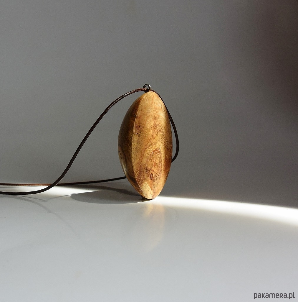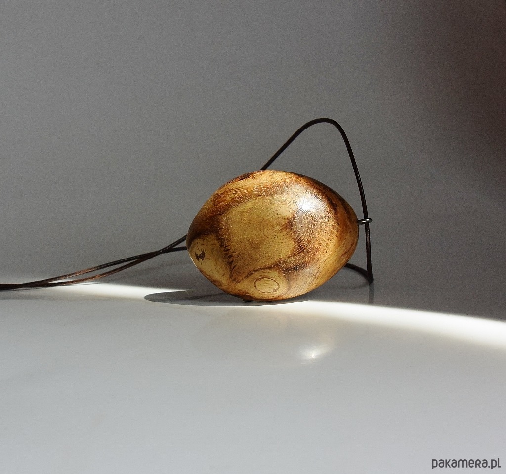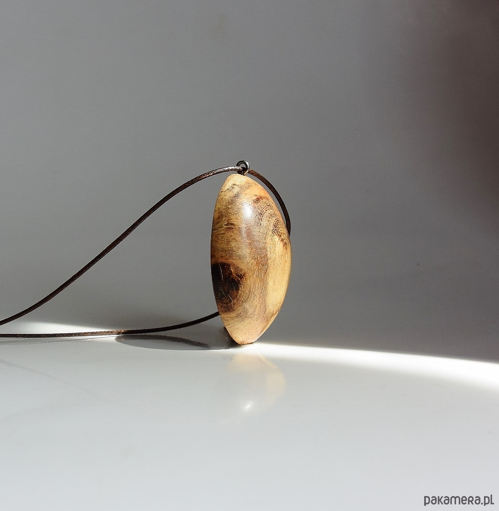 Wisiorek wykonany został z narośli. która wyrosła na dębowym konarze. Całkowicie naturalny, wyszlifowany tak, aby wyglądał jak połowa jajka. Po jednej stronie jest półokrągły, a po drugiej płaski. Prostota i minimalizm, idealny do letnich np. lnianych ubrań. Pomimo tego, że drewno jest niesamowicie twarde, to wisiorek jest bardzo lekki. Drewno zabezpieczone zostało naturalnymi woskami i wypolerowane.
