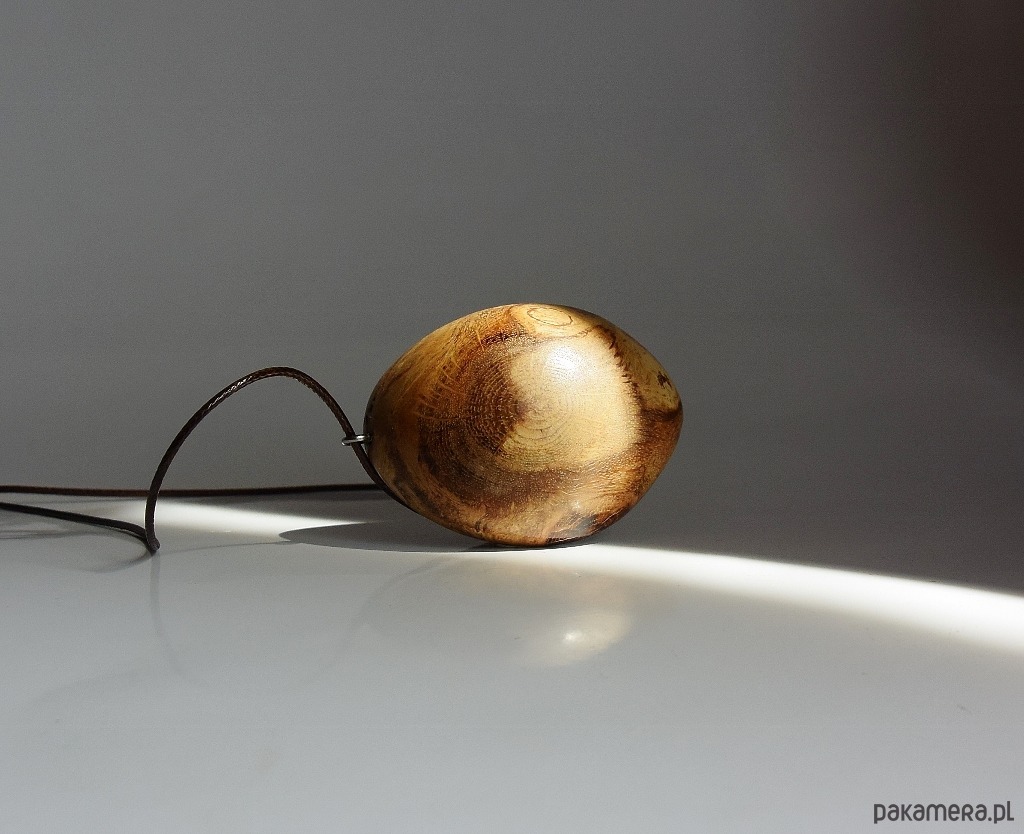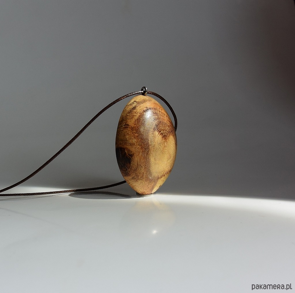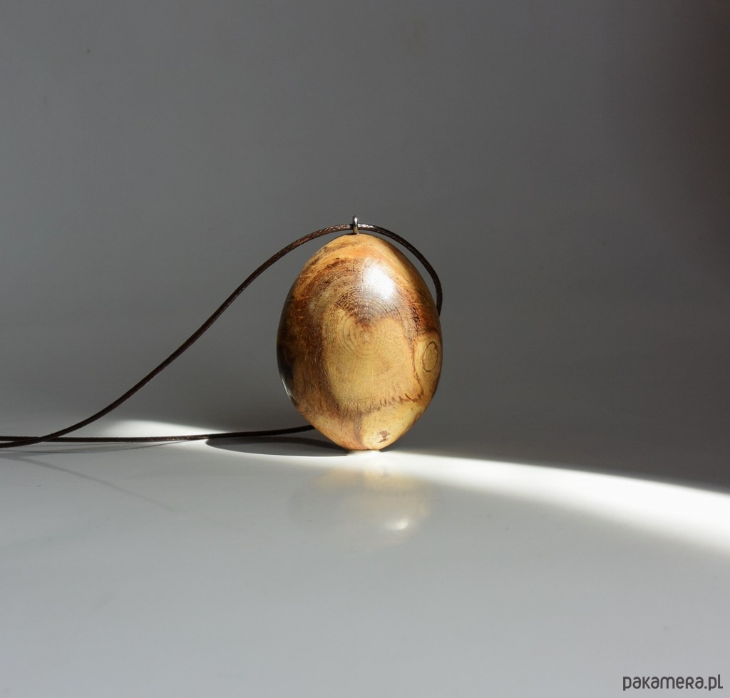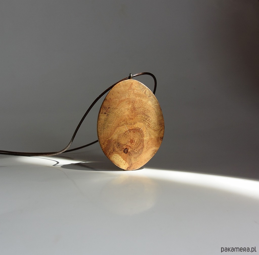 Wisiorek wykonany został z narośli. która wyrosła na dębowym konarze. Całkowicie naturalny, wyszlifowany tak, aby wyglądał jak połowa jajka. Po jednej stronie jest półokrągły, a po drugiej płaski. Prostota i minimalizm, idealny do letnich np. lnianych ubrań. Pomimo tego, że drewno jest niesamowicie twarde, to wisiorek jest bardzo lekki. Drewno zabezpieczone zostało naturalnymi woskami i wypolerowane.