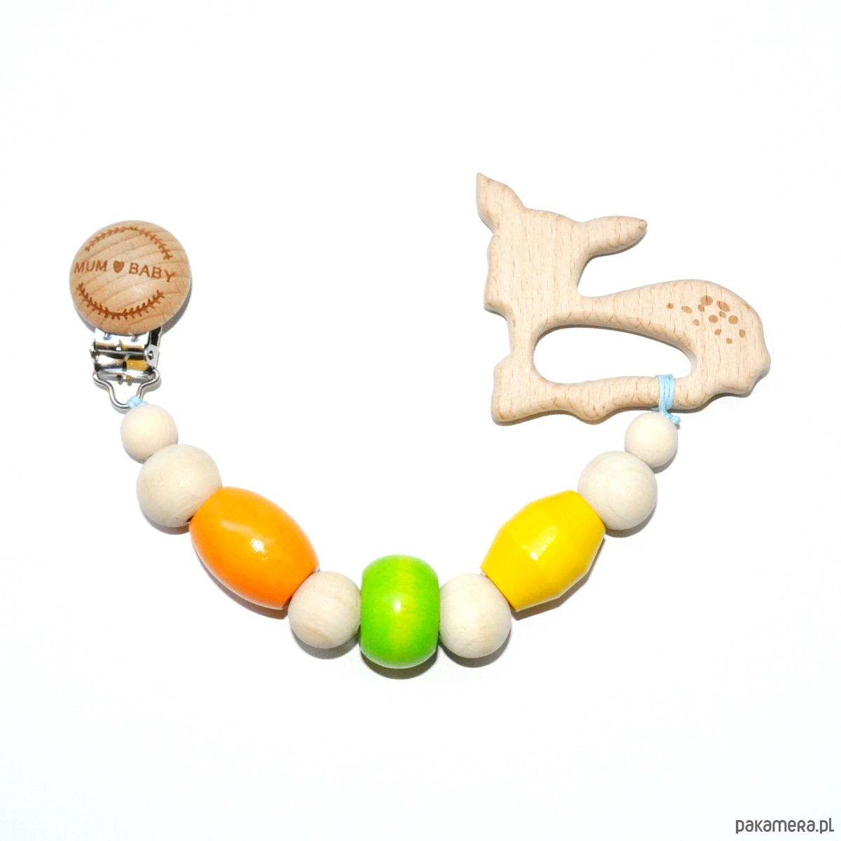 Unikatowy gryzak z atestowanych drewnianych elementów bezpiecznych dla dziecka z jednej strony z klipsem, z drugiej strony z bezpieczną do gryzienia dla dziecka sarenką.