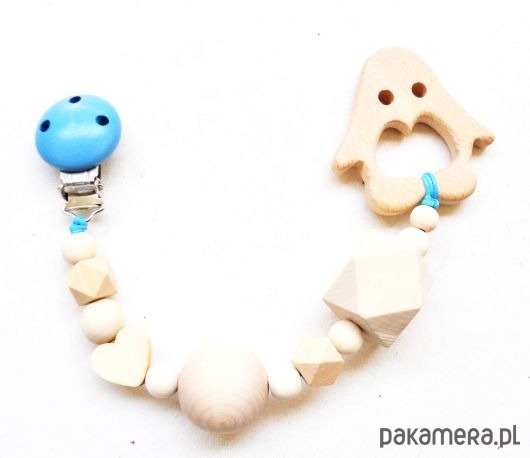 Unikatowy gryzak z atestowanych drewnianych elementów bezpiecznych dla dziecka z jednej strony z klipsem, z drugiej strony z bezpieczną do gryzienia dla dziecka sówką.
