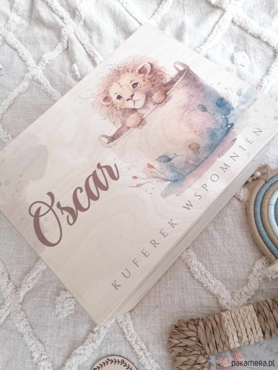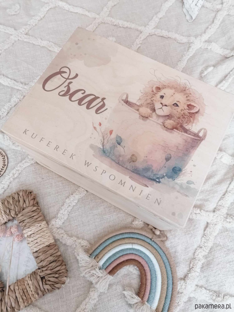Drewniany kuferek wspomnień dla chłopca z lwem prezent na chrzest, roczek