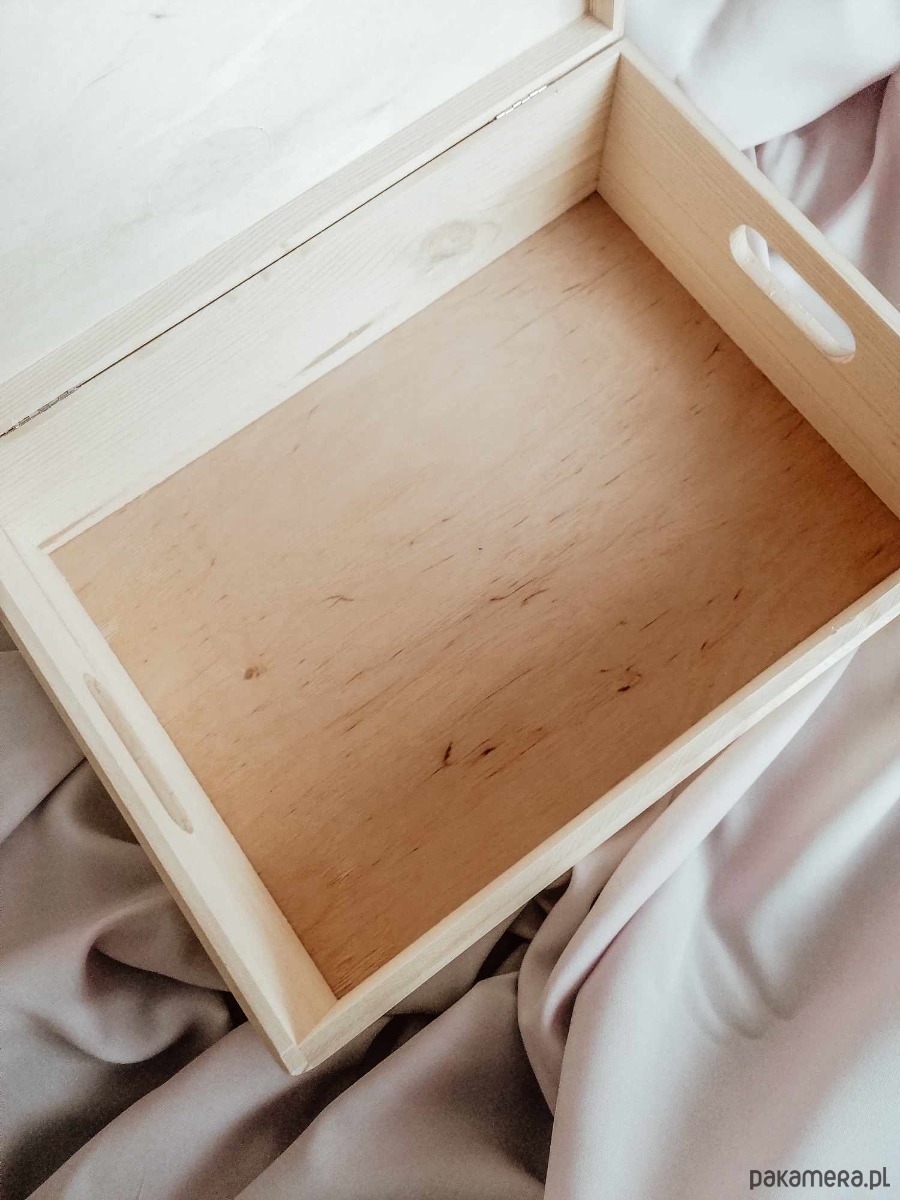 Pudełko jest bardzo pojemne: 40x30x22 cm ( to nasze największe pudełko, praktycznie trudno dostępne w innych sklepach). Wieko montowane na zawiasach. Całość zabezpieczona lakierem akrylowym (chroni przed ciemnieniem, zabezpiecza przed brudzeniem się pudełka).