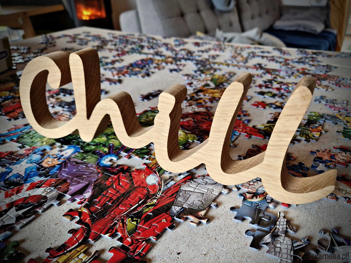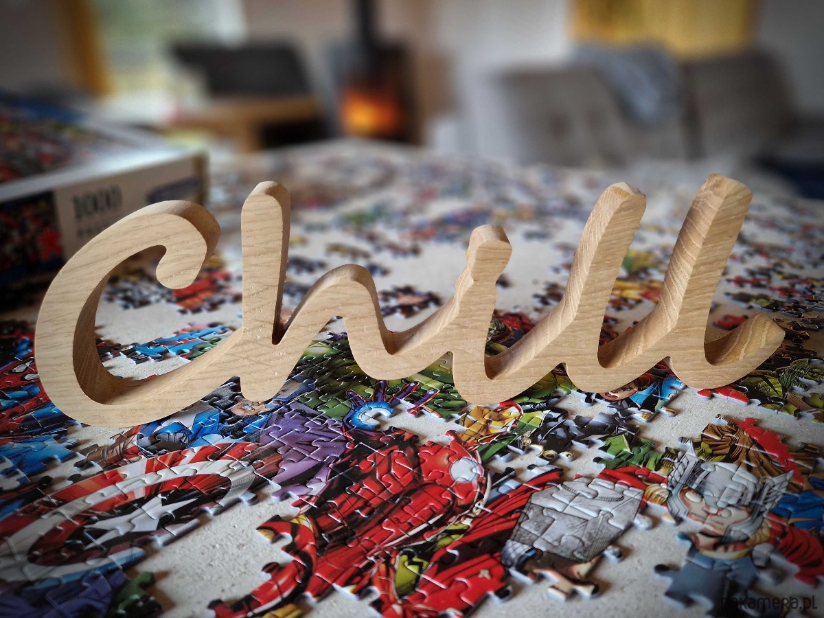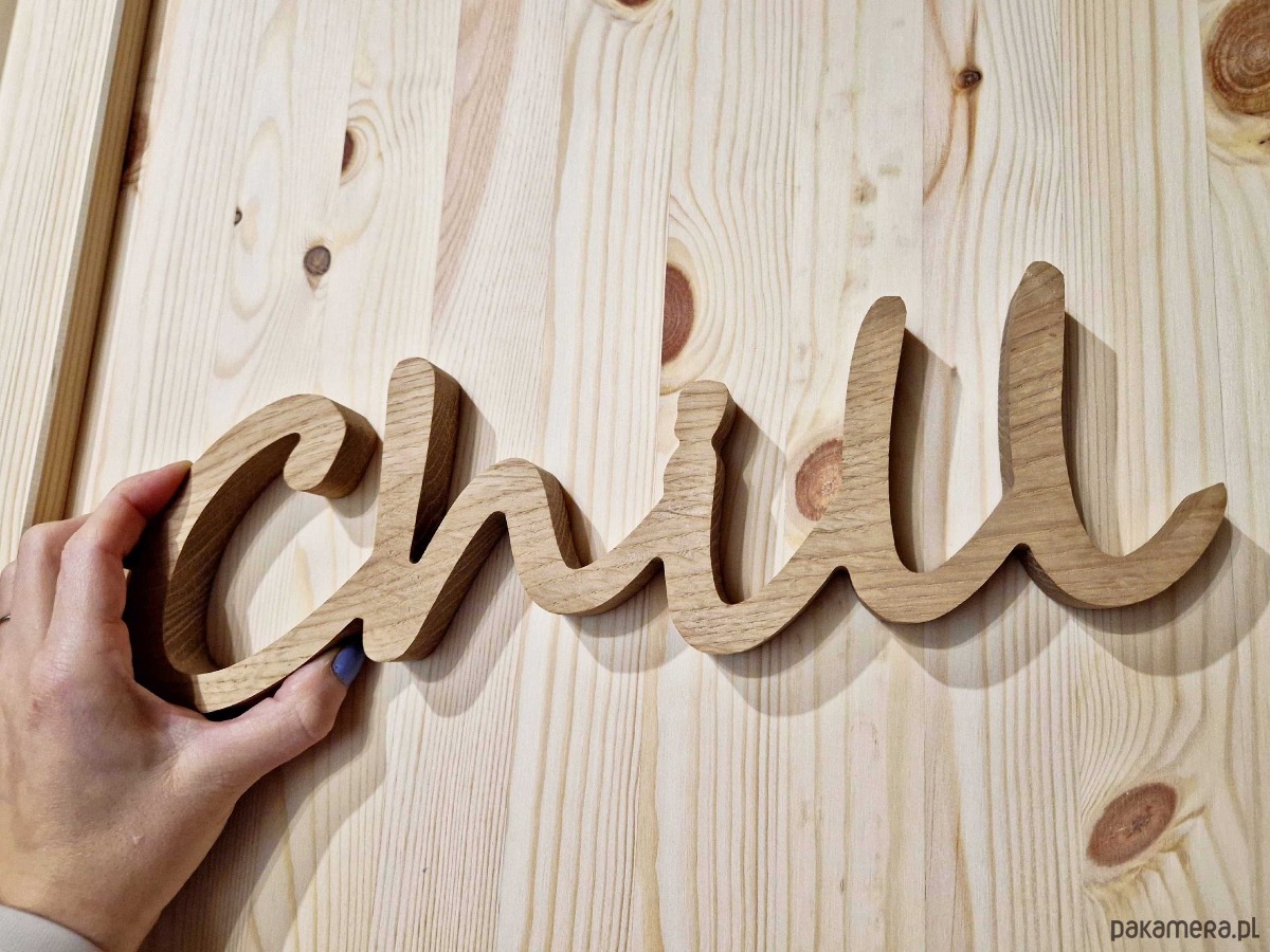 Napis „Chill” wykonany z litego drewna dębowego to dekoracja, która tworzy klimat spokoju i odpoczynku.