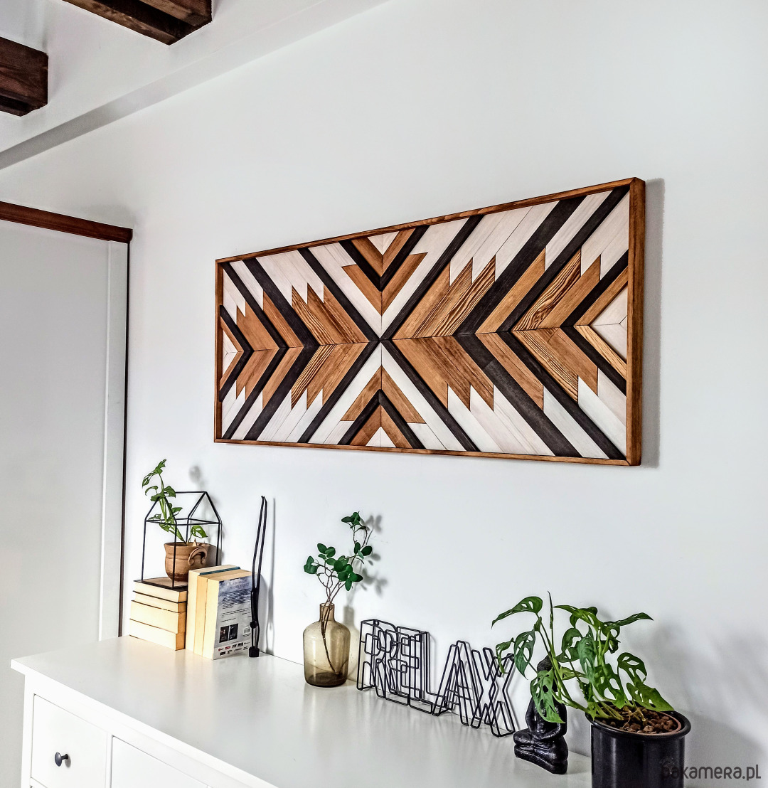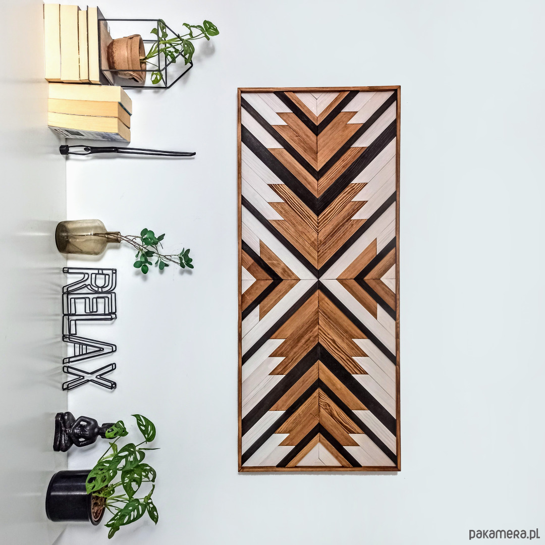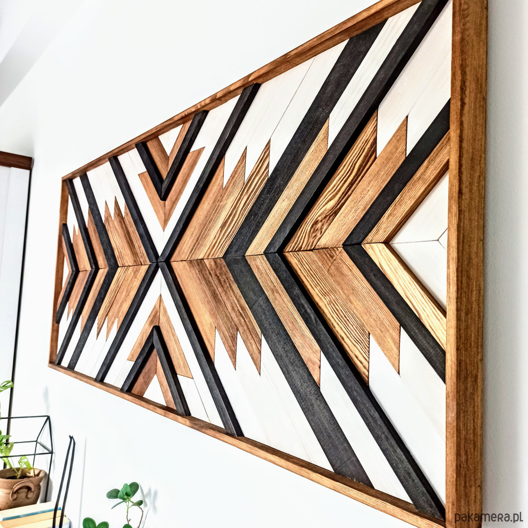 Inspiracja boho chic i geometrią. Obraz w całości wykonany z litego drewna pokryty bejcą podkreślającą słoje z dodatkiem koloru czarnego i białego.