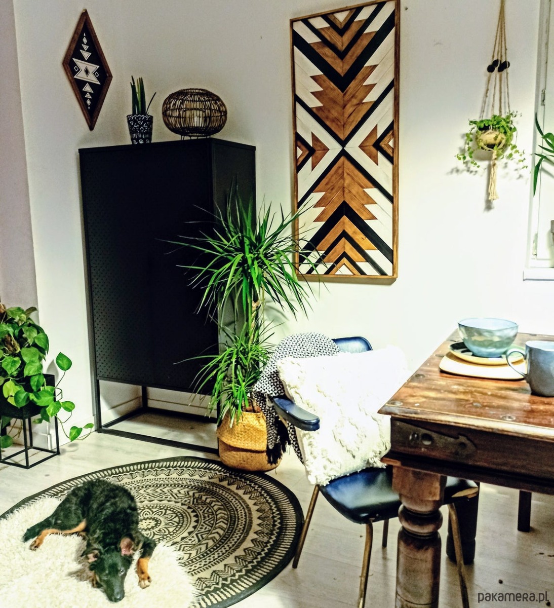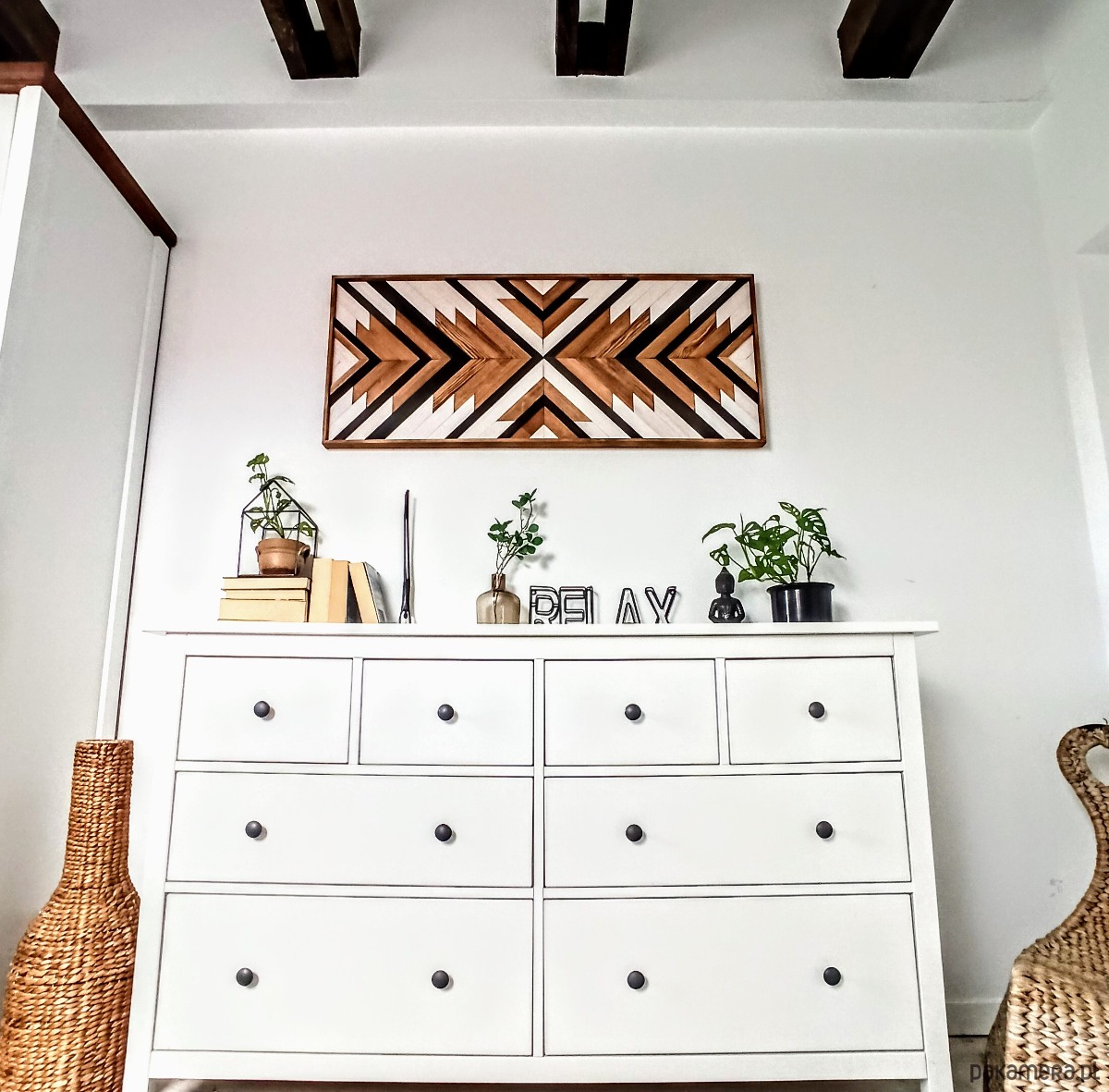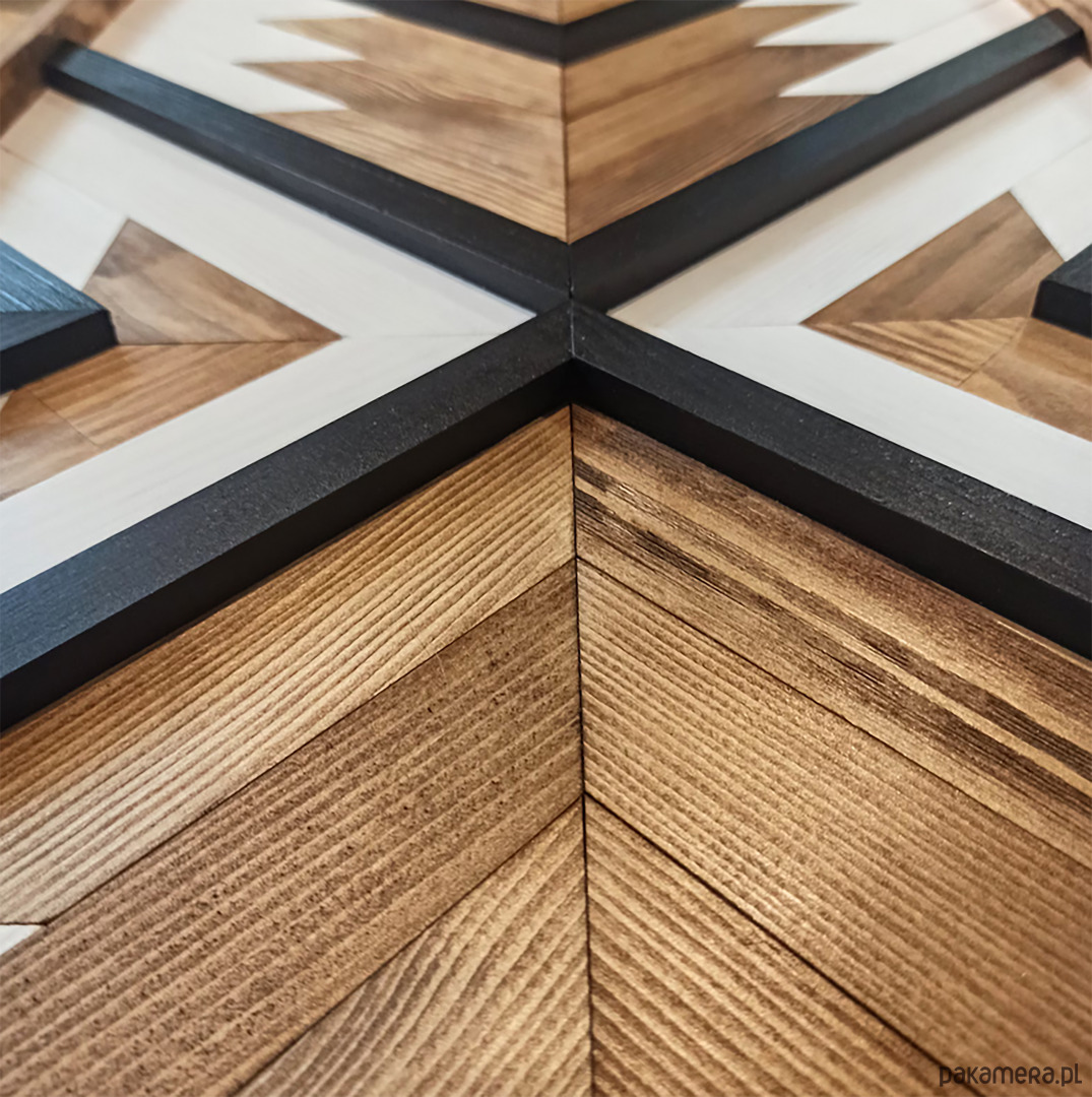 Inspiracja boho chic i geometrią. Obraz w całości wykonany z litego drewna pokryty bejcą podkreślającą słoje z dodatkiem koloru czarnego i białego.