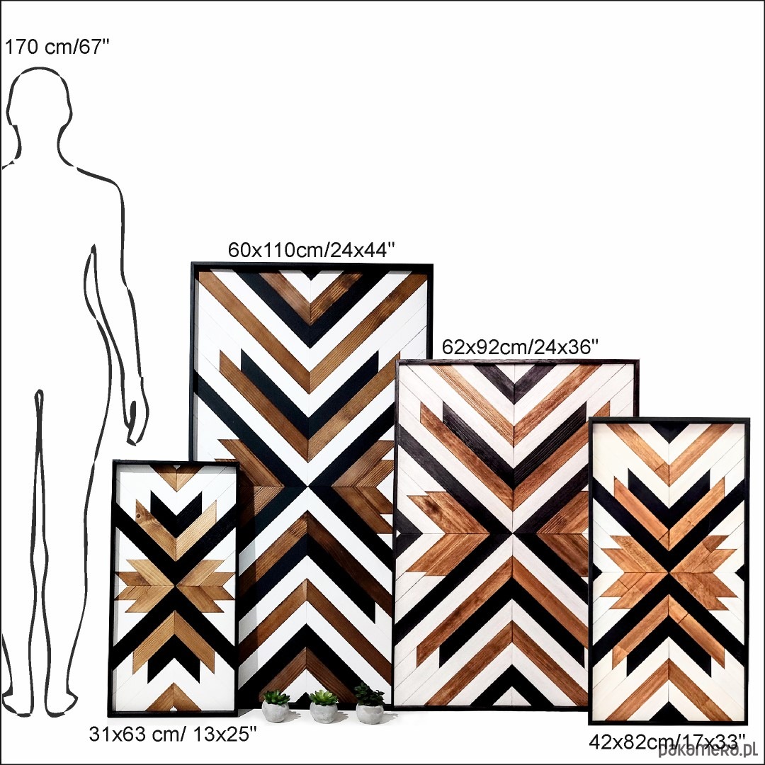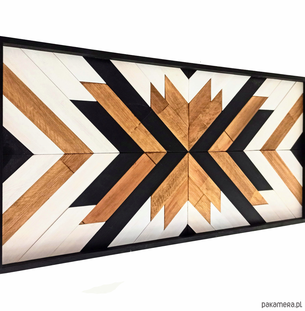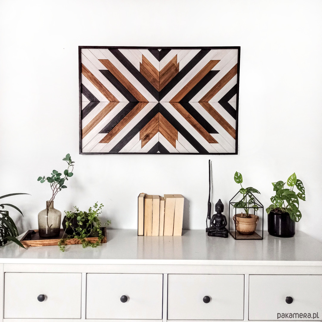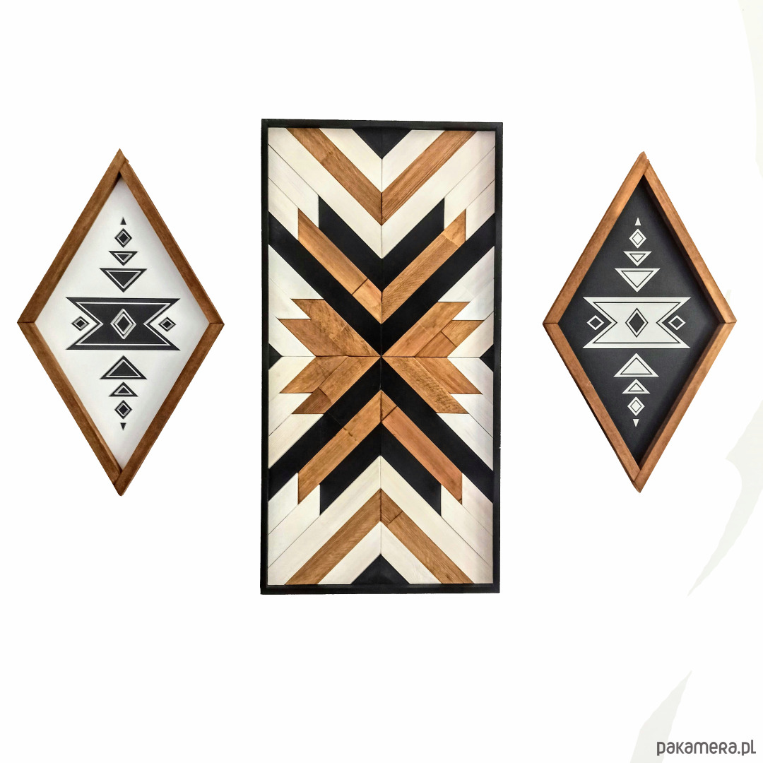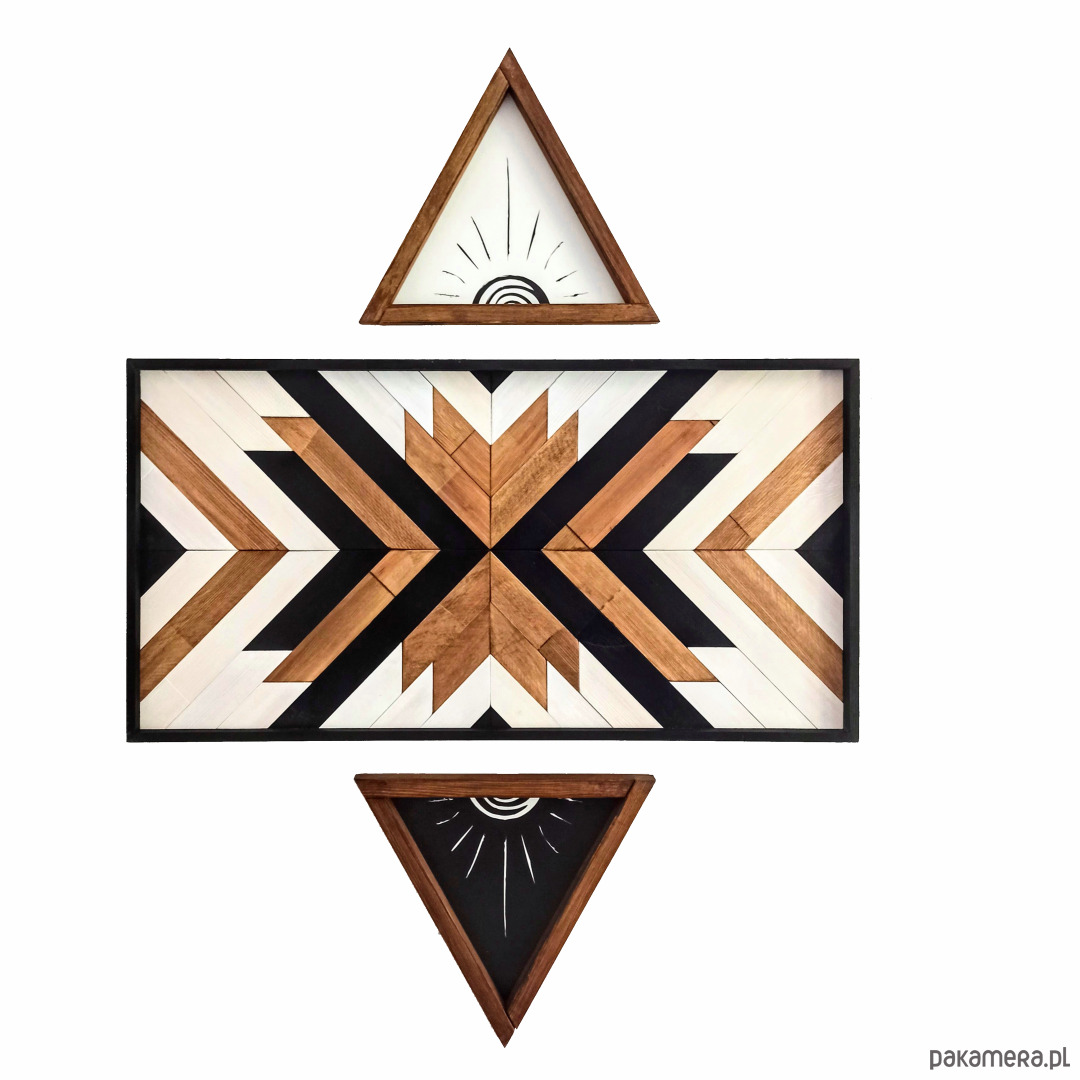 Inspiracja boho chic i geometrią. Obraz w całości wykonany z litego drewna pokryty bejcą podkreślającą słoje z dodatkiem koloru czarnego i białego.