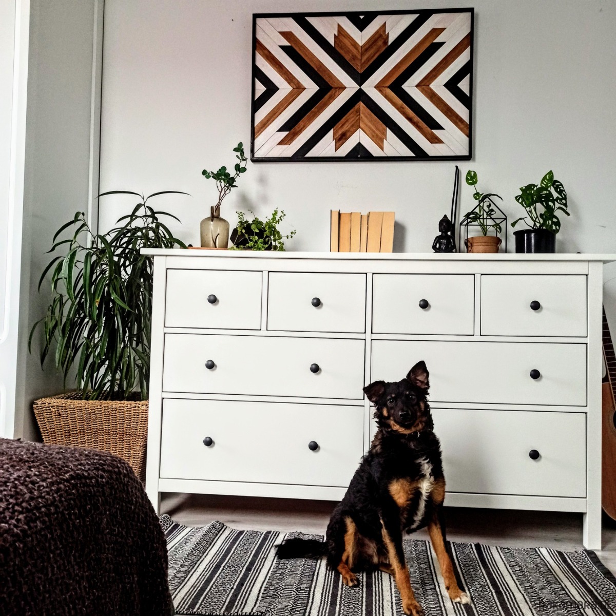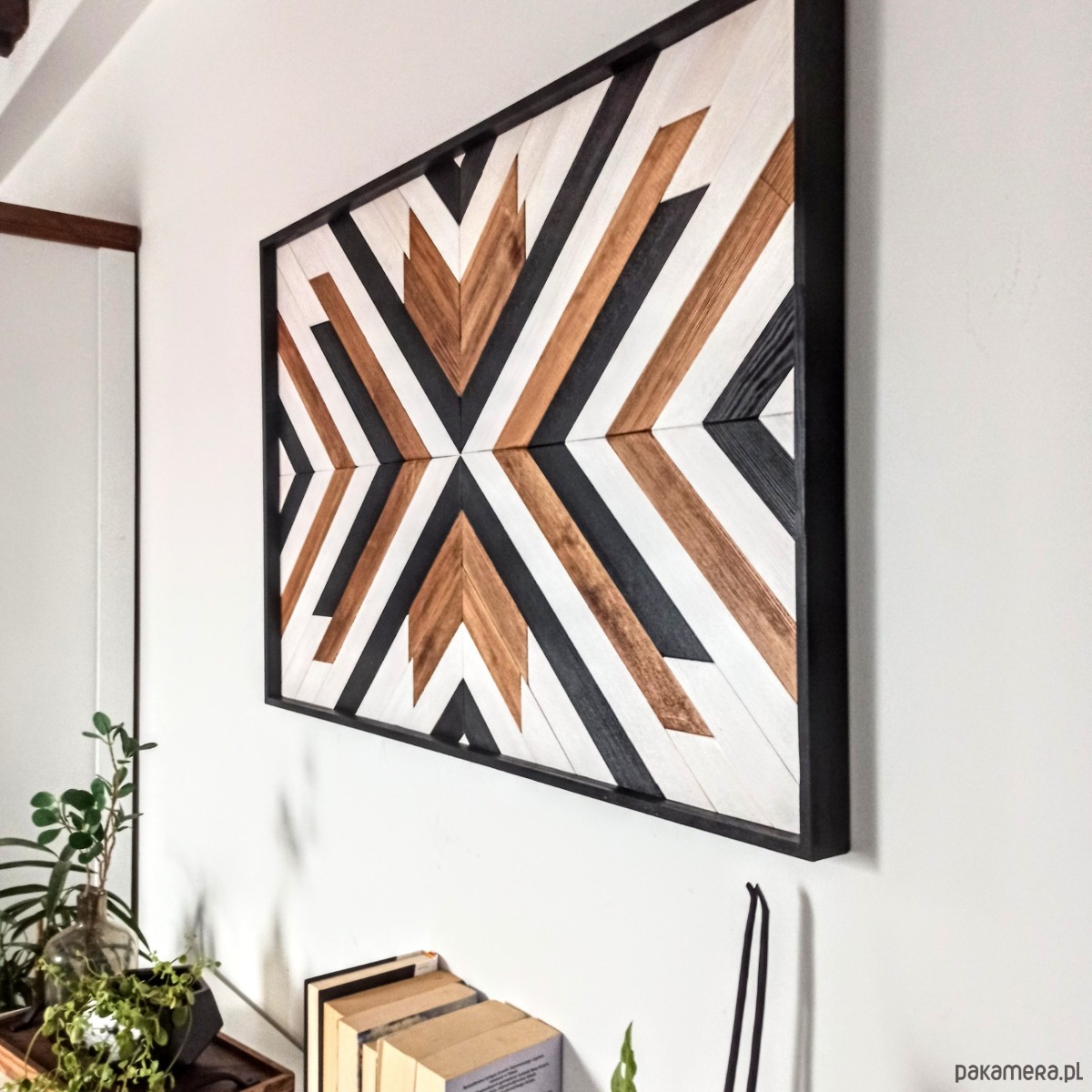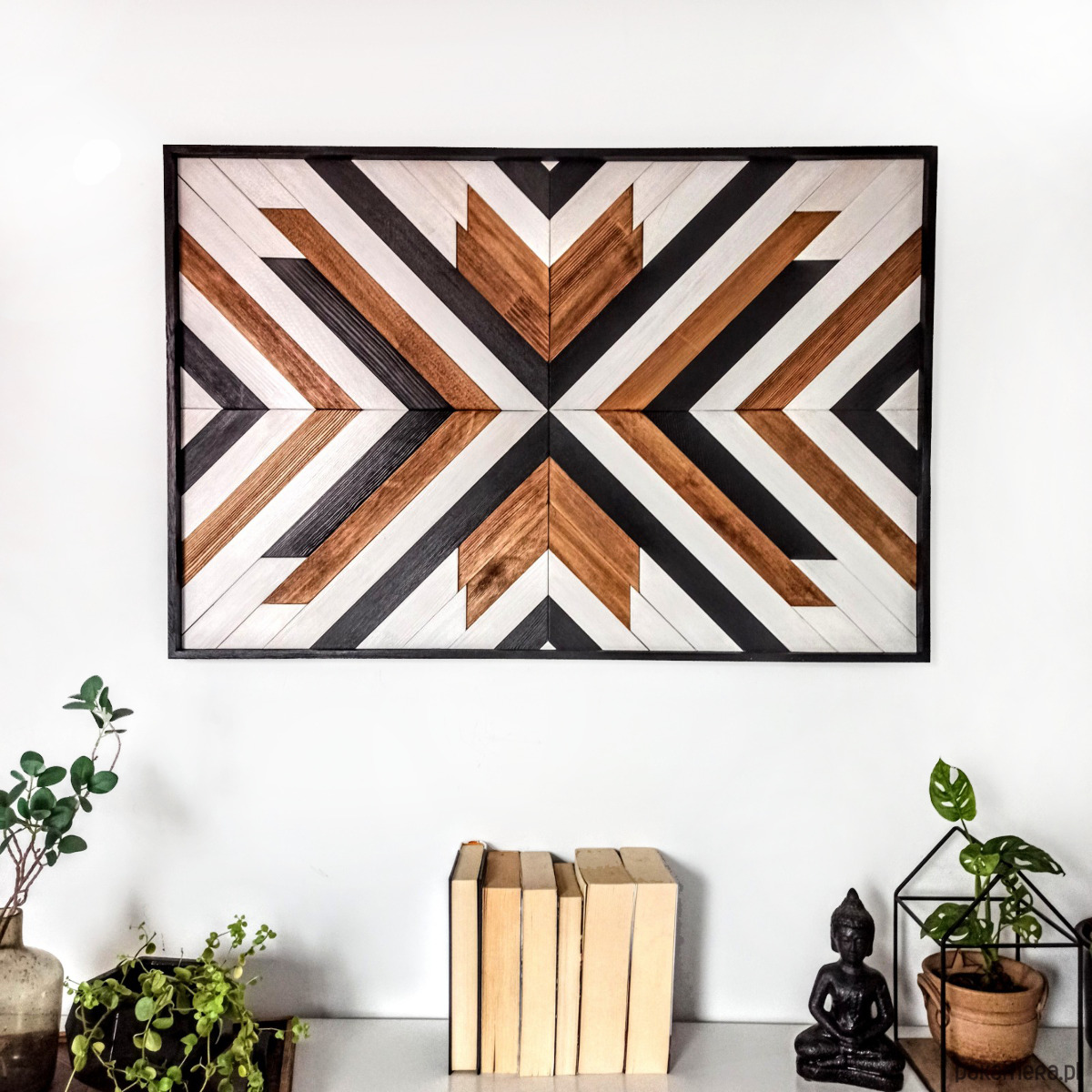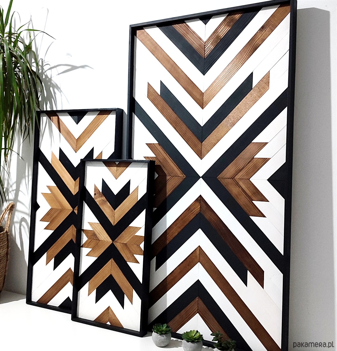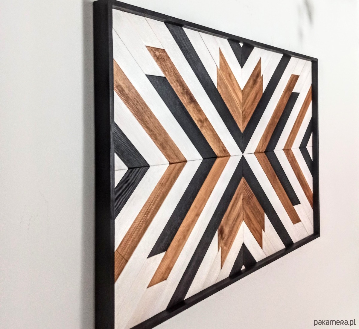 Inspiracja boho chic i geometrią. Obraz w całości wykonany z litego drewna pokryty bejcą podkreślającą słoje z dodatkiem koloru czarnego i białego.