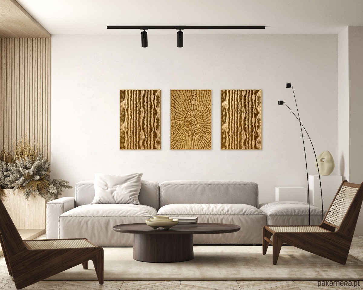 Unikalny wzór na całej powierzchni pozwala na płynne łączenie paneli i tworzenie różnorodnych kompozycji. Możesz aranżować je w układy takie jak tryptyk 3×1 lub 3×2, a także pokrywać większe powierzchnie ścian, tworząc instalacje 6×6, 6×9 czy 9×9. To idealna dekoracja ścienna do salonu, sypialni lub nowoczesnych przestrzeni.