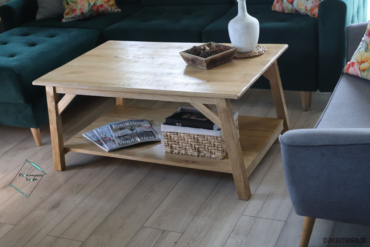 Solidny blat zapewnia dużo miejsca na filiżanki kawy, książki czy dekoracje, a praktyczna dolna półka to doskonałe rozwiązanie do przechowywania magazynów, pilotów lub koszyków z drobiazgami. Stolik jest stabilny i wytrzymały, co gwarantuje jego długowieczność.