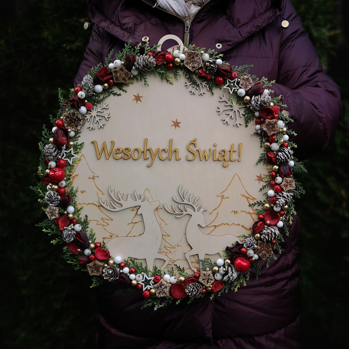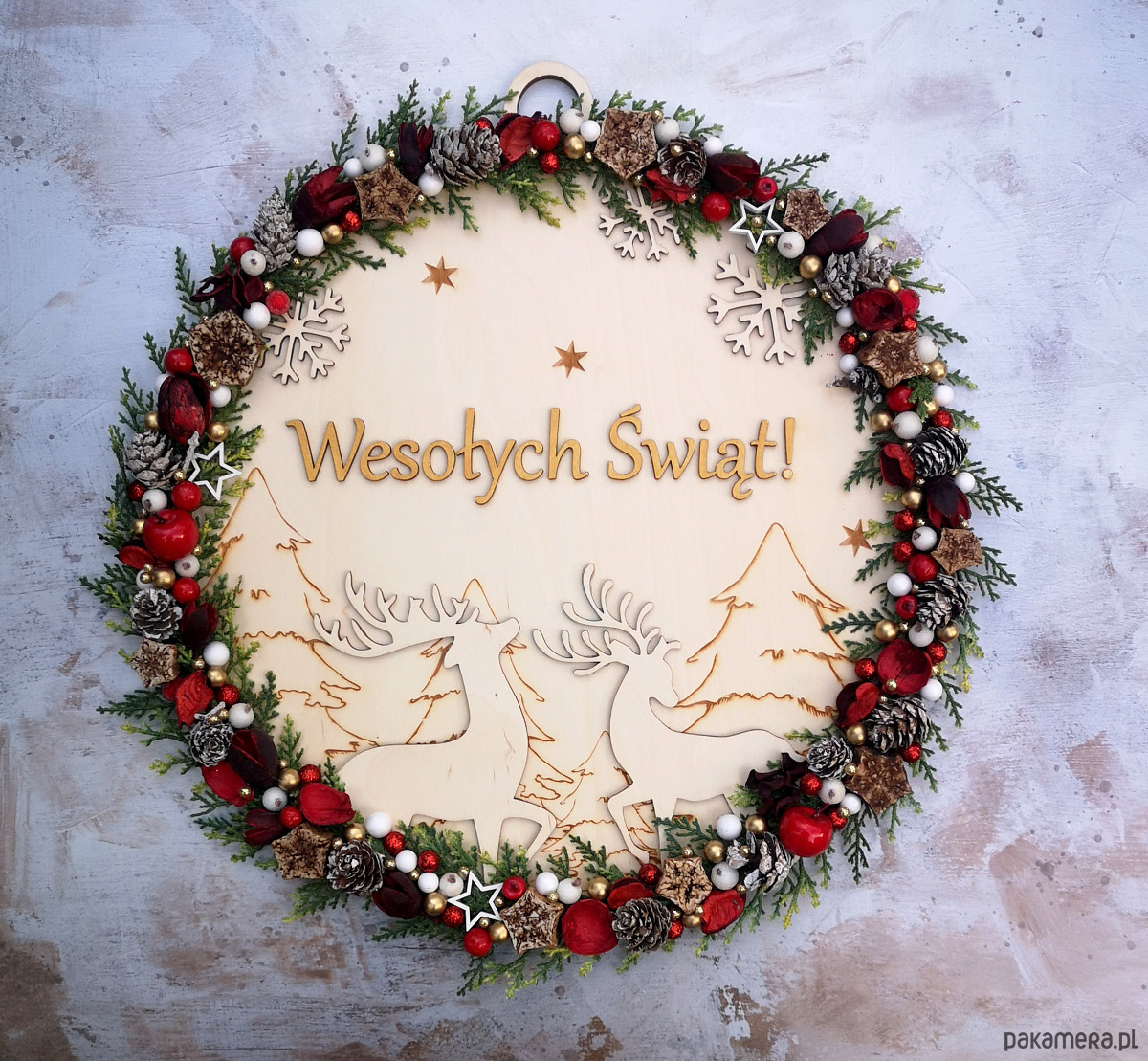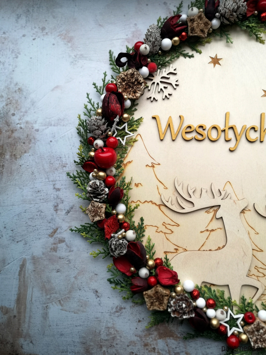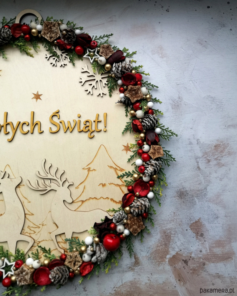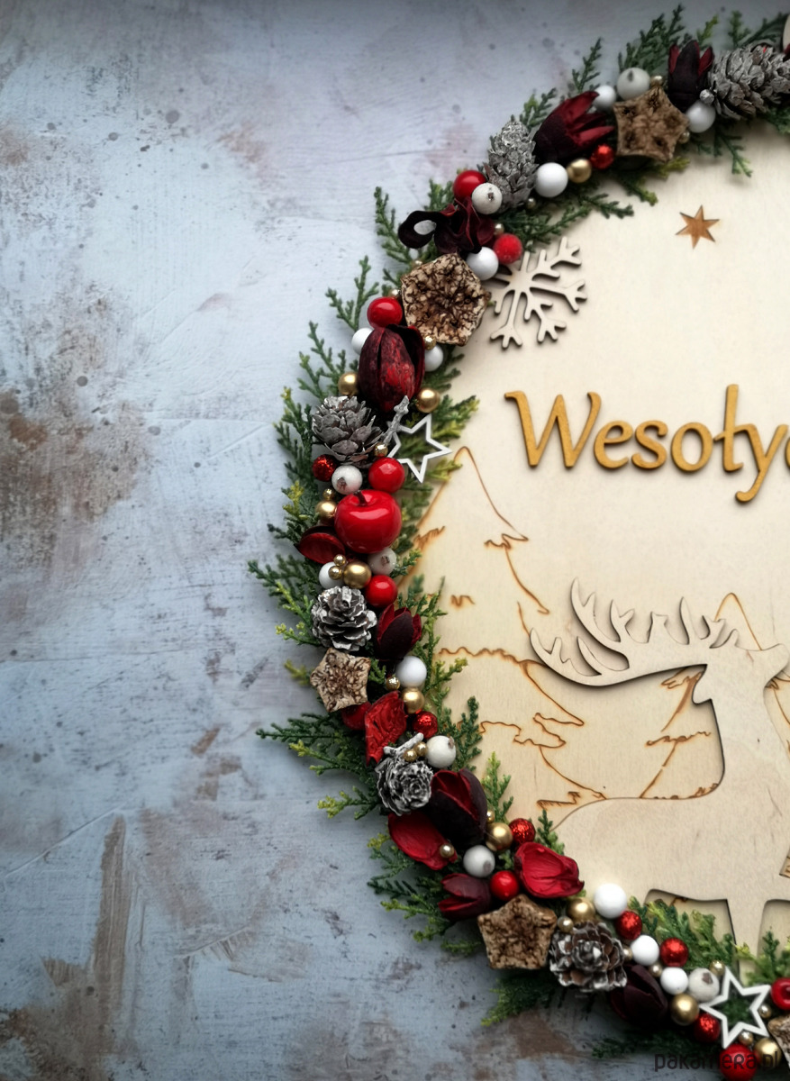 Unikalny, drewniany wianek świąteczny to połączenie naturalnego drewna, precyzyjnego graweru z motywem reniferów i lasu oraz bogatej dekoracji w tradycyjnych barwach – czerwieni, bieli, złota i zieleni.