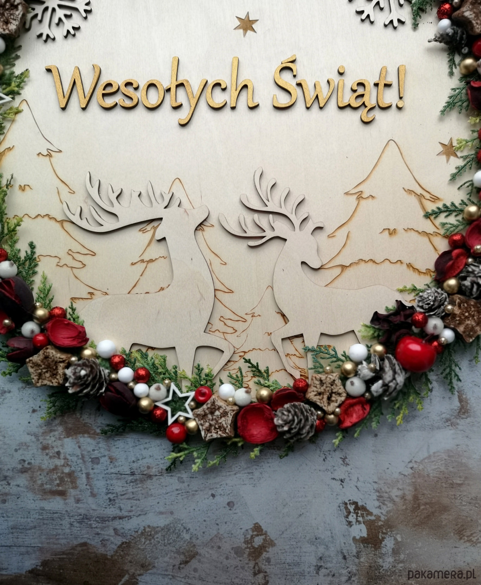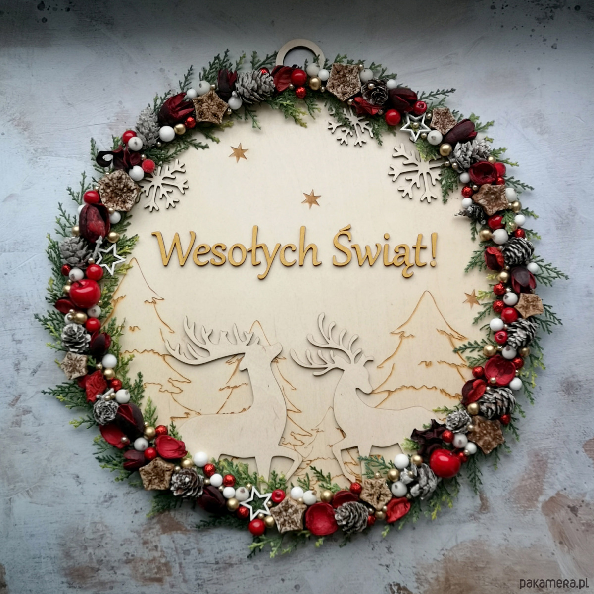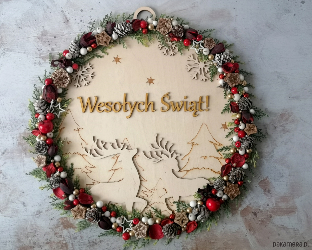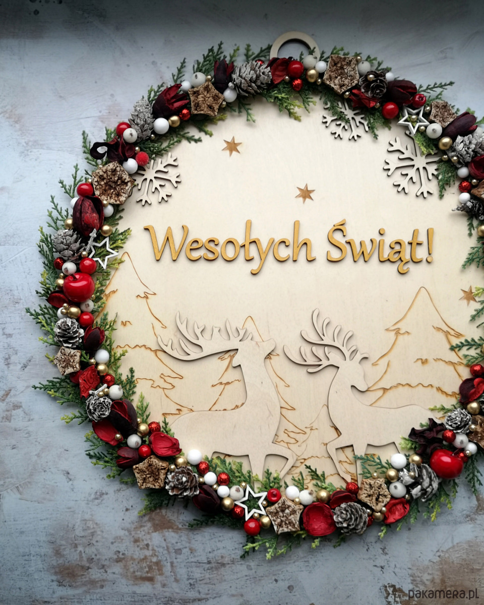 Unikalny, drewniany wianek świąteczny to połączenie naturalnego drewna, precyzyjnego graweru z motywem reniferów i lasu oraz bogatej dekoracji w tradycyjnych barwach – czerwieni, bieli, złota i zieleni.
