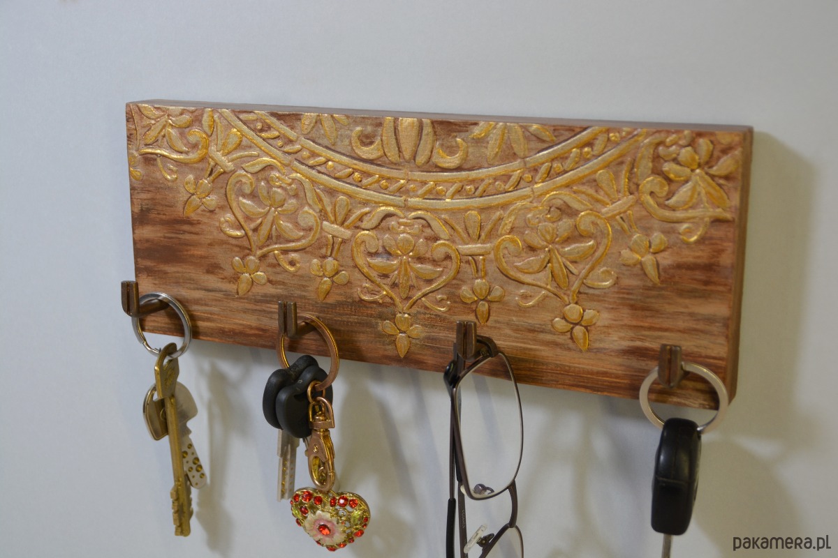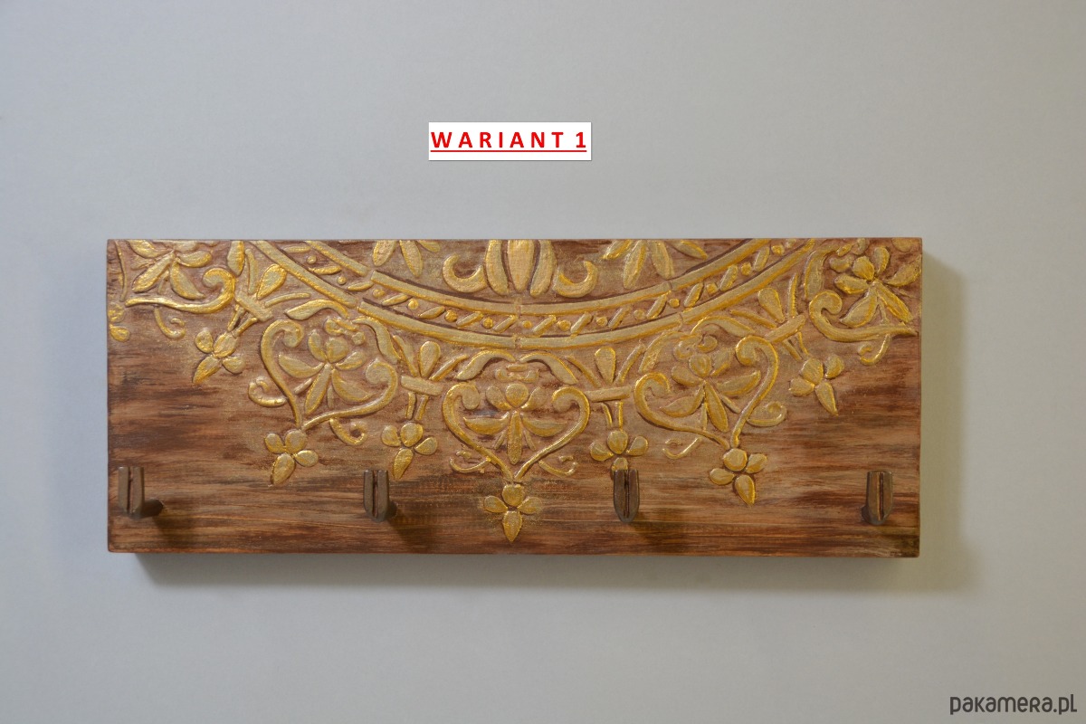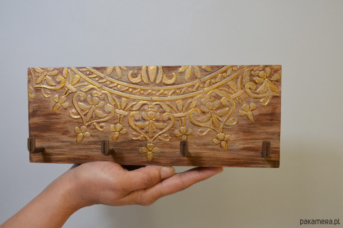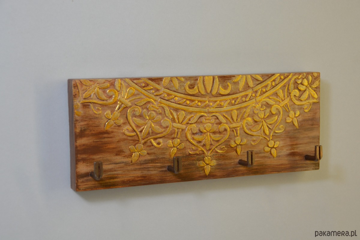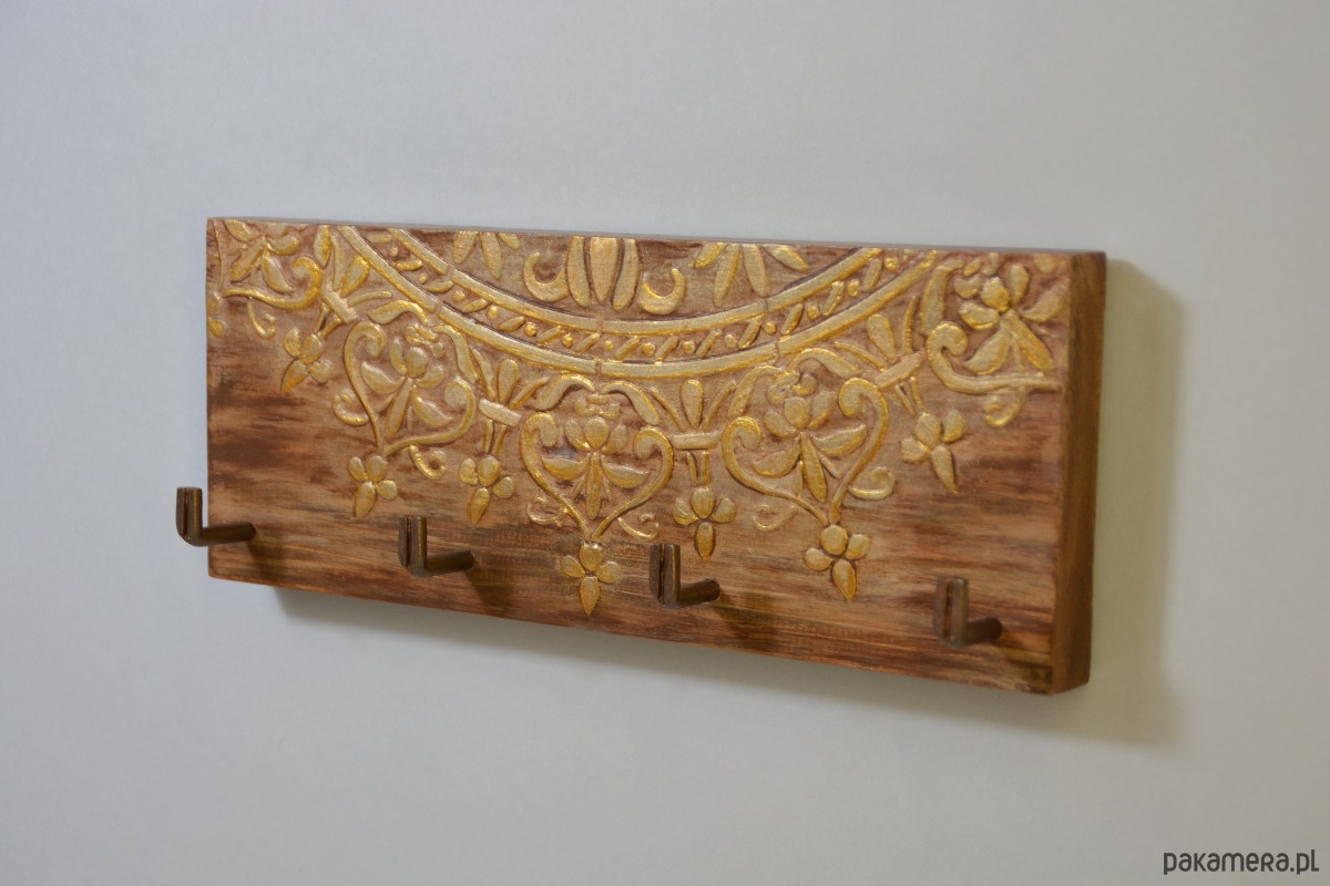 Drewniany wieszak na klucze w stylu rustykalnym: wzór mandali, 4 haczyki
