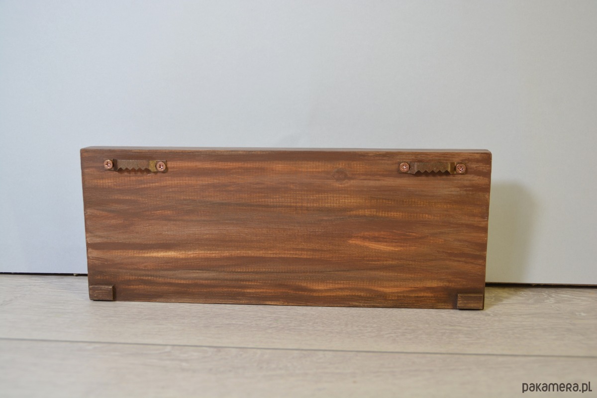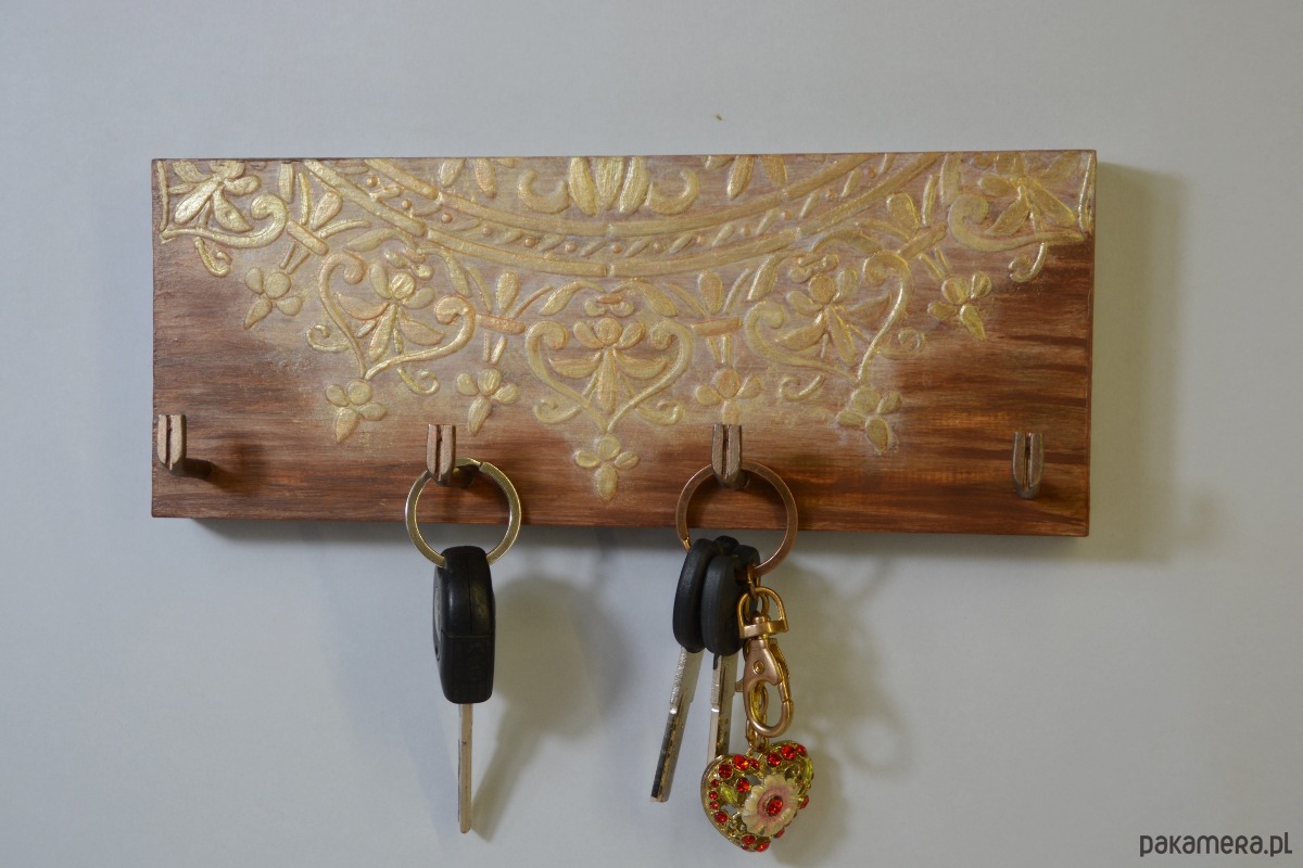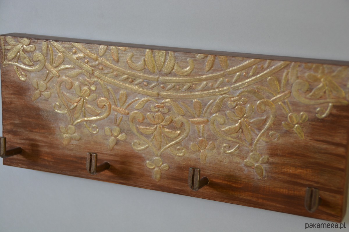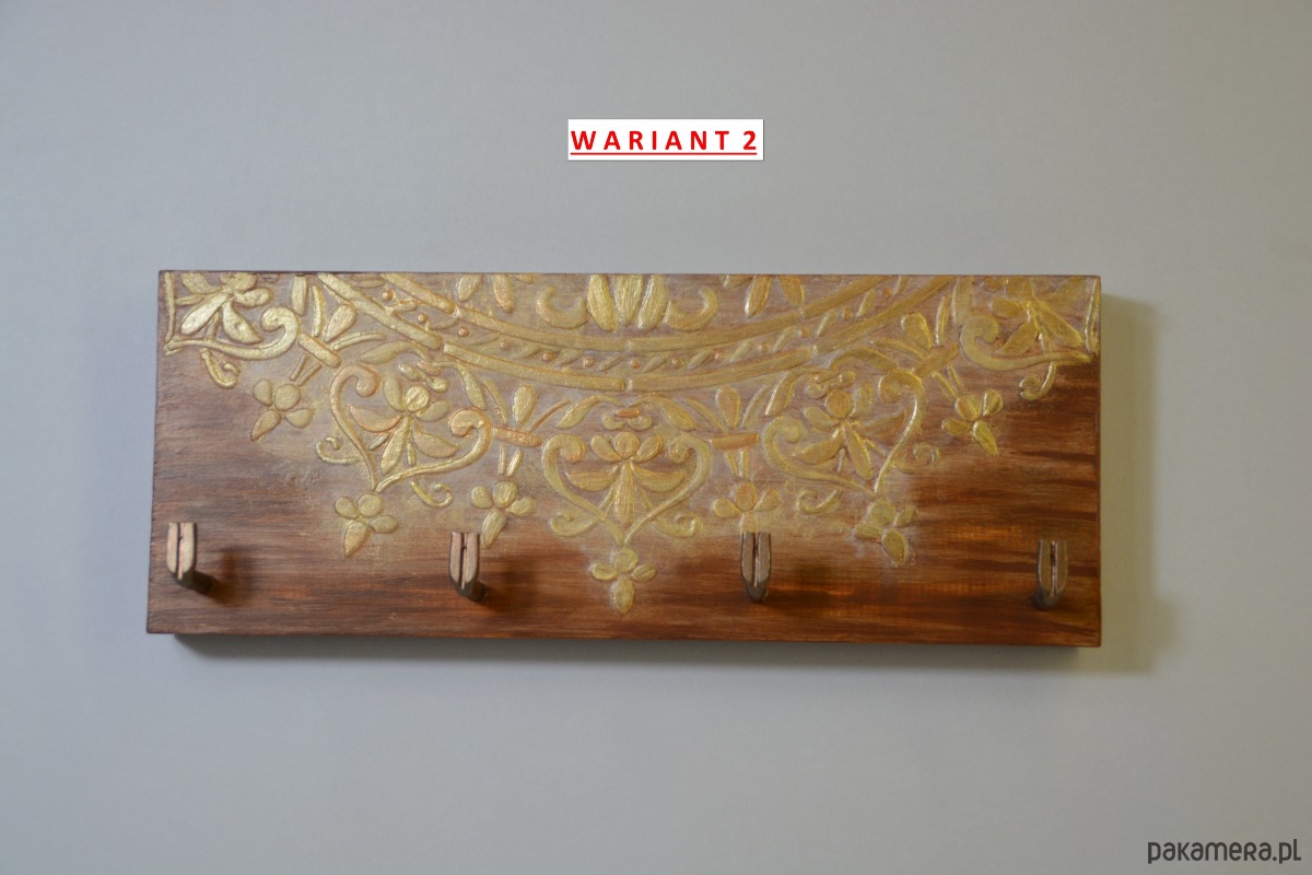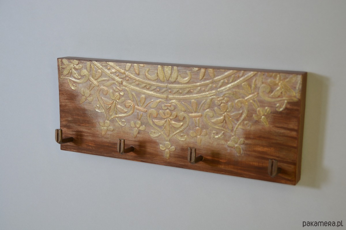 Wieszak jest ręcznie wykonany z drewna sosnowego. Posiada piękny, szablonowy wzór. Wzór wykonany jest z pasty drzewnej, która jest malowana i barwiona farbami akrylowymi, a następnie pokryta lakierem ochronnym. Wypukły wzór jest barwiony, co tworzy olśniewający kontrast z drewnem. Brelok posiada 4 haczyki, idealne do przechowywania kluczy i innych rzeczy. Tylna część breloka posiada zapięcia, które umożliwiają łatwy montaż na ścianie.