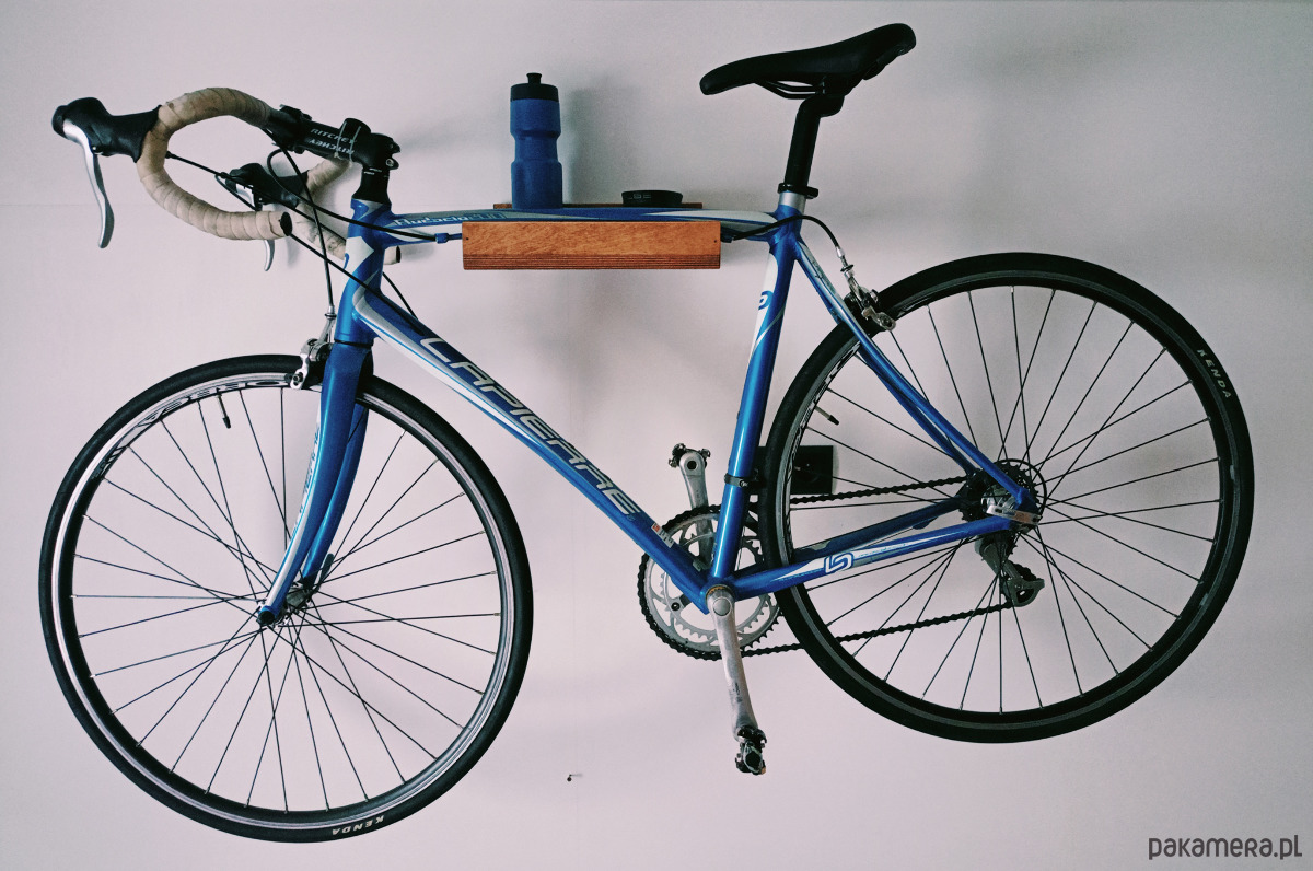 Drewniany wieszak na rower z funkcją półki na kwiaty
