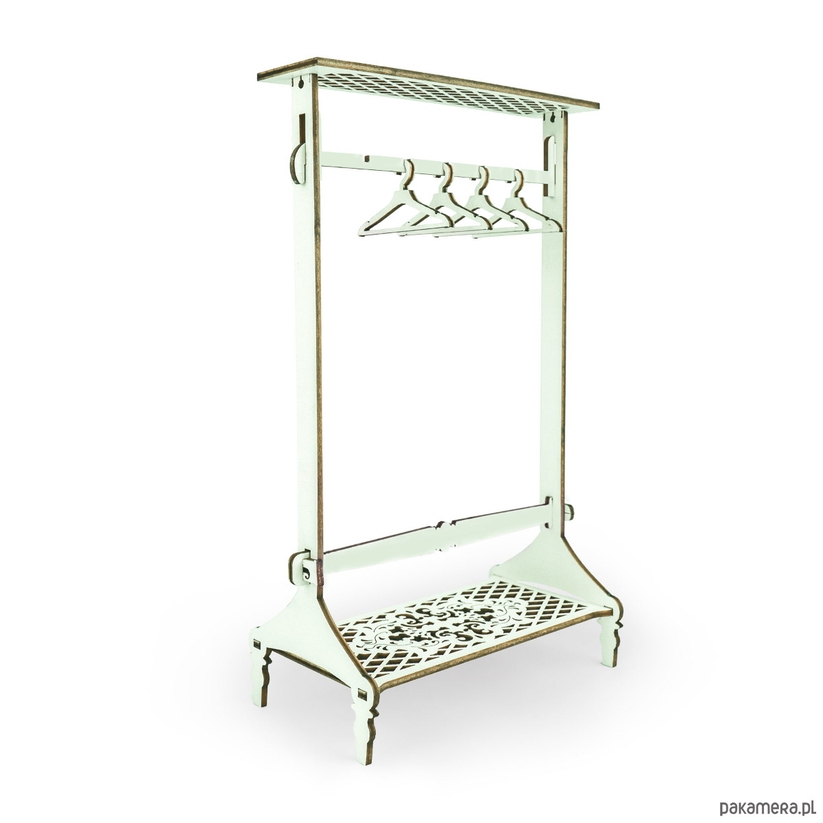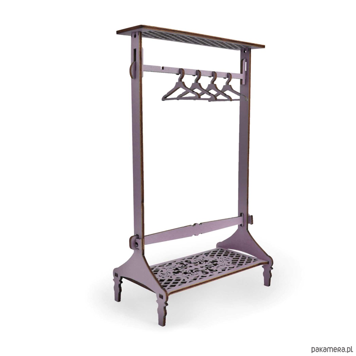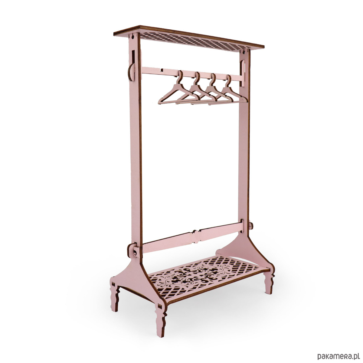 Realistycznie odwzorowany wieszak dla lalek jest dodatkowym wyposażeniem sypialni domku dla lalek. Zestaw składa się z ażurowego stojaka na ubrania oraz czterech małych wieszaków, które można zawiesić na poprzecznym elemencie.