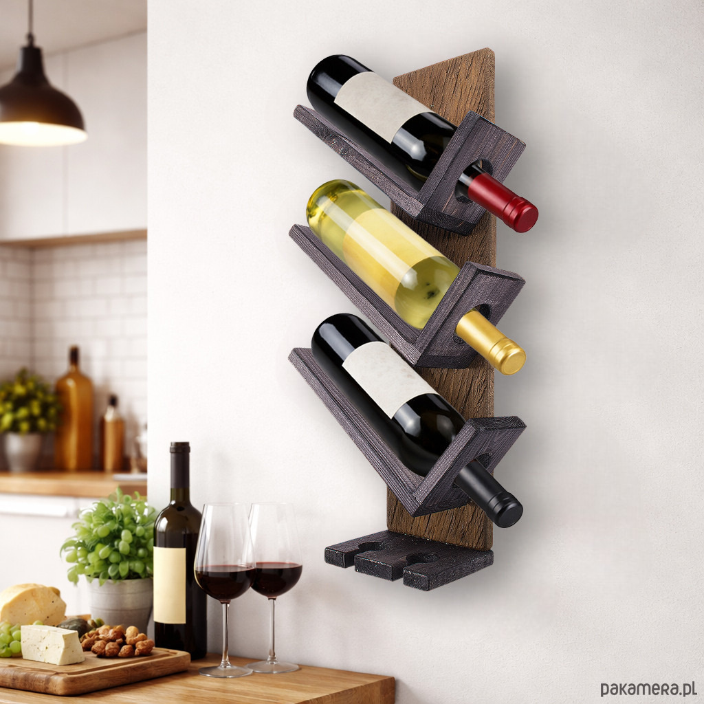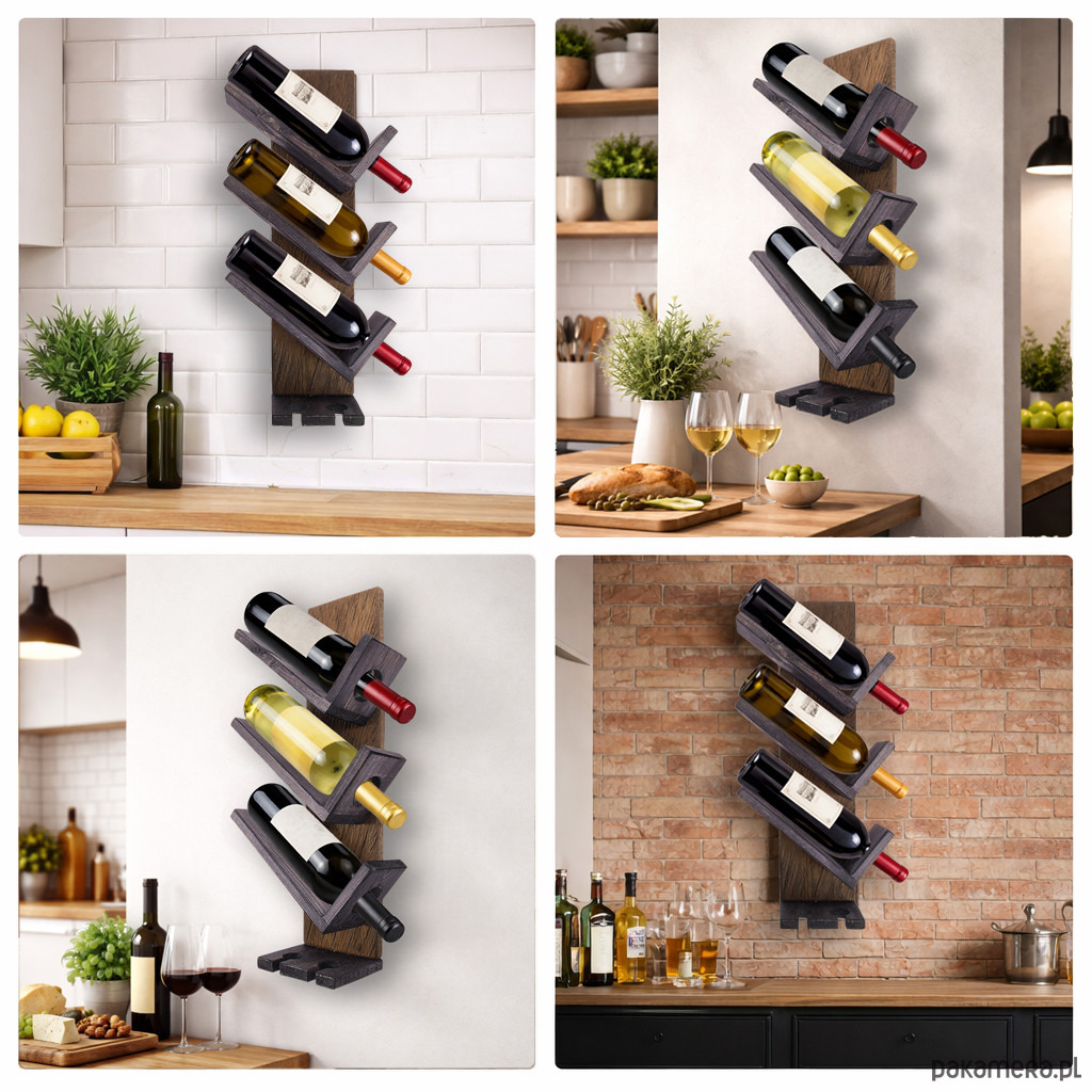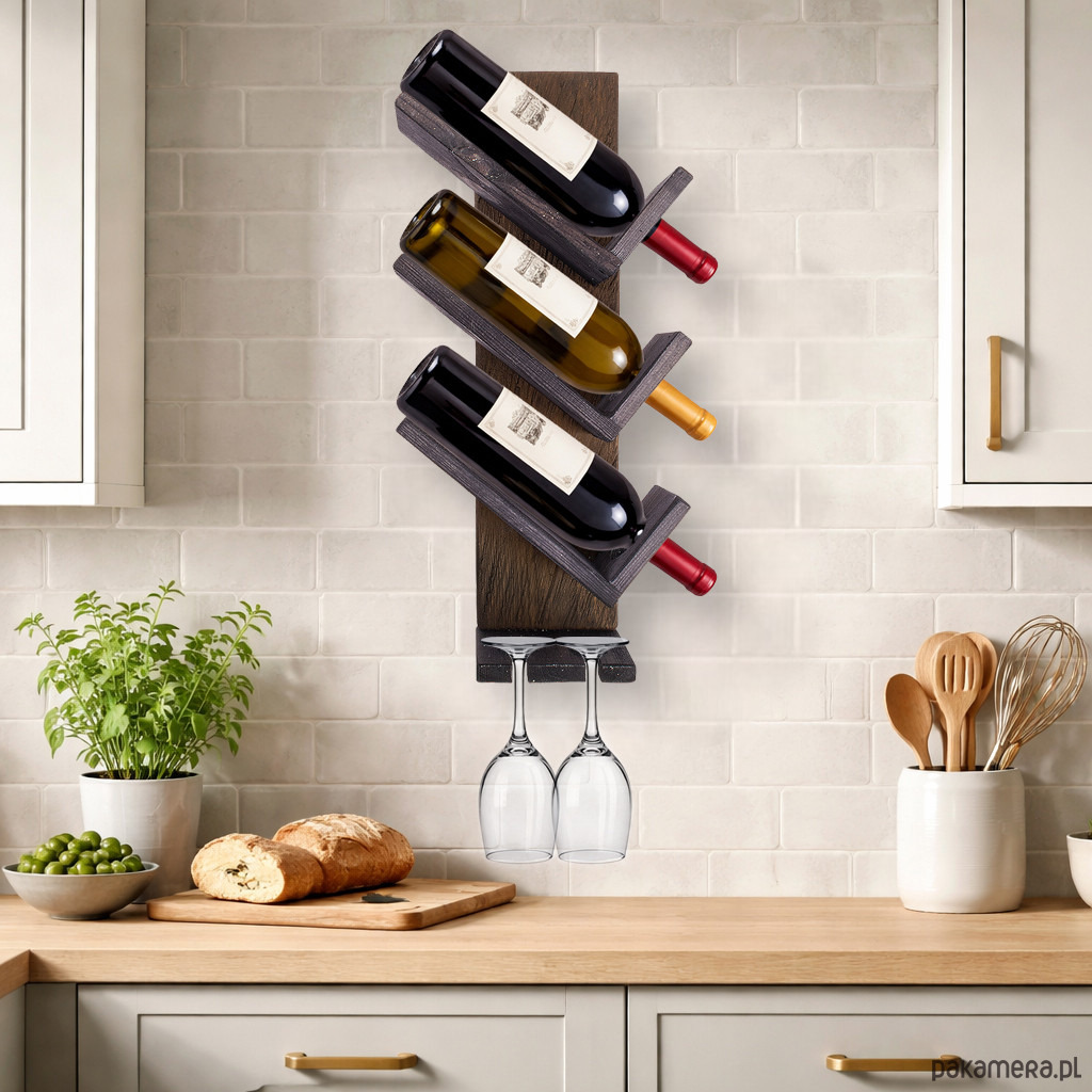 Wieszak oferuje miejsce na 3 butelki wina oraz 2 kieliszki. Butelki ułożone są pod kątem, co wpływa na estetyczną prezentację i nadaje całości elegancki, uporządkowany wygląd. Taka forma ekspozycji dobrze wpisuje się w aranżacje rustykalne, klasyczne, loftowe i vintage.