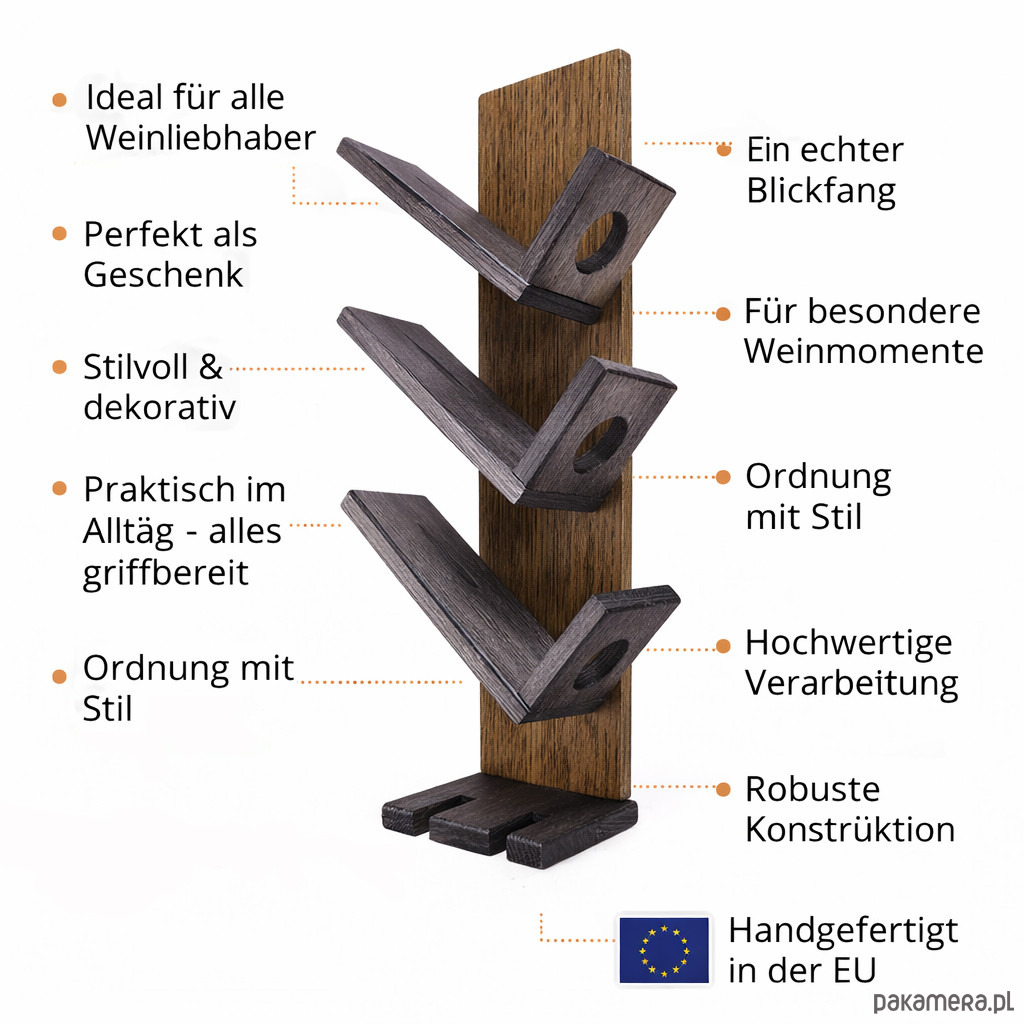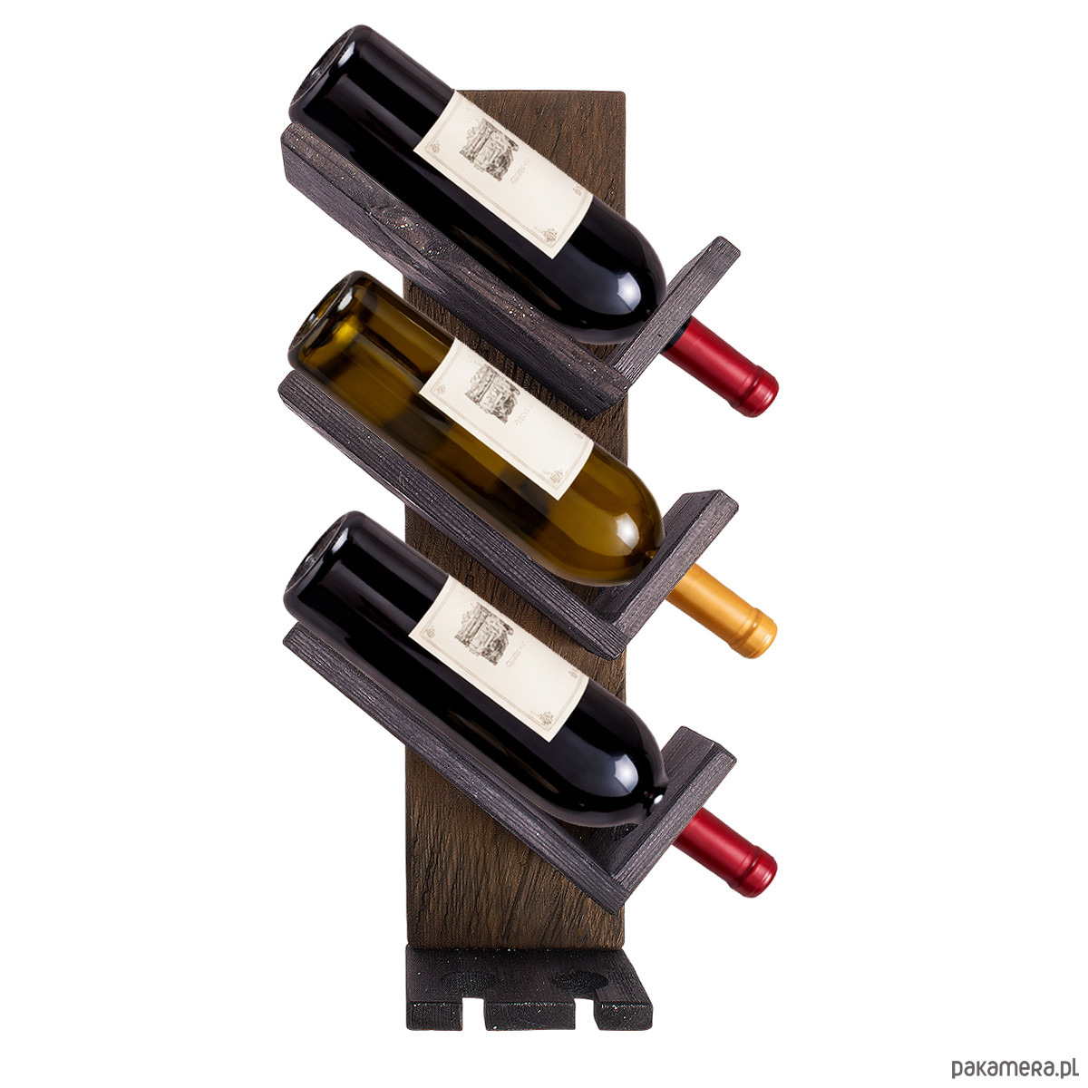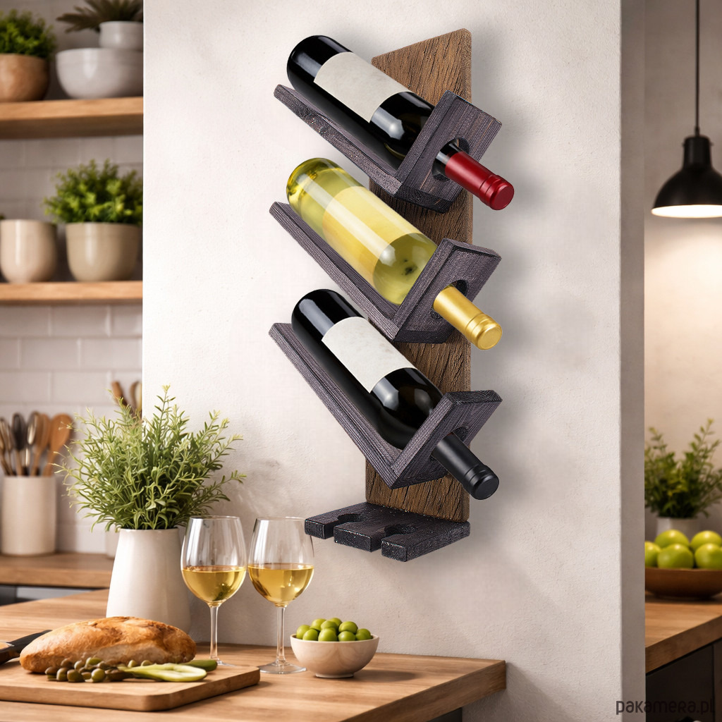 Wieszak oferuje miejsce na 3 butelki wina oraz 2 kieliszki. Butelki ułożone są pod kątem, co wpływa na estetyczną prezentację i nadaje całości elegancki, uporządkowany wygląd. Taka forma ekspozycji dobrze wpisuje się w aranżacje rustykalne, klasyczne, loftowe i vintage.