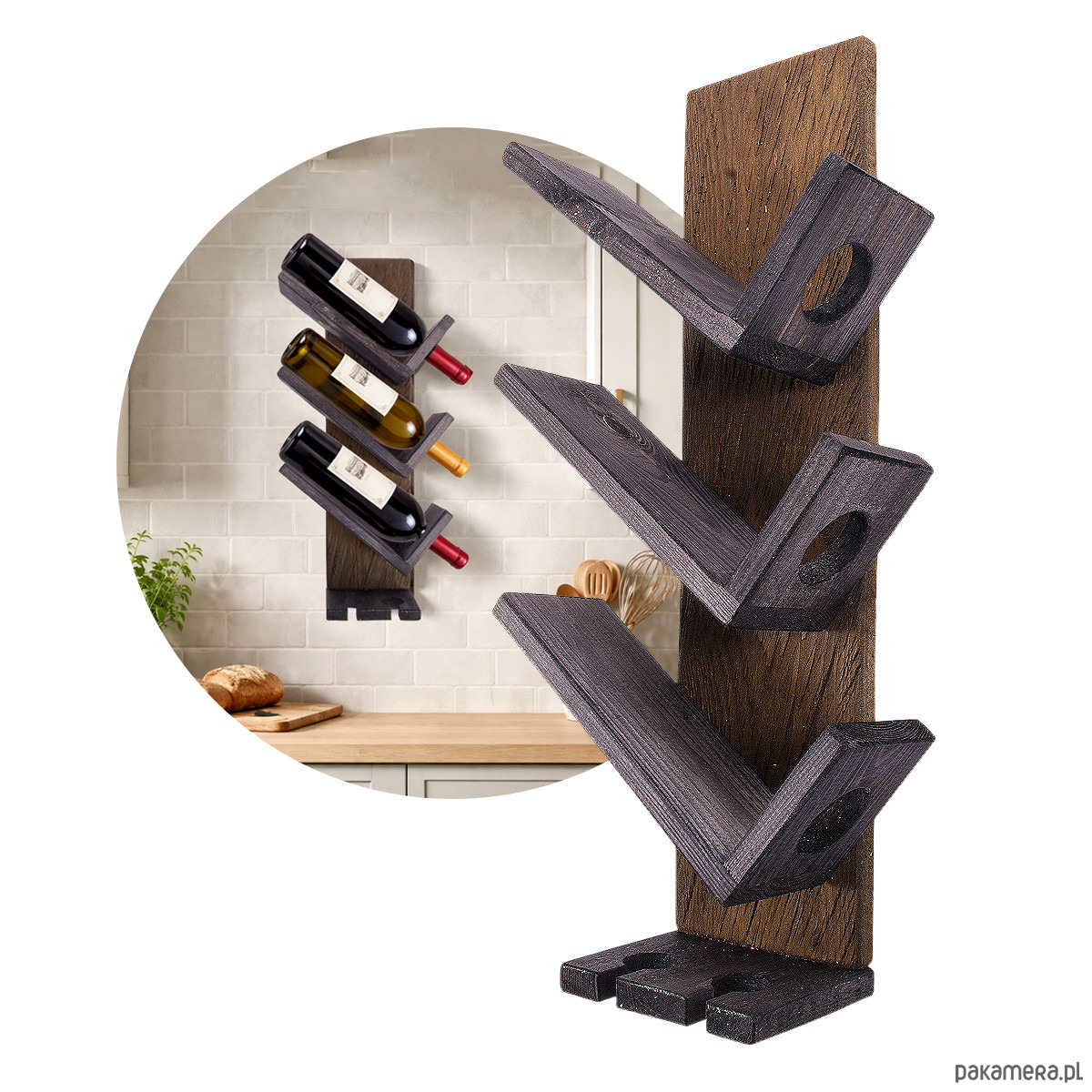 Stylowy drewniany wieszak ścienny na wino w wersji lewej. Pomieści 3 butelki wina i 2 kieliszki, łącząc praktyczne przechowywanie z dekoracyjnym stylem vintage retro.