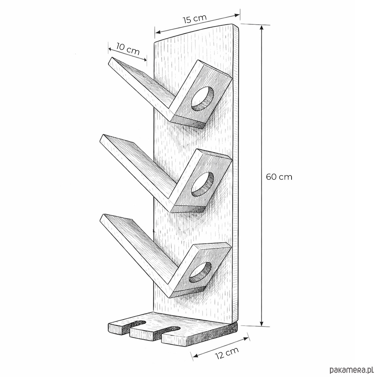 Produkt wykonano z drewna sosnowego, które nadaje mu naturalny charakter i solidny wygląd. Brązowe wykończenie podkreśla strukturę drewna i sprawia, że wieszak staje się nie tylko praktycznym organizerem, ale również dekoracją ściany.