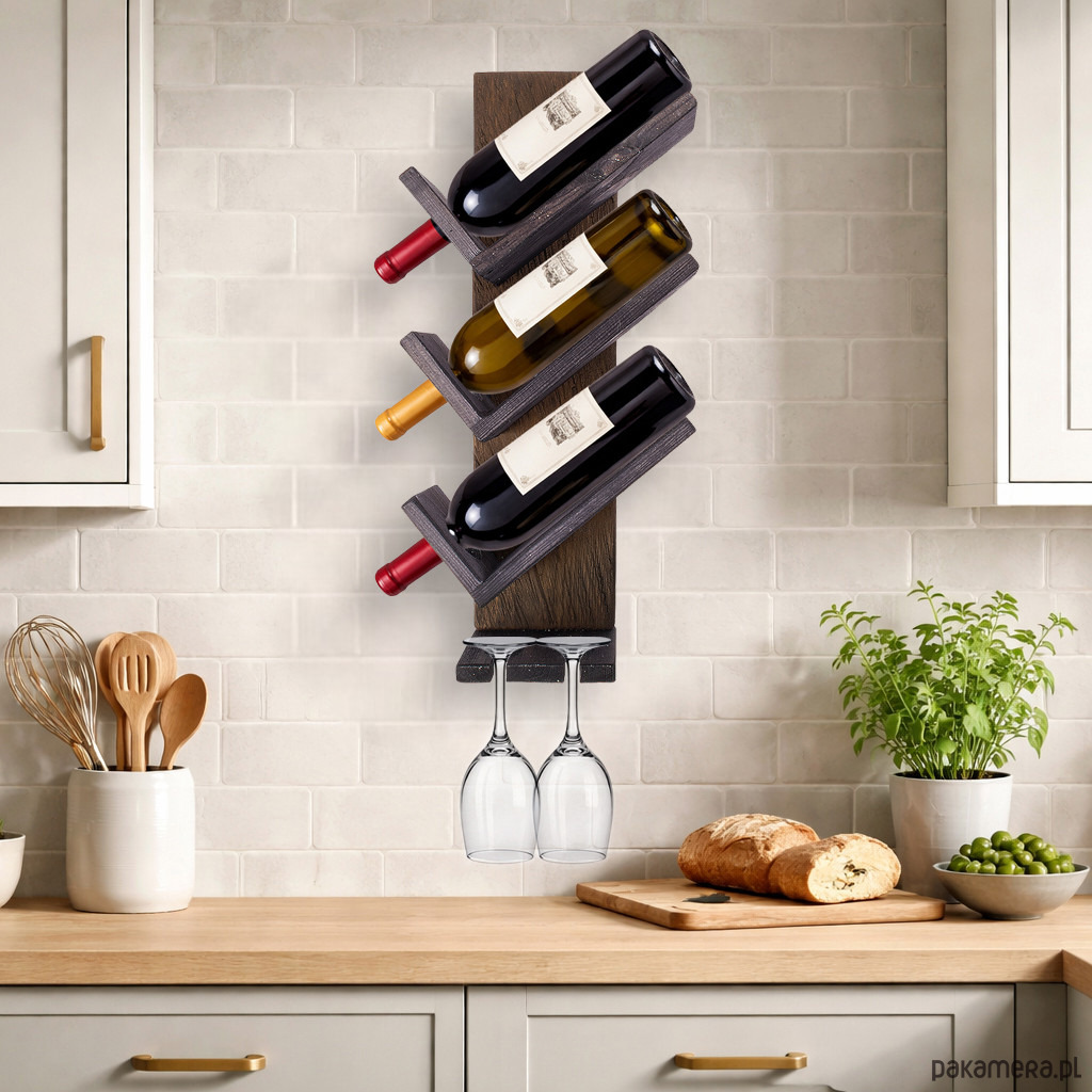 Wieszak oferuje miejsce na 3 butelki wina oraz 2 kieliszki. Butelki ułożone są pod kątem, co wpływa na estetyczną prezentację i nadaje całości elegancki, uporządkowany wygląd. Taka forma ekspozycji dobrze wpisuje się w aranżacje rustykalne, klasyczne, loftowe i vintage.