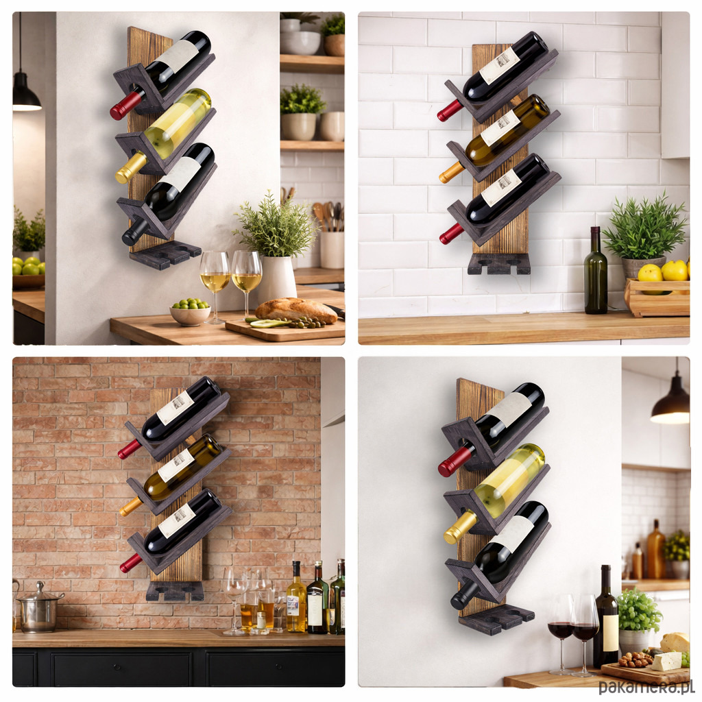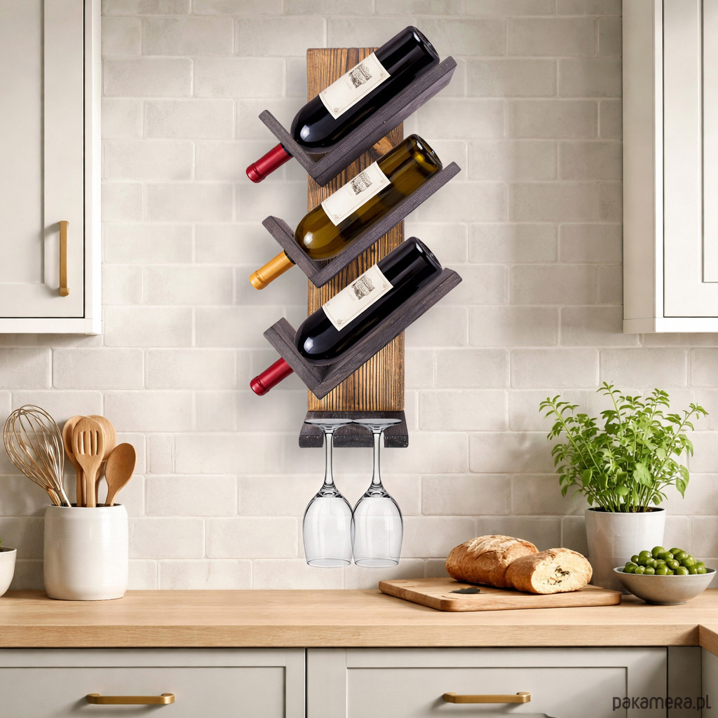 Wieszak oferuje miejsce na 3 butelki wina oraz 2 kieliszki. Butelki ułożone są pod kątem, co wpływa na estetyczną prezentację i nadaje całości elegancki, uporządkowany wygląd. Taka forma ekspozycji dobrze wpisuje się w aranżacje rustykalne, klasyczne, loftowe i vintage.