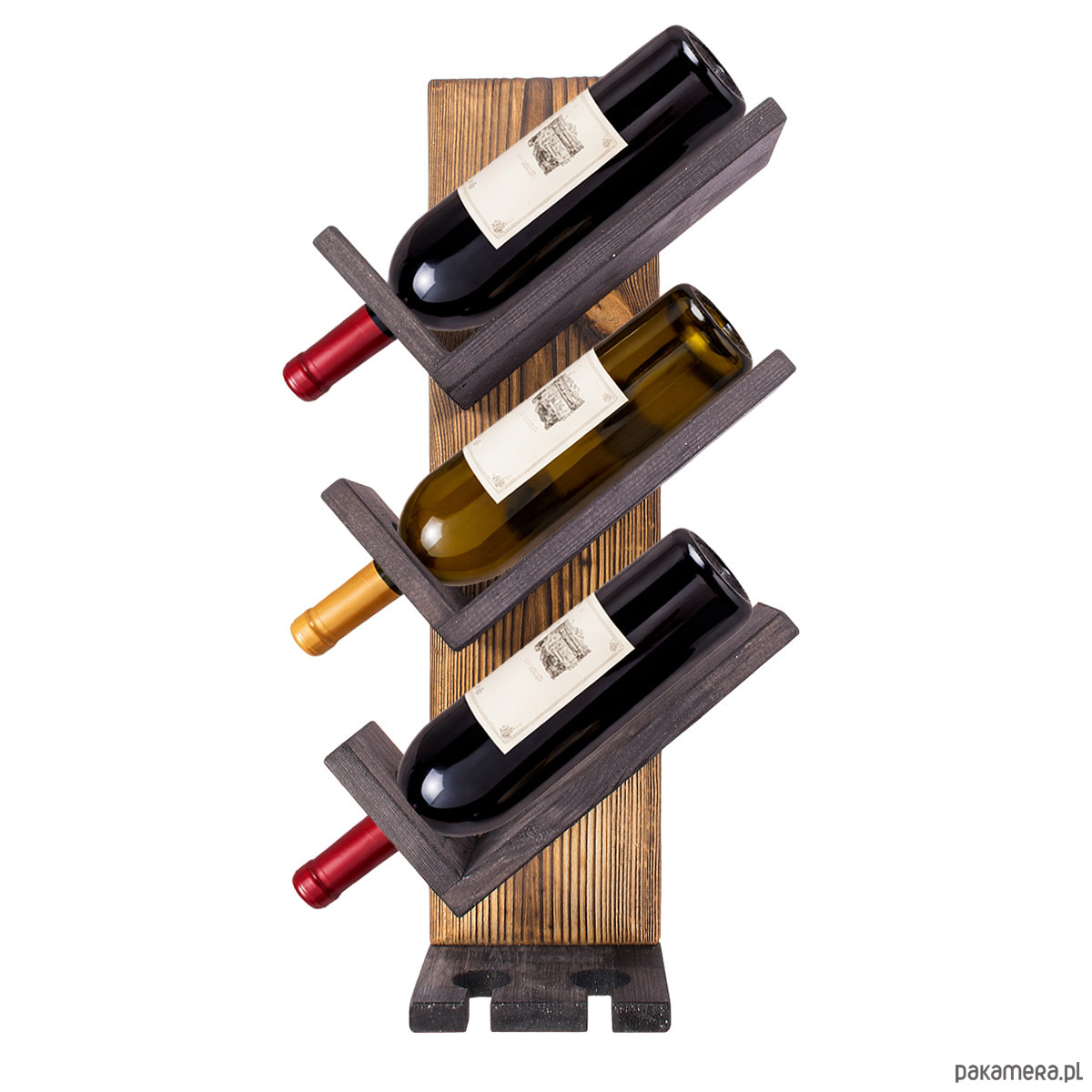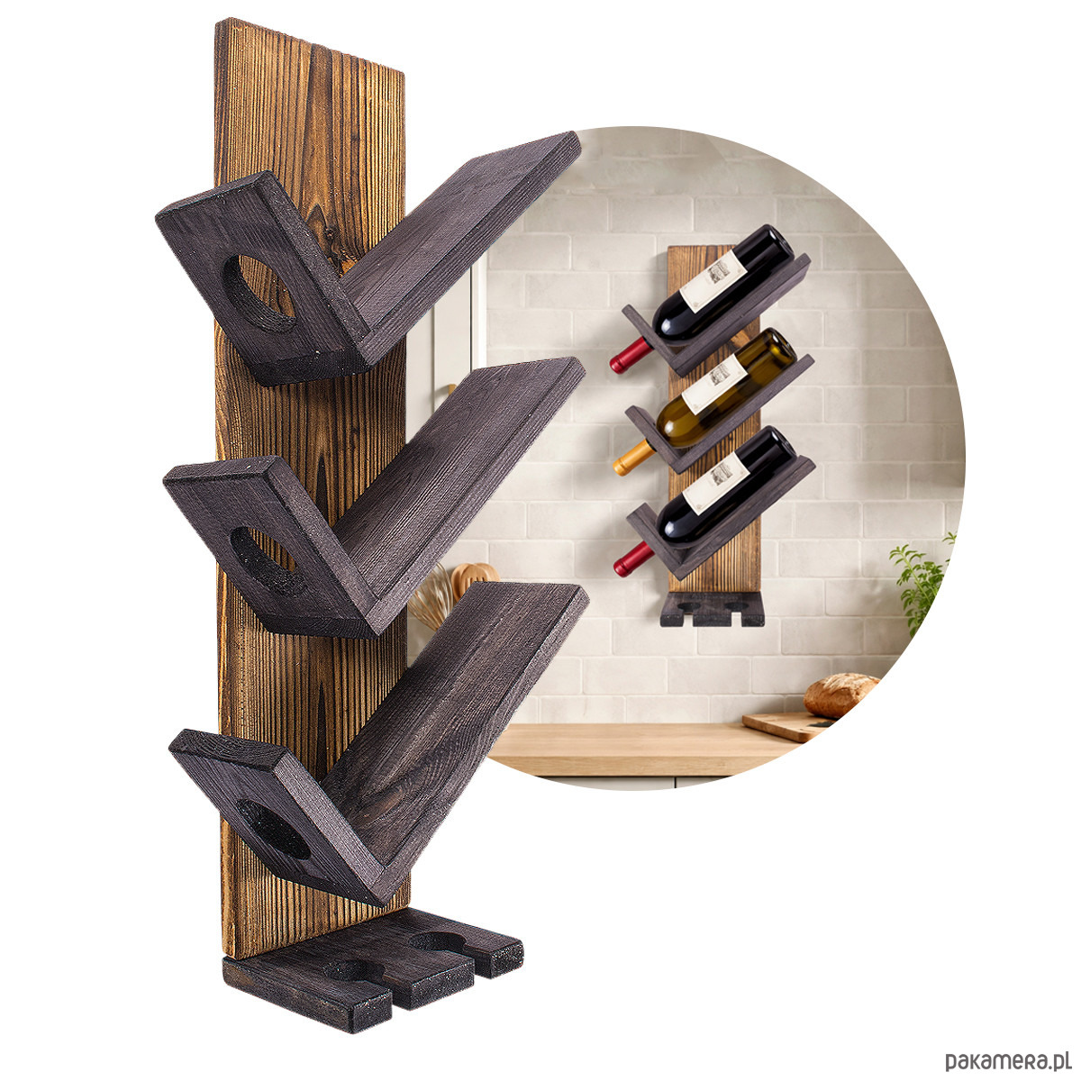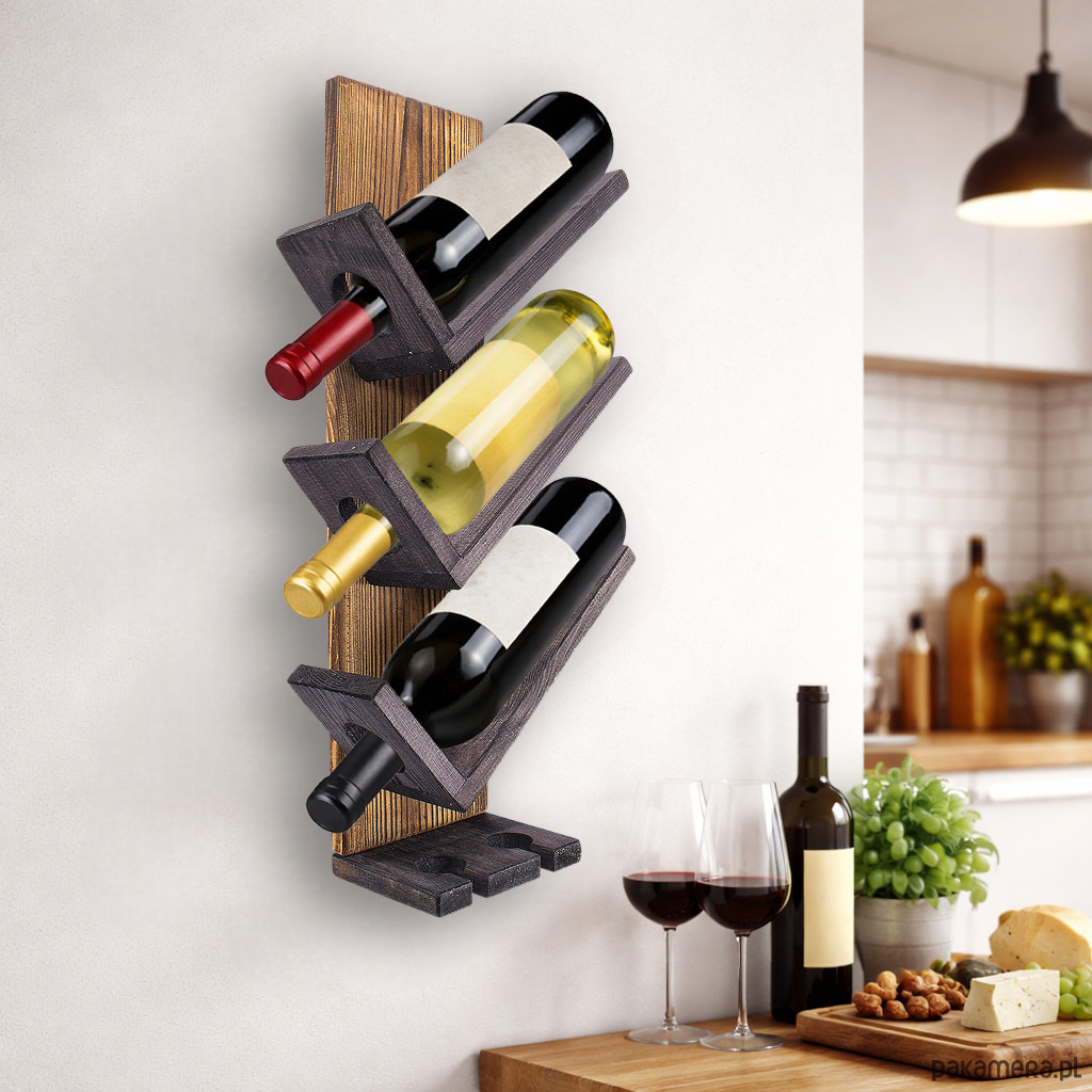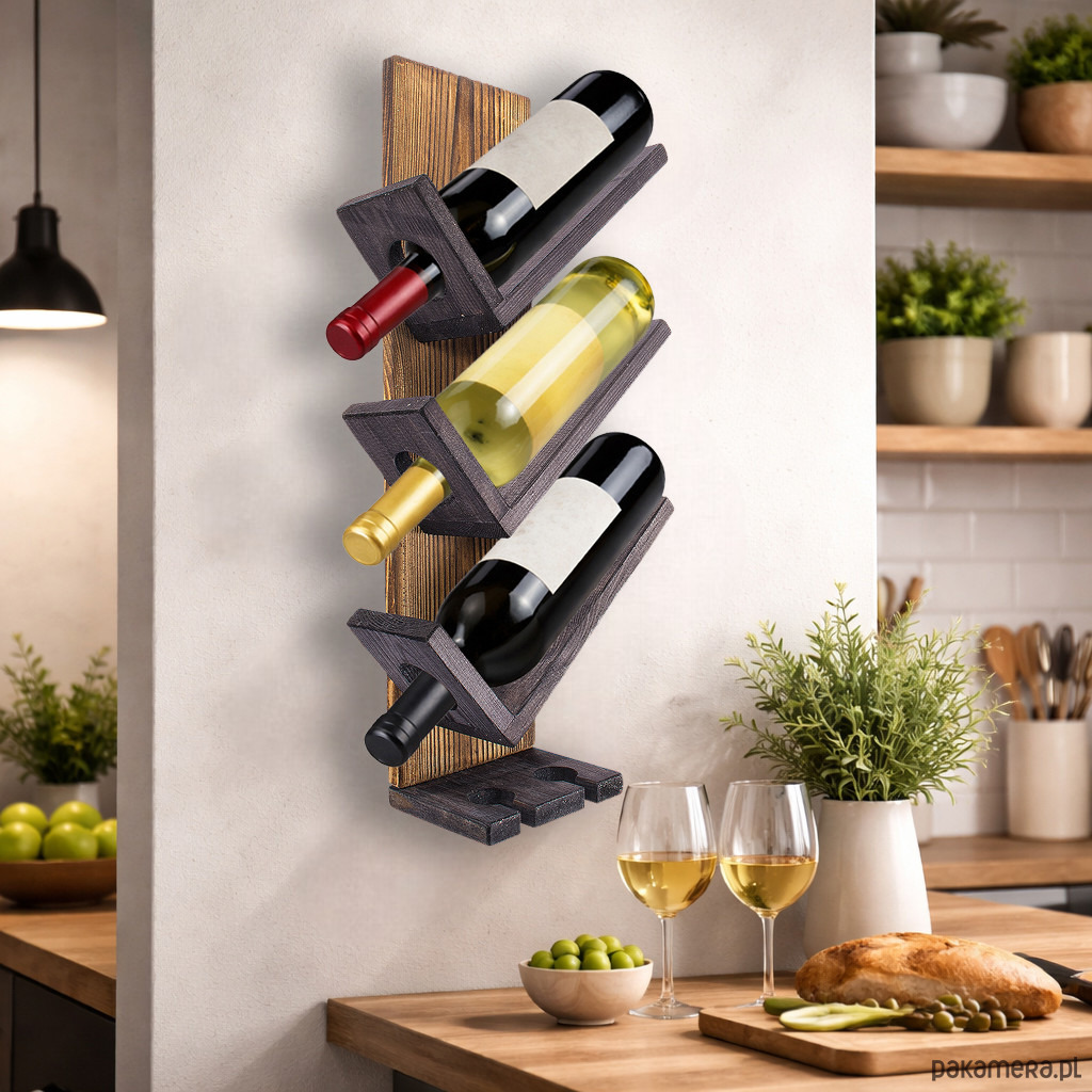 Stylowy drewniany wieszak ścienny na wino w wersji prawej. Pomieści 3 butelki wina i 2 kieliszki, łącząc praktyczne przechowywanie z dekoracyjnym stylem vintage retro.