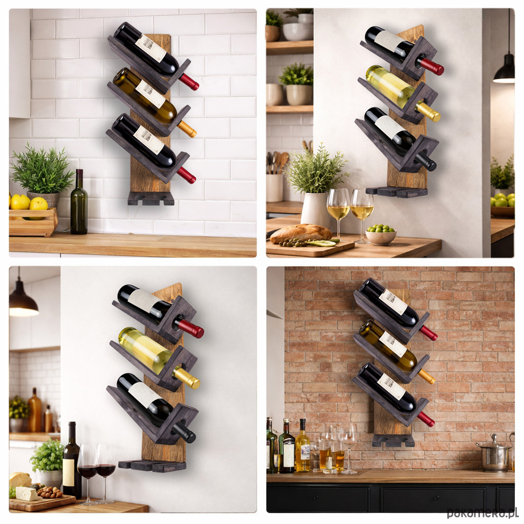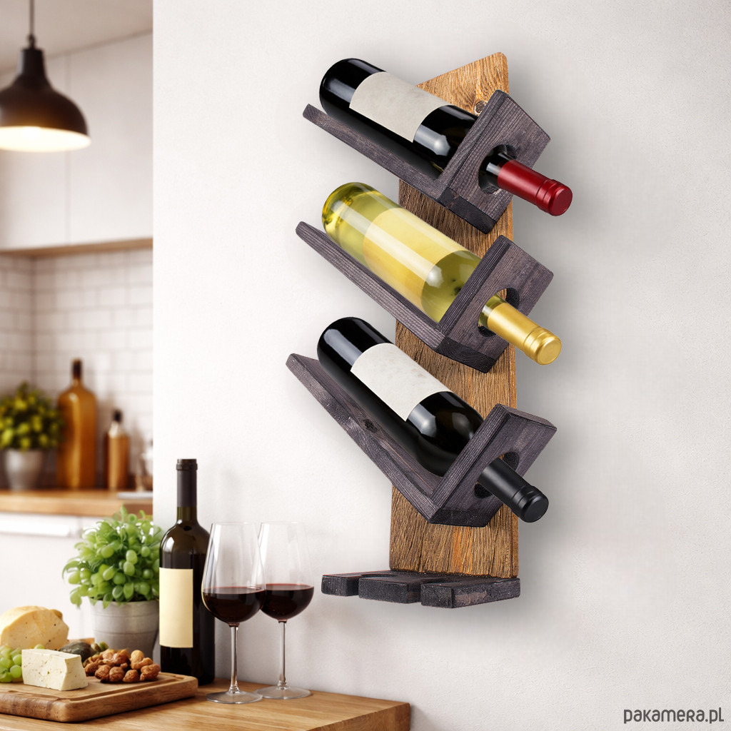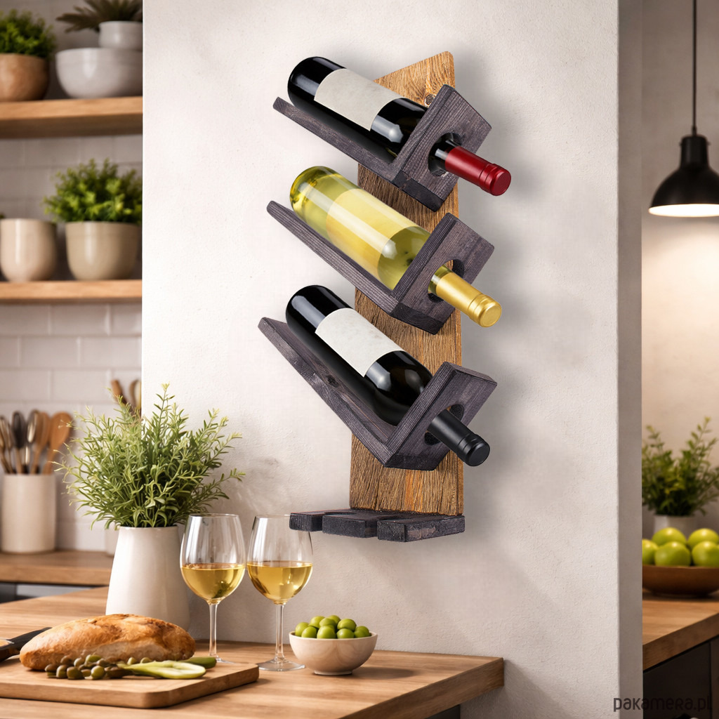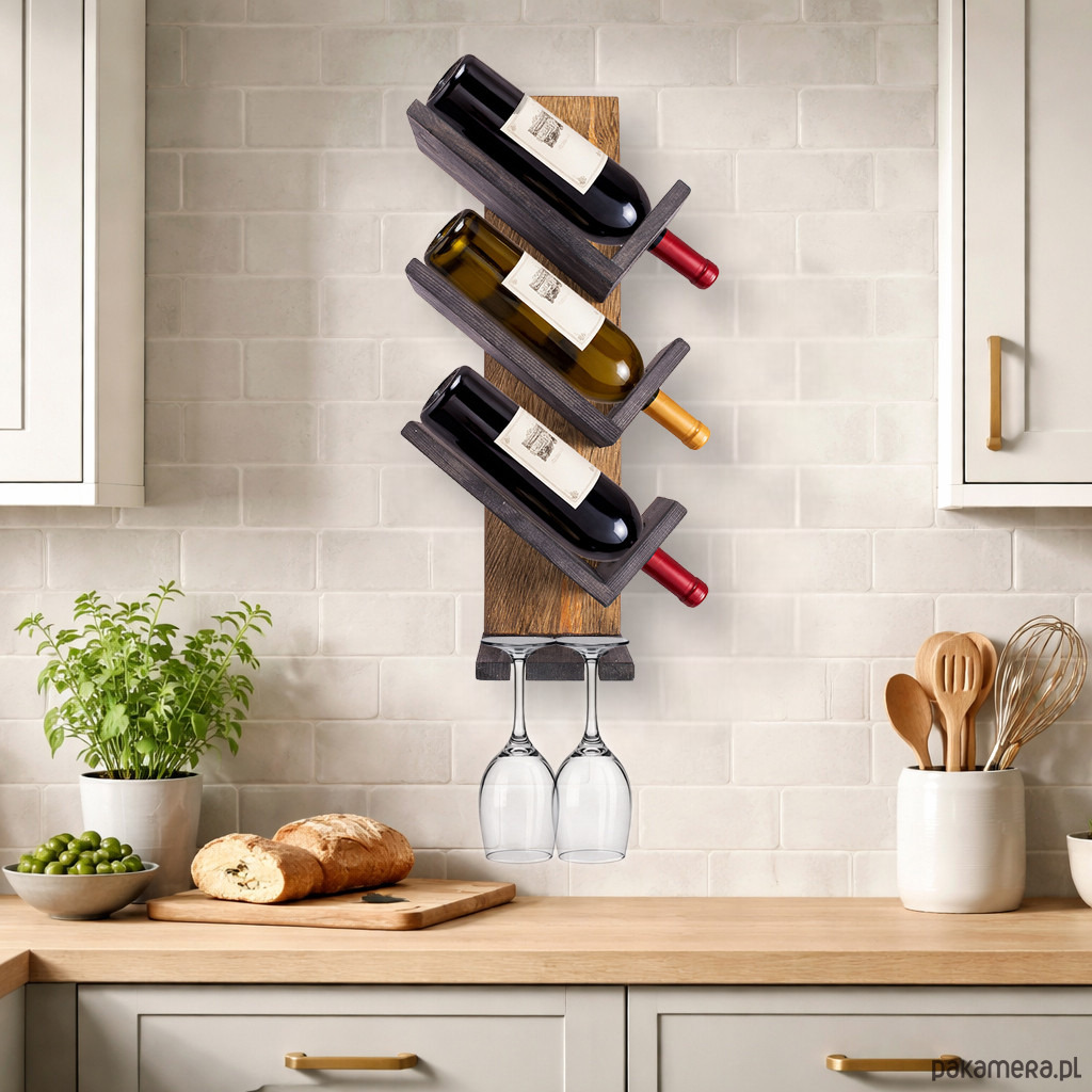 Wieszak oferuje miejsce na 3 butelki wina oraz 2 kieliszki. Butelki ułożone są pod kątem, co wpływa na estetyczną prezentację i nadaje całości elegancki, uporządkowany wygląd. Taka forma ekspozycji dobrze wpisuje się w aranżacje rustykalne, klasyczne, loftowe i vintage.
